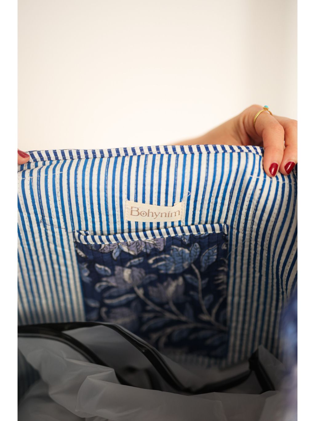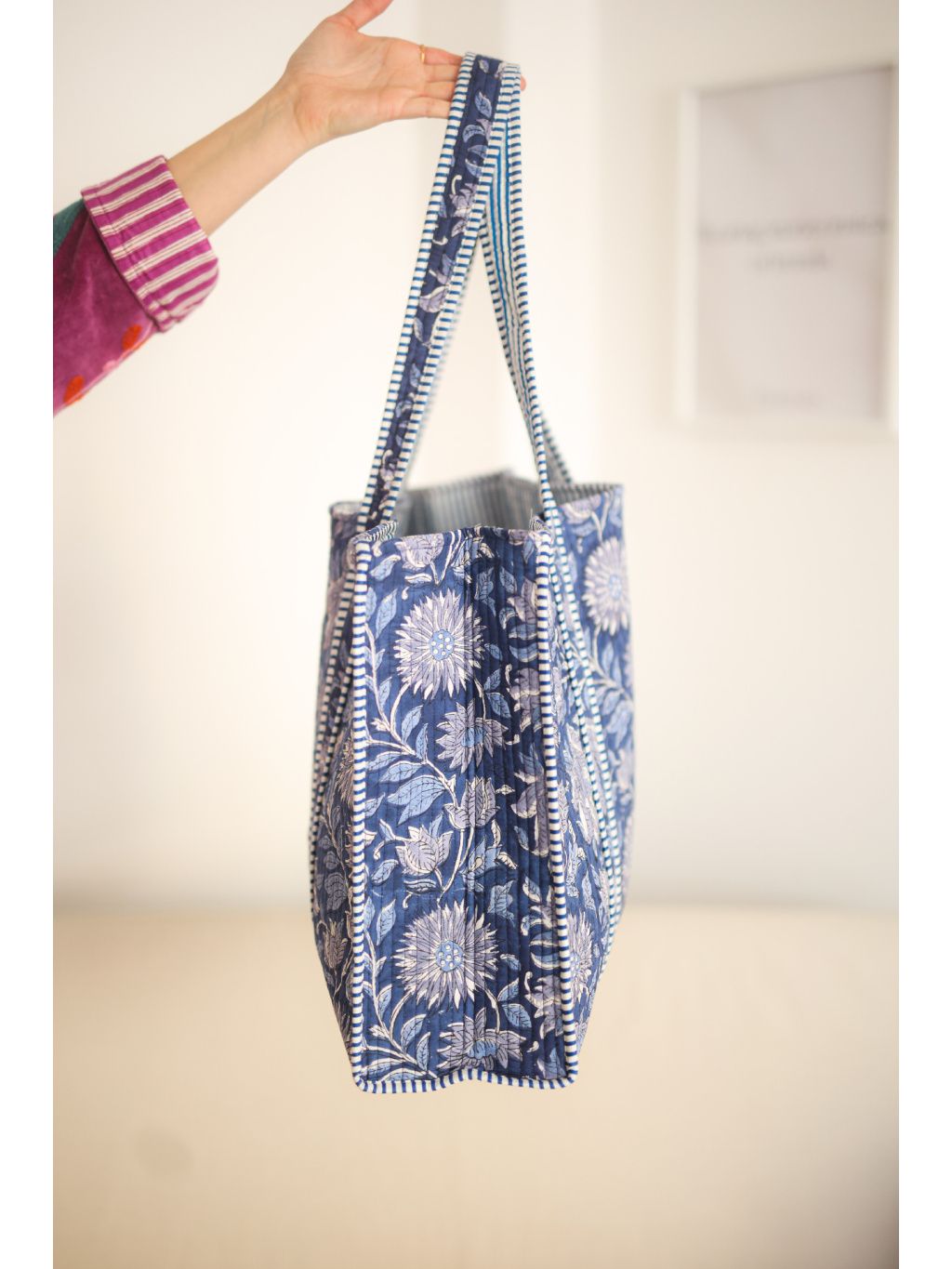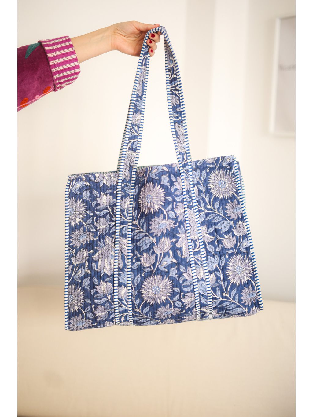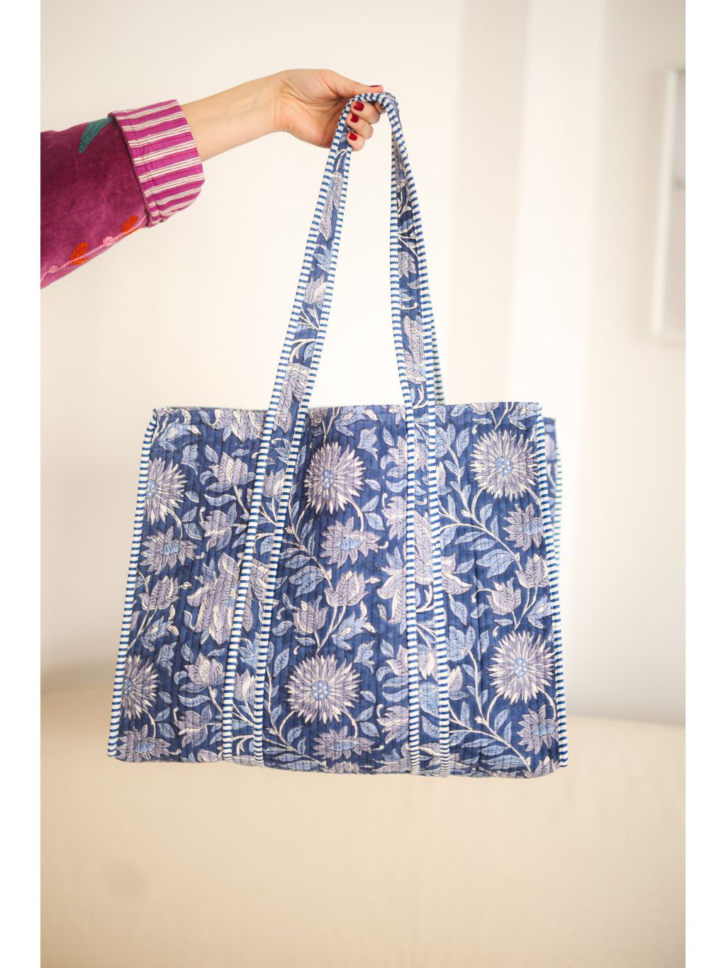 Prostorná prošívaná víkendová taška v námořnické modré s květinovým vzorem.