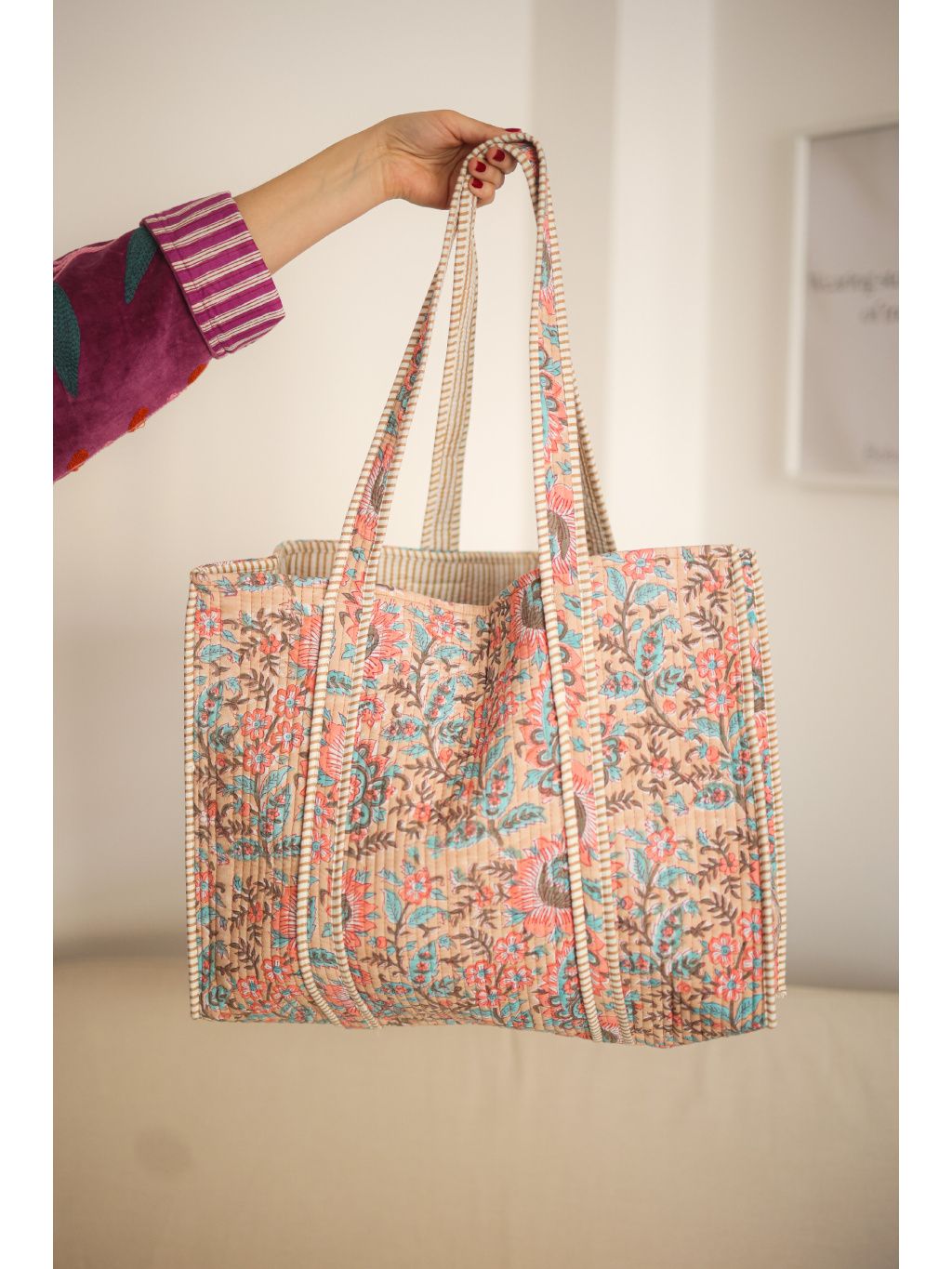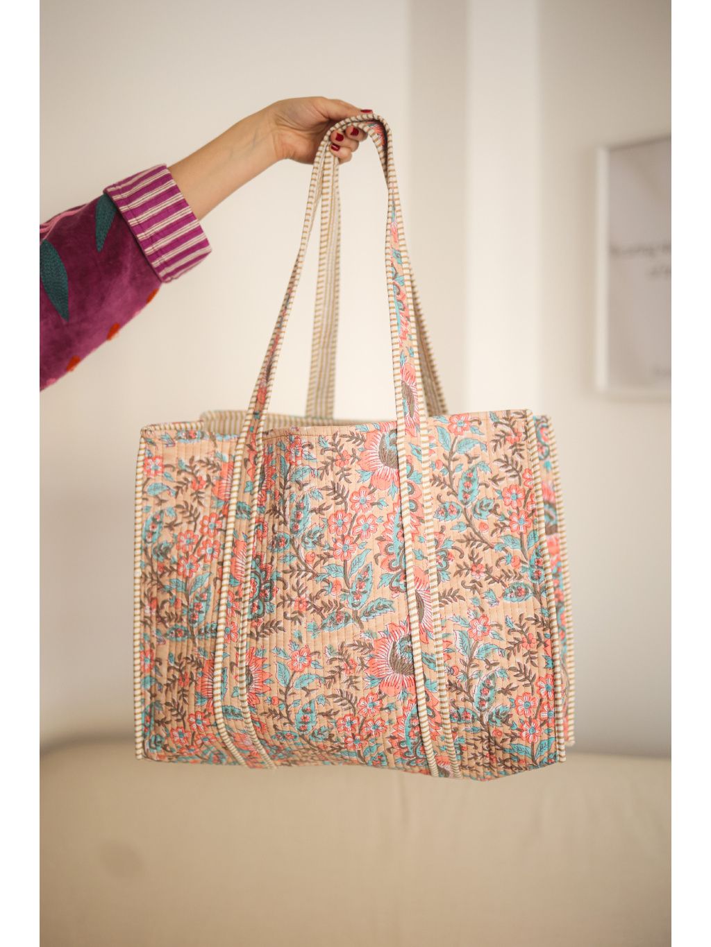 Prostorná prošívaná víkendová taška ve starorůžové barvě s botanickým motivem.