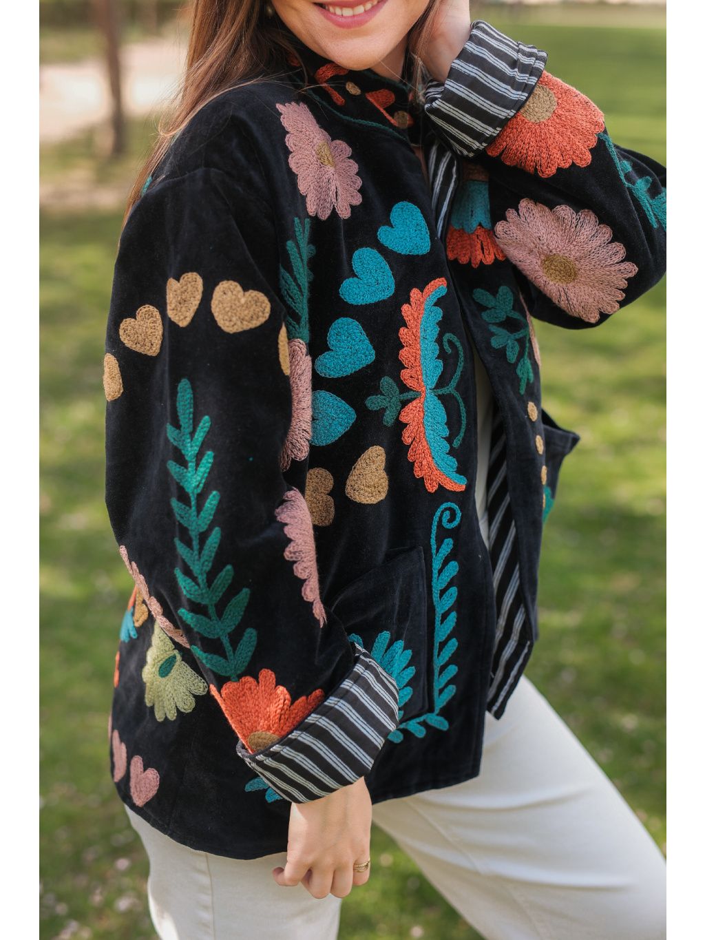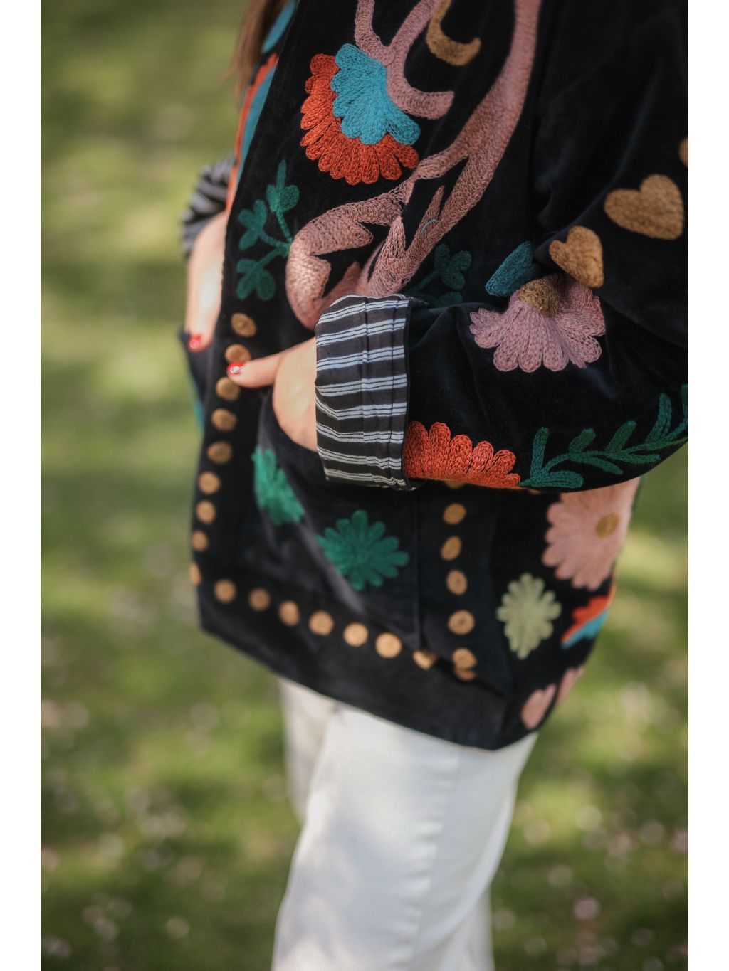 Povzneste svůj každodenní styl na novou úroveň s ikonickým kouskem z naší kolekce Bohyním. Tato bundička je kombinací jemného semiše, který je na dotek neuvěřitelně hebký a příjemný a bavlněné podšívky. Každý model je zdoben bohatou celoplošnou výšivkou, která z něj činí neopakovatelný originál.