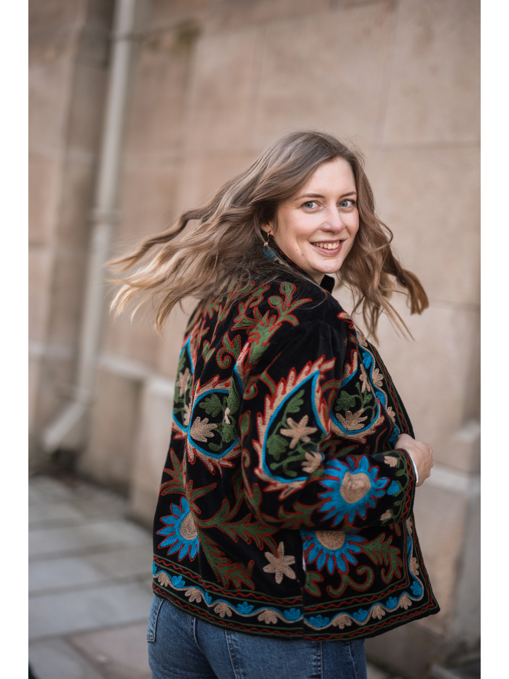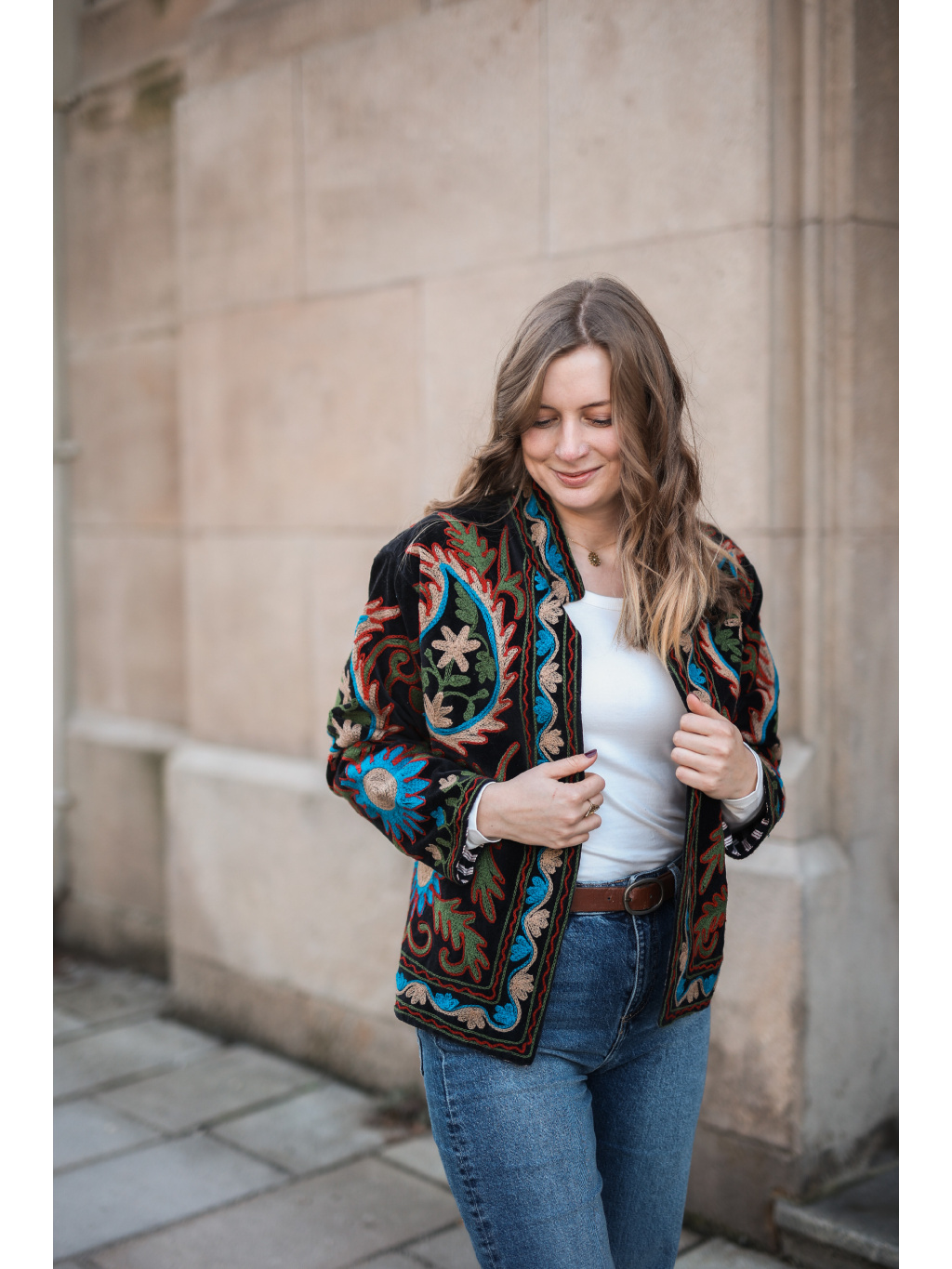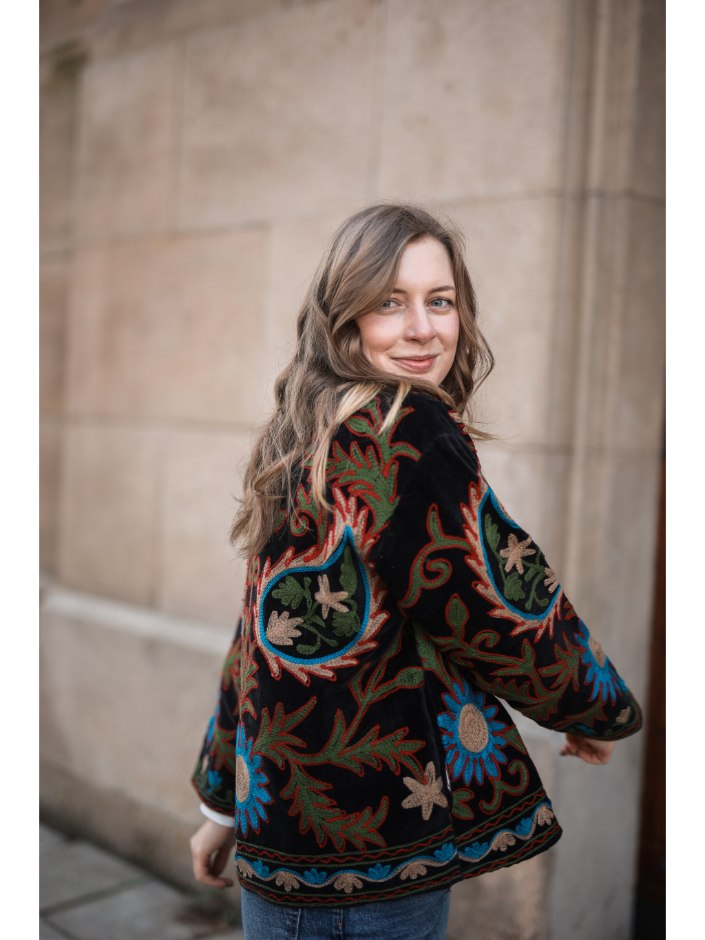 Materiál je na dotek neuvěřitelně hebký, poddajný a příjemný. Celoplošná výšivka dodává bundě luxusní hloubku a pevnou strukturu, přičemž si kousek zachovává svou lehkost. Je to přesně ta bunda, kterou si přehodíte přes ramena, když chcete zazářit na kávě ve městě, ale i na večerní procházce.