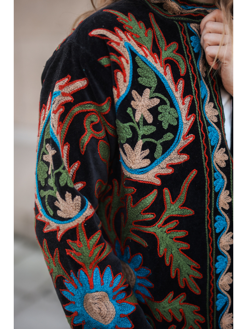 Nepřehlédnutelný kousek s duší, který v sobě nese kouzlo dálných krajů. Tato semišová bundička s bohatou celoplošnou výšivkou je ztělesněním ženskosti a originality. Díky skvěle padnoucímu střihu a hebkému materiálu se v ní budete cítit jako v bavlnce od jara až do podzimu. ✨🍂
