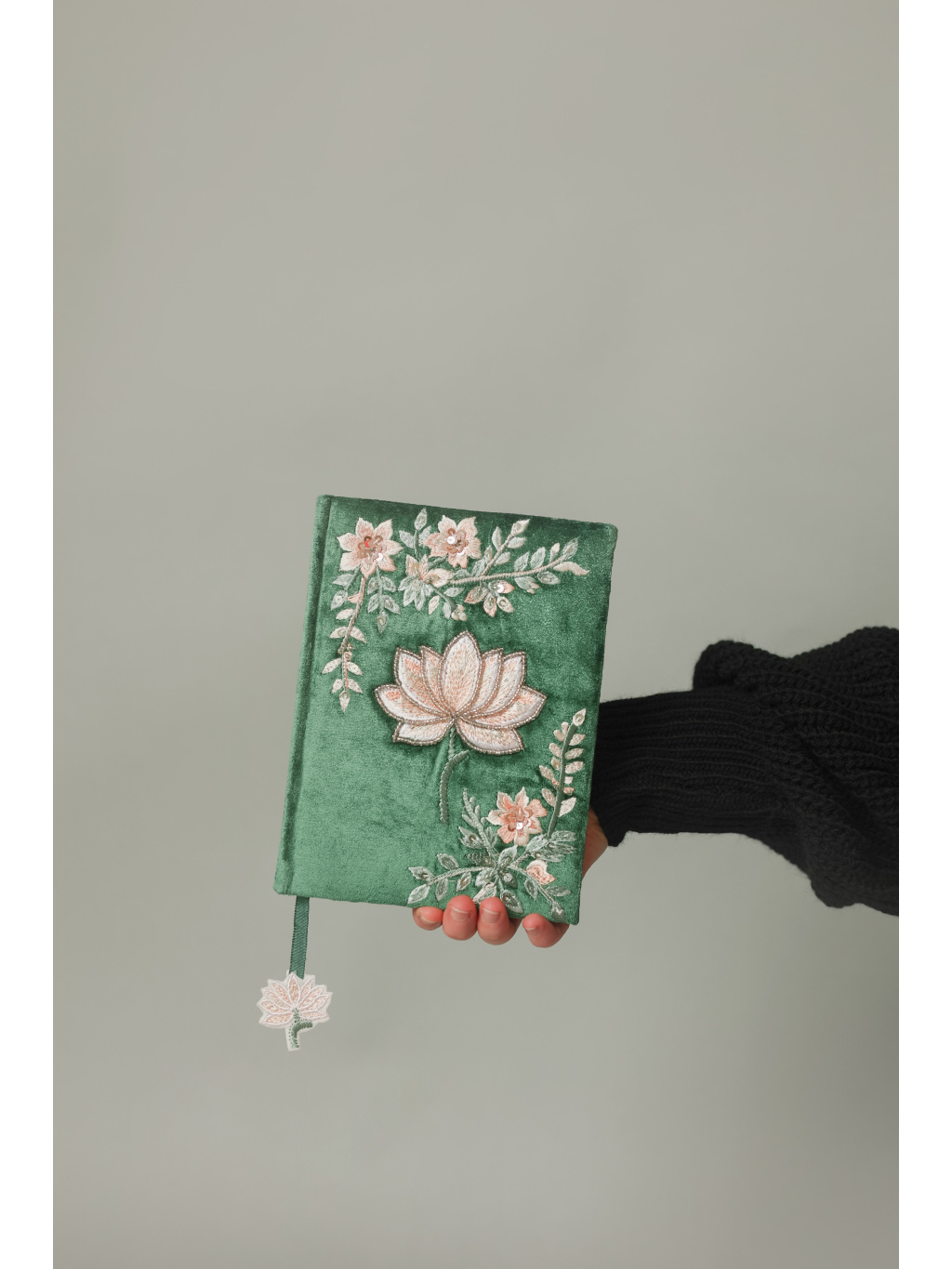 Zelený deník s výšivkou lotosu a květinových motivů 🌿