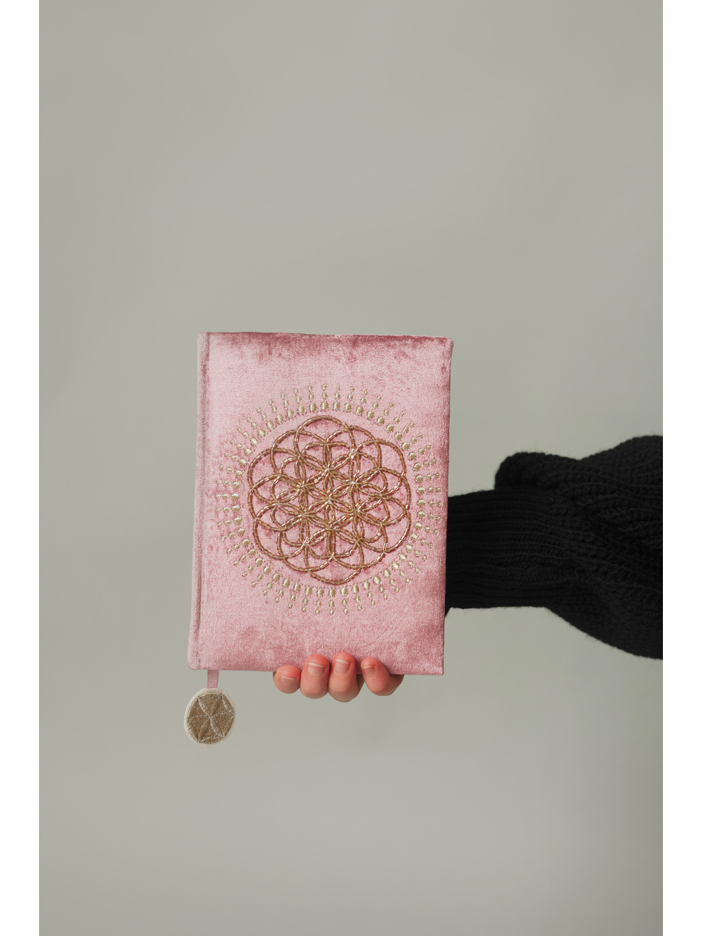 Obal v pudrově růžové sametové látce je hebký na dotek a na první pohled zaujme výšivkou posvátné geometrie – Květu života. Celý motiv je vyšitý se zlatavým leskem a drobnými perličkovými detaily, které mu dodávají hloubku a noblesu.