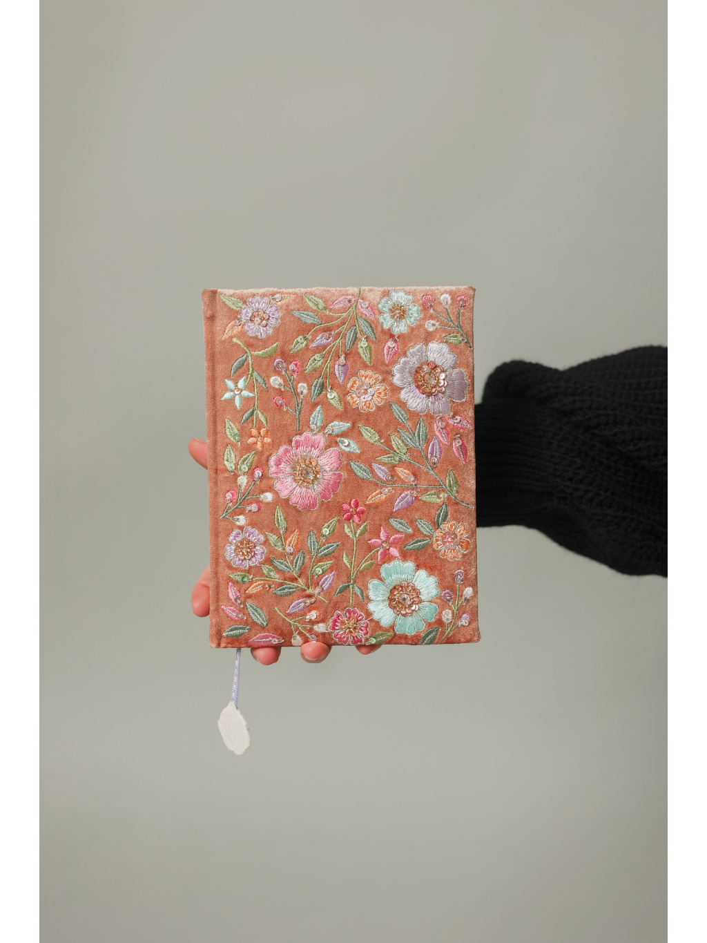 Jeho sametově hebký textilní obal v teplé, terakotové barvě je pokrytý bohatou květinovou výšivkou v tónech růžové, modré, fialové a zelené. Každý detail je pečlivě zpracovaný – nechybí ani jemné korálky, které květům dodávají třpyt a hloubku.