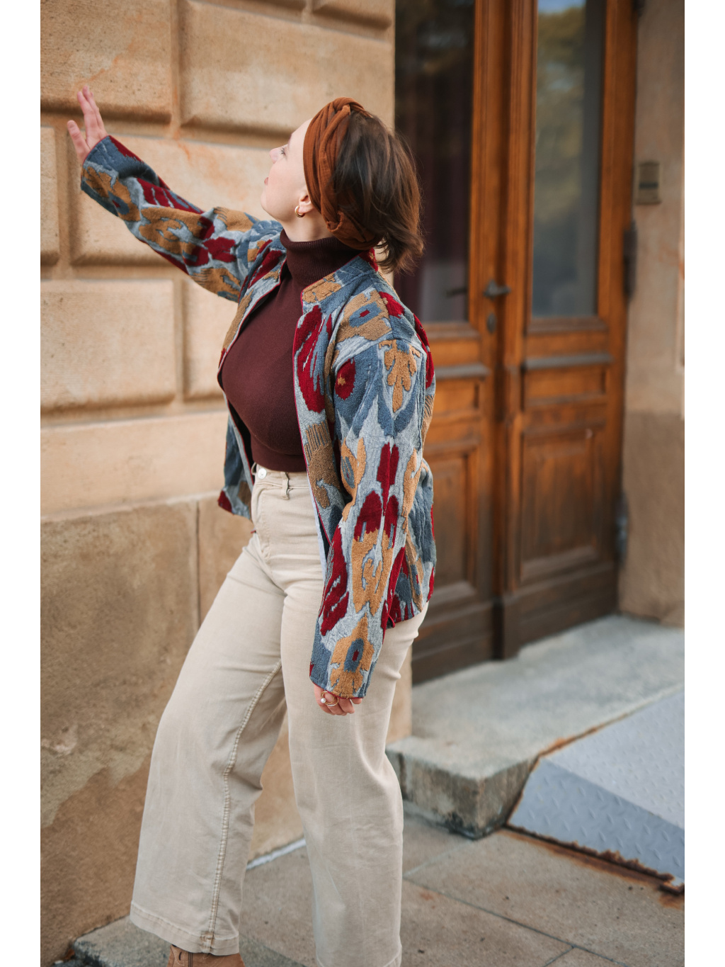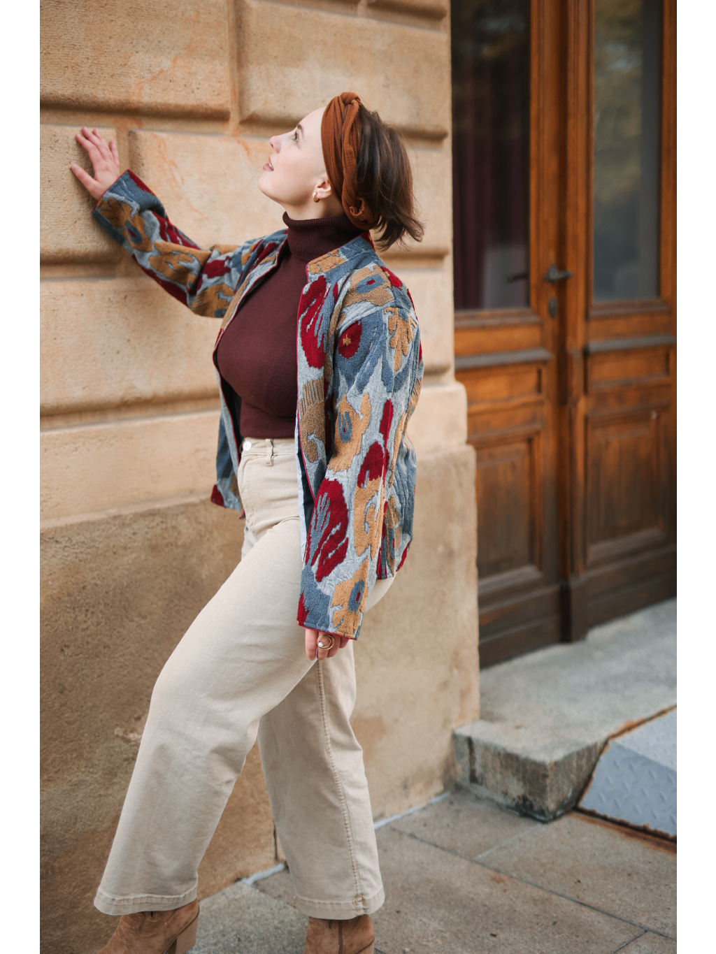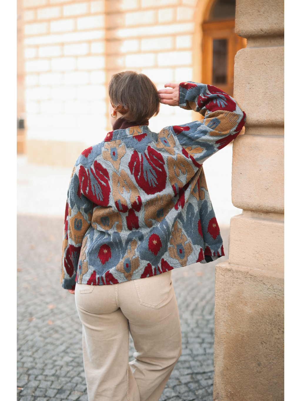 Díky svému univerzálnímu střihu se snadno kombinuje s šaty i kalhotami a stane se krásným vrchním kouskem pro každodenní nošení i speciální chvíle. Ruční výšivka nese autentické kouzlo – drobné nepravidelnosti nejsou chybou, ale důkazem její originality.