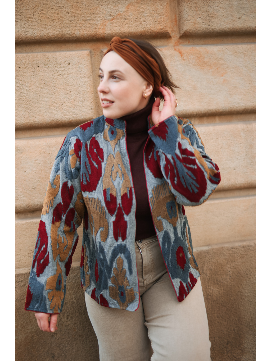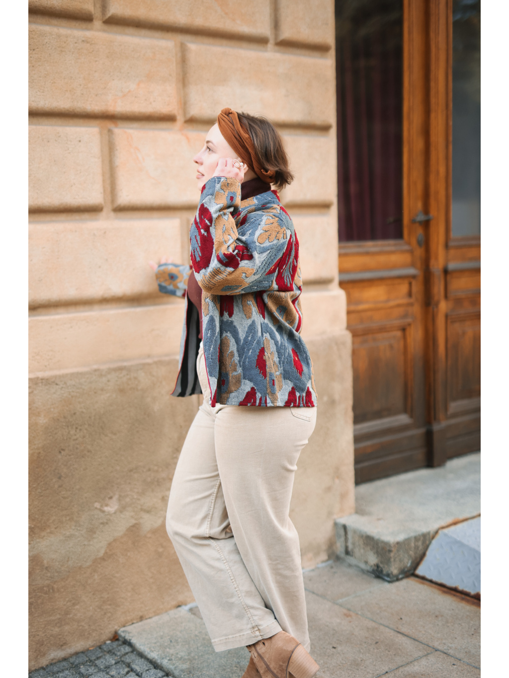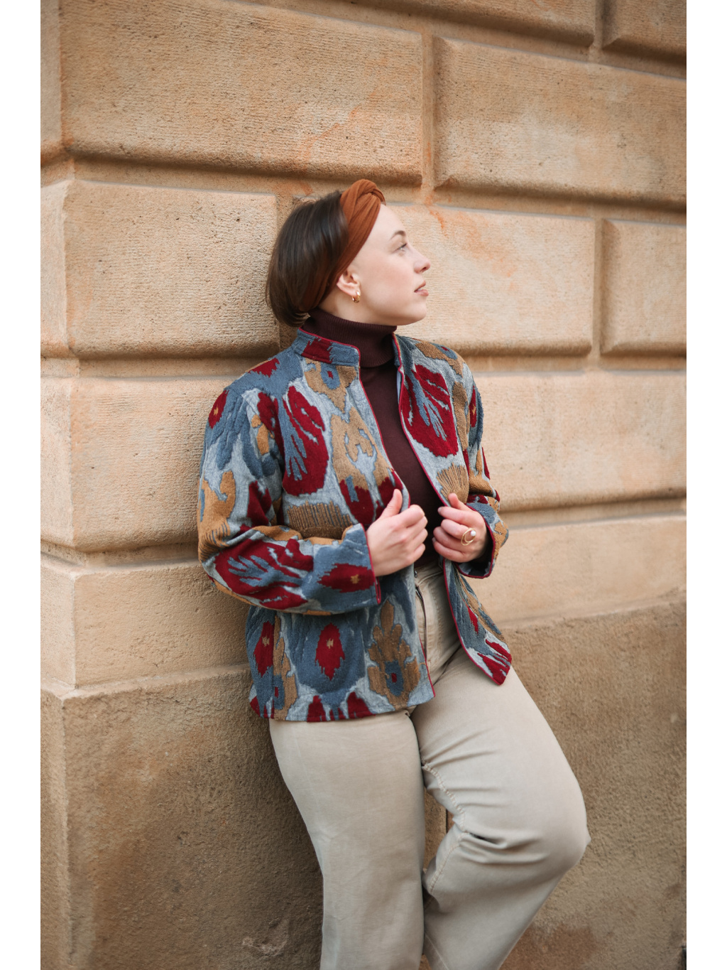 Díky svému univerzálnímu střihu se snadno kombinuje s šaty i kalhotami a stane se krásným vrchním kouskem pro každodenní nošení i speciální chvíle. Ruční výšivka nese autentické kouzlo – drobné nepravidelnosti nejsou chybou, ale důkazem její originality.