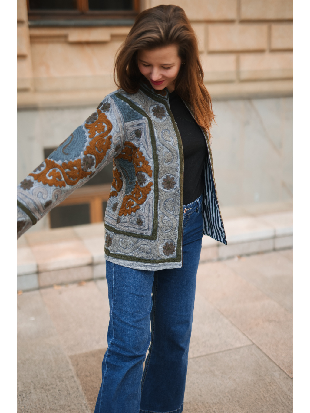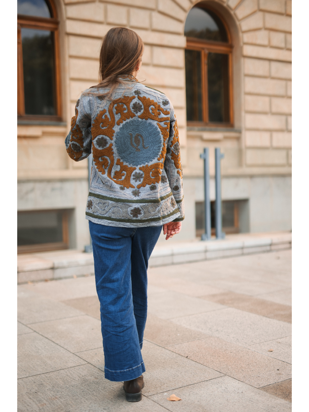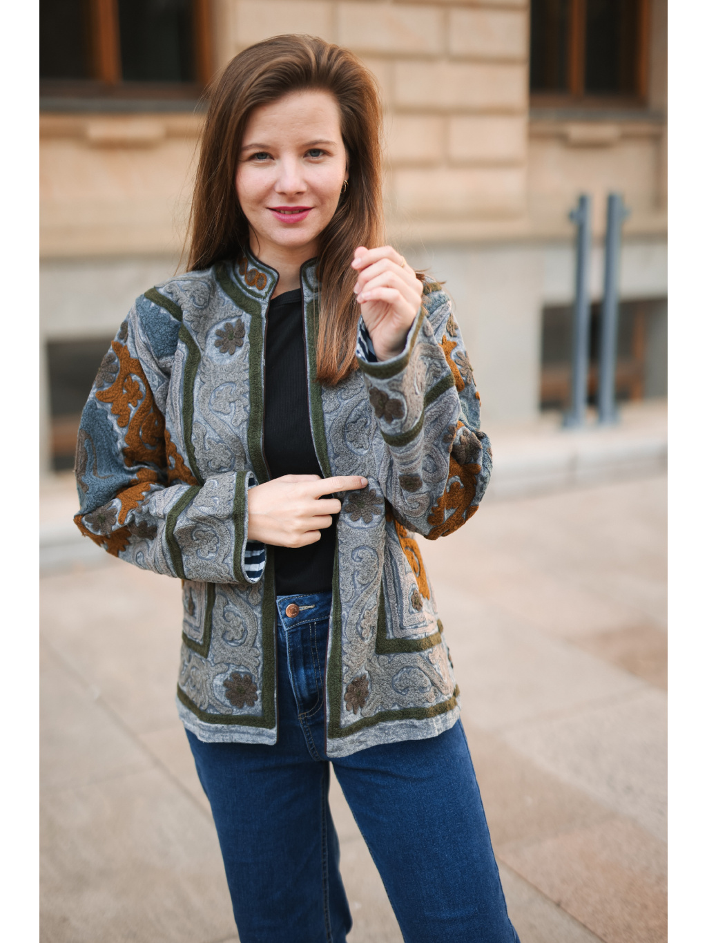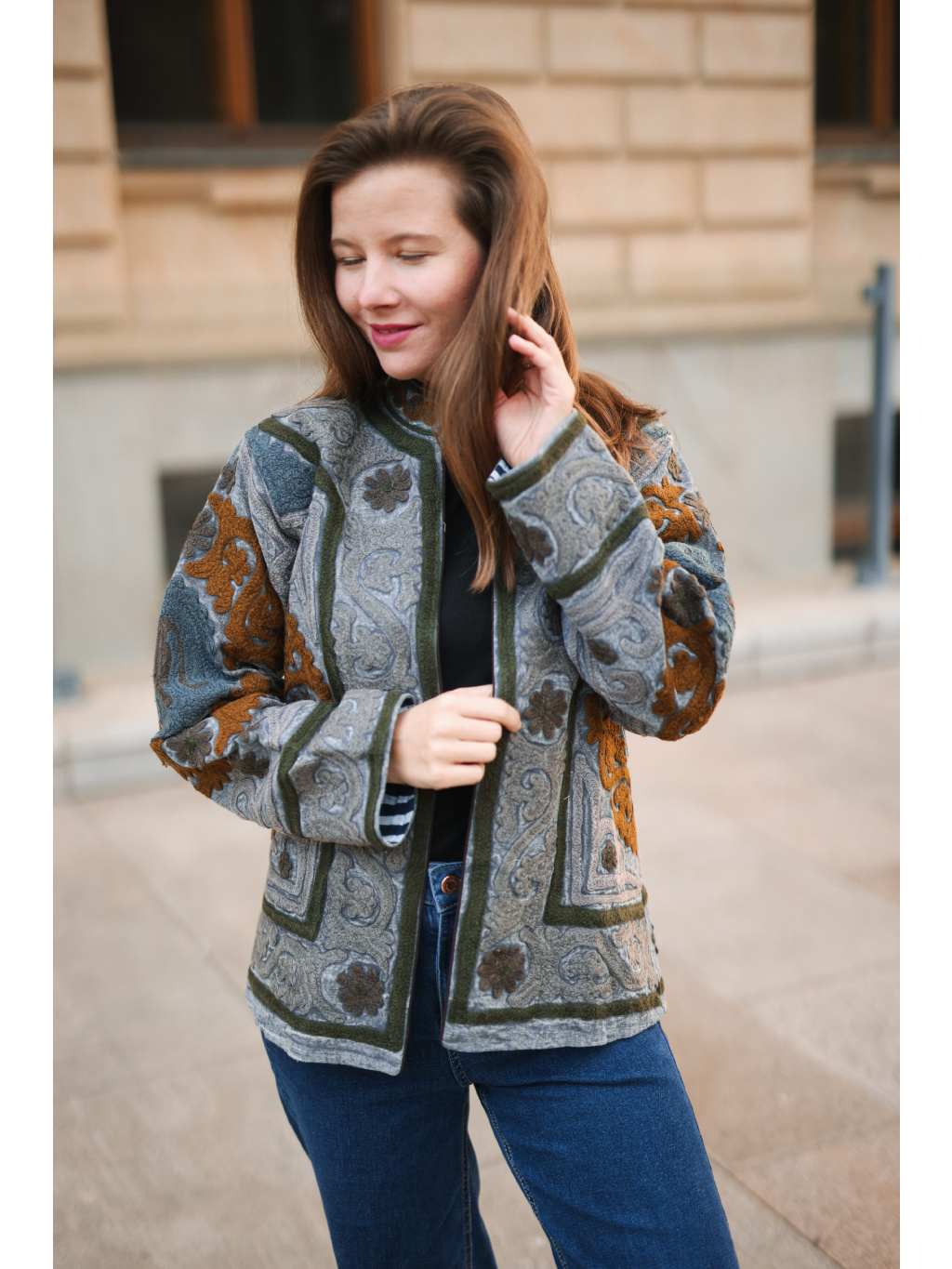 Originální ručně vyšívaná bundička v přírodních tónech šedé, olivové a karamelové. ✨