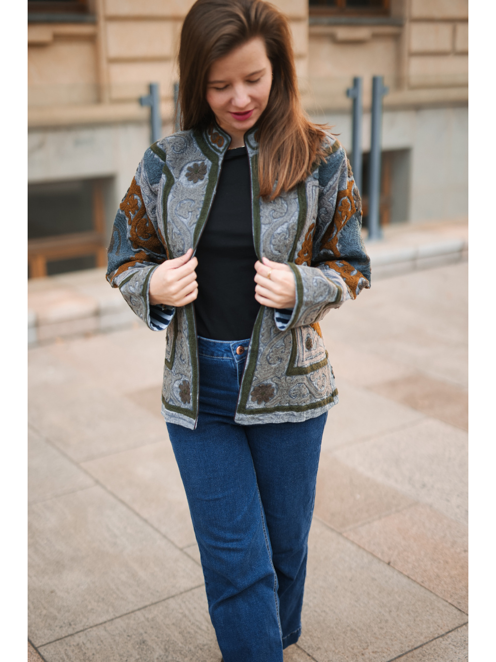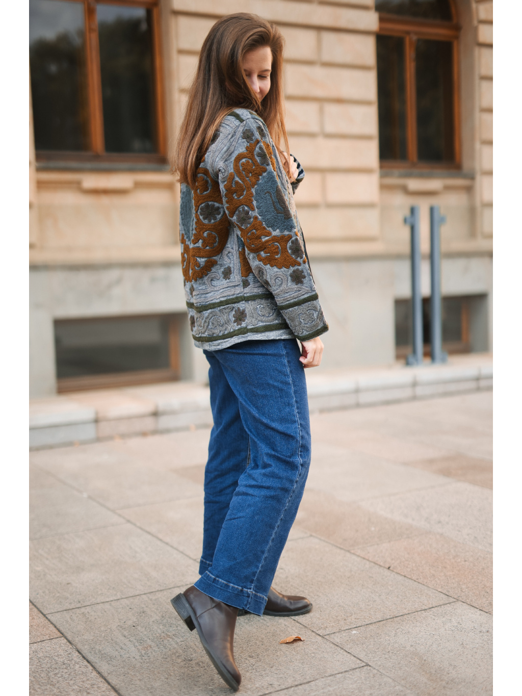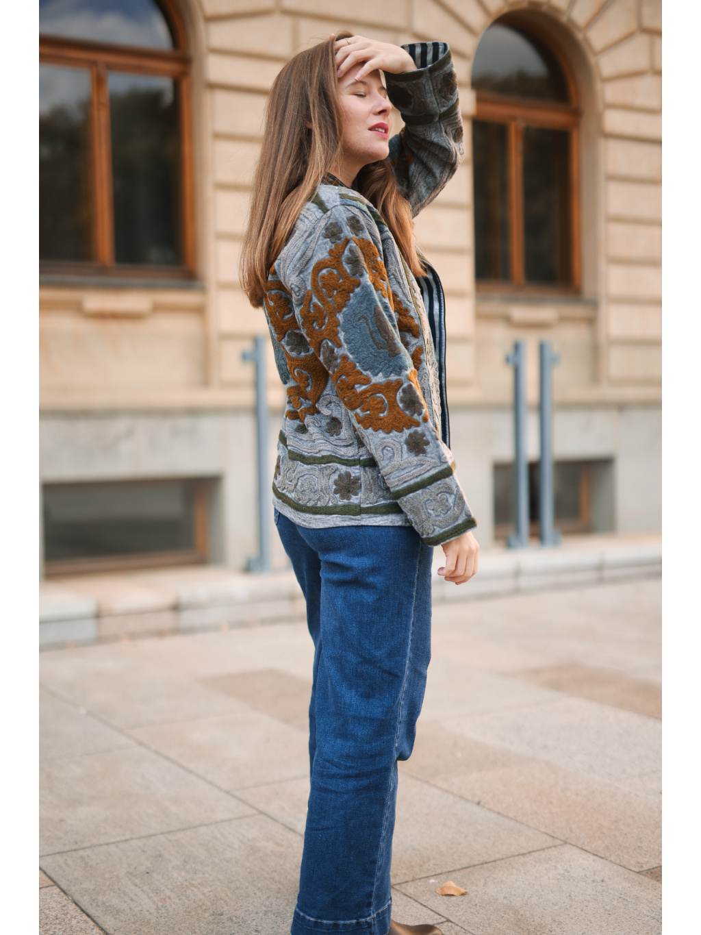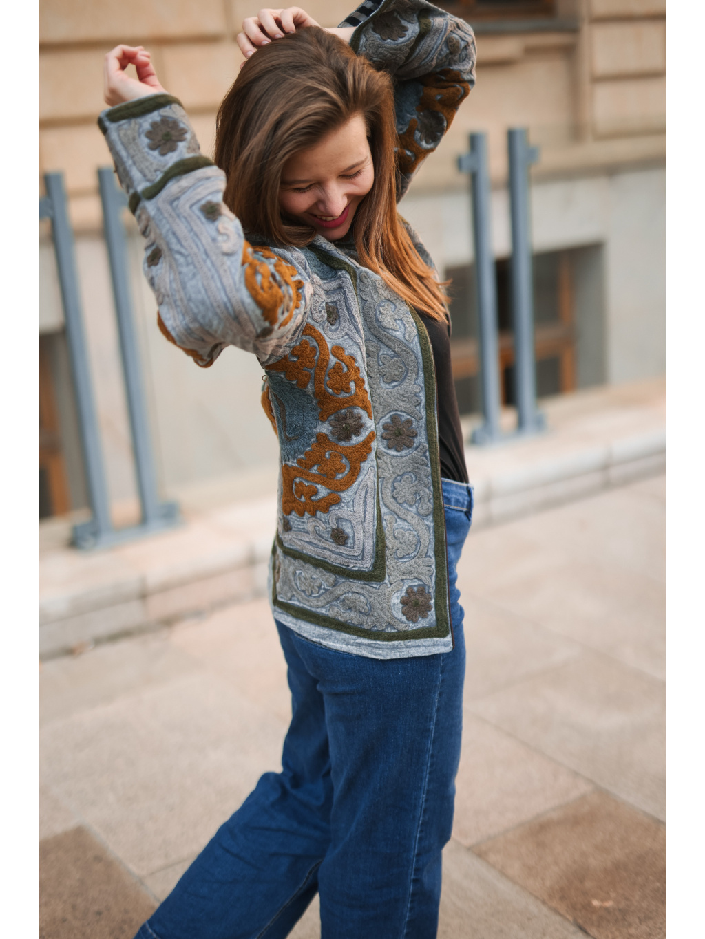 Originální ručně vyšívaná bundička v přírodních tónech šedé, olivové a karamelové. ✨