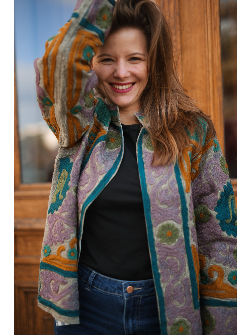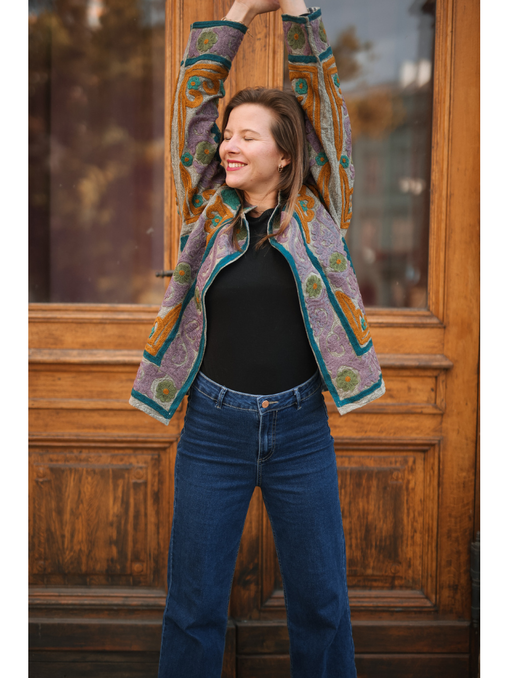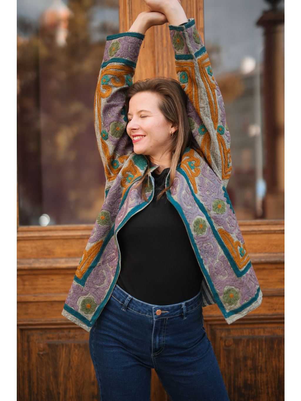 Díky svému univerzálnímu střihu se snadno kombinuje s šaty i kalhotami a stane se krásným vrchním kouskem pro každodenní nošení i speciální chvíle. Ruční výšivka nese autentické kouzlo – drobné nepravidelnosti nejsou chybou, ale důkazem její originality.