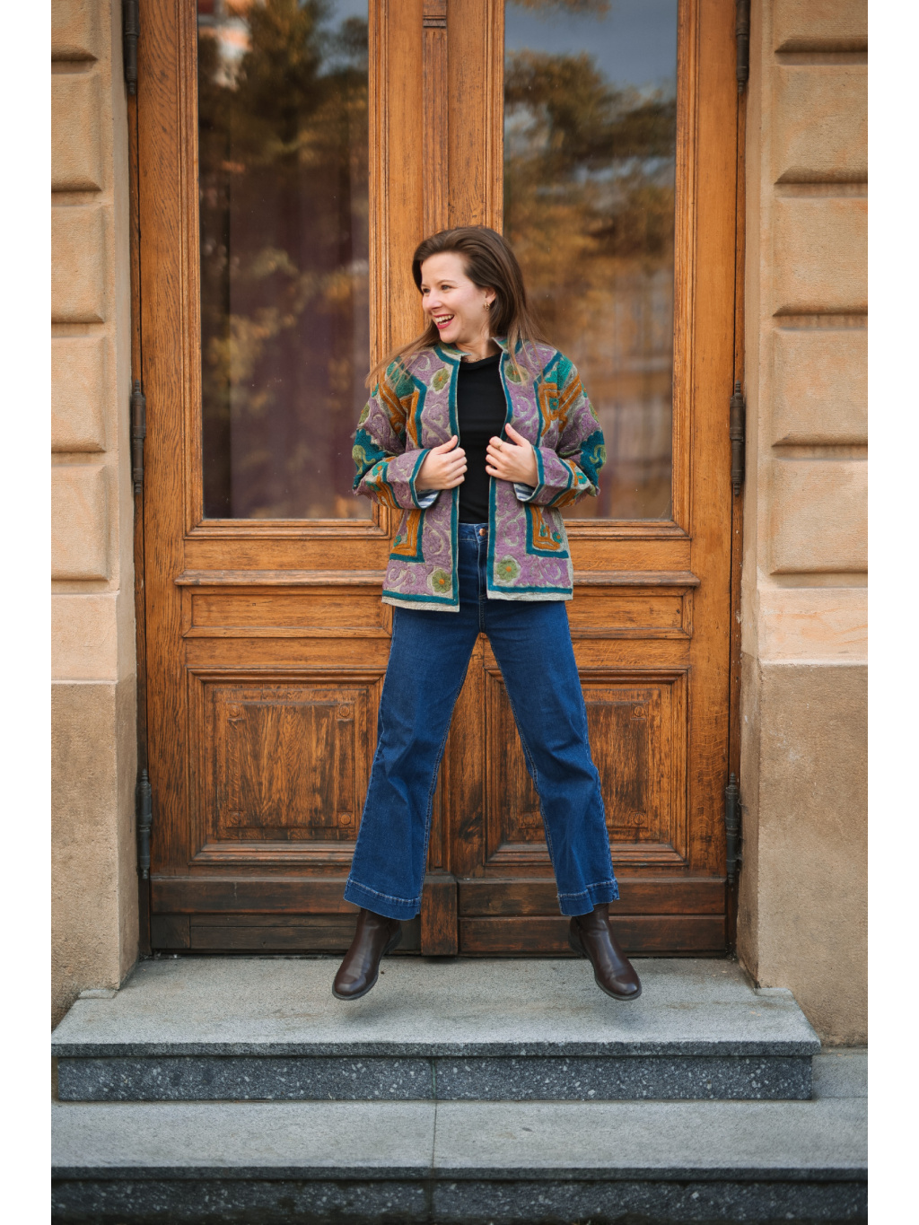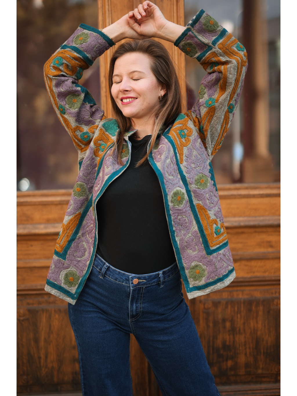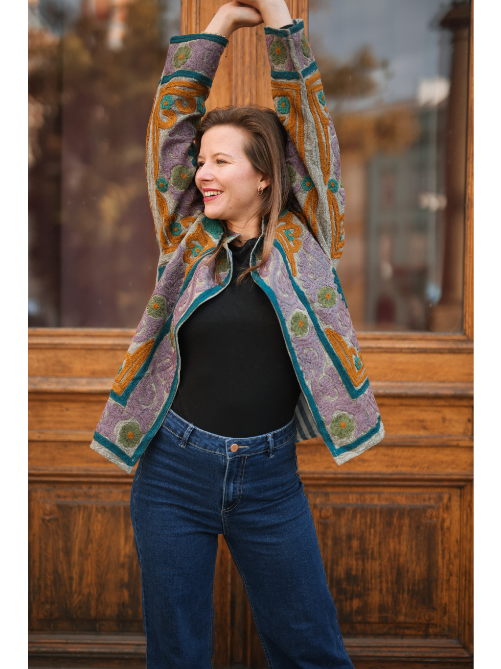 Díky svému univerzálnímu střihu se snadno kombinuje s šaty i kalhotami a stane se krásným vrchním kouskem pro každodenní nošení i speciální chvíle. Ruční výšivka nese autentické kouzlo – drobné nepravidelnosti nejsou chybou, ale důkazem její originality.