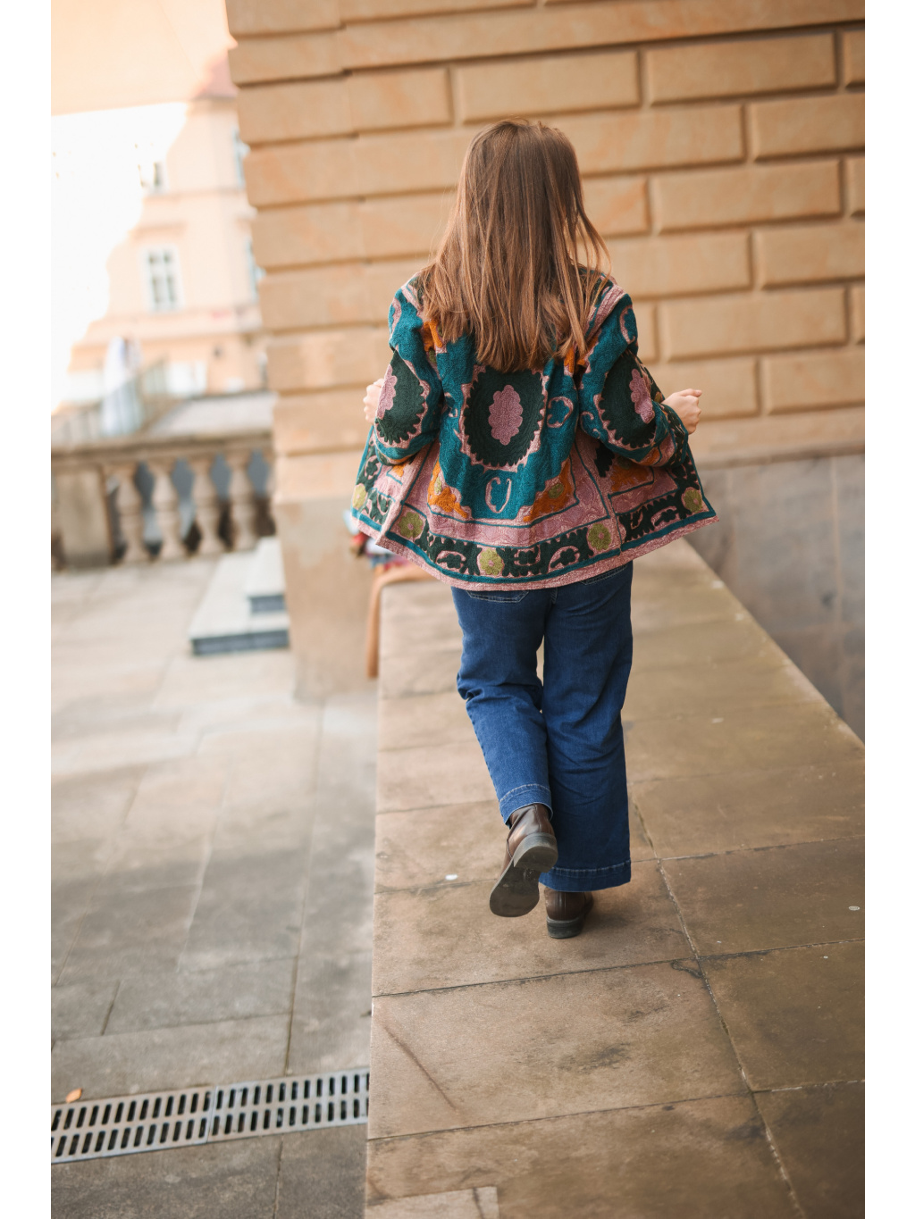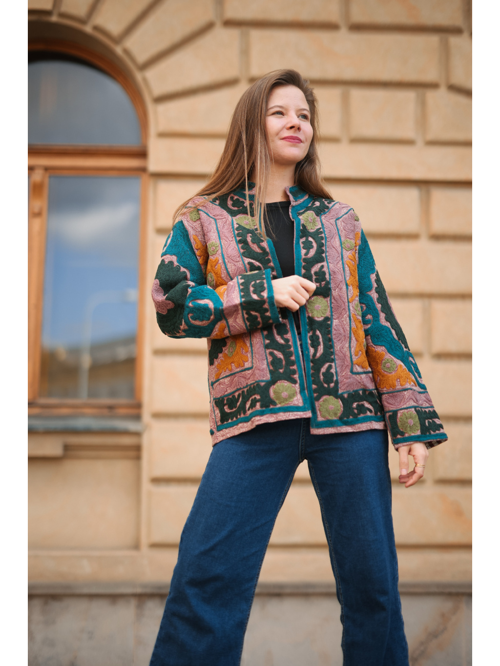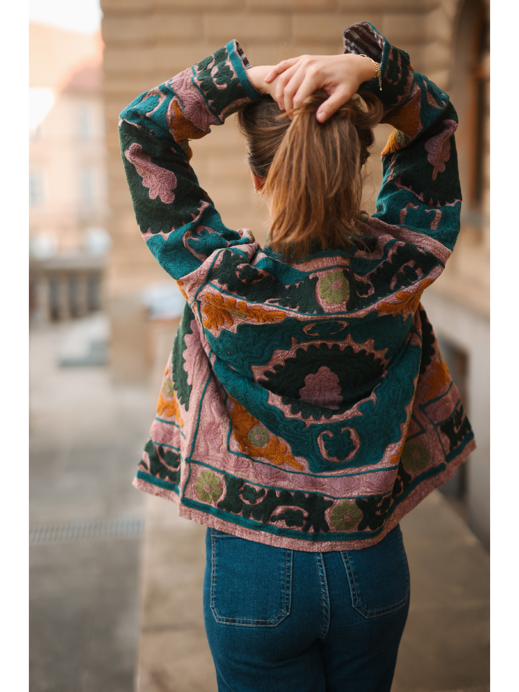 Ručně vyšívaná bundička z Indie v tónech zelené, růžové a okrové. Výrazný, ale elegantní kousek, který oživí každý outfit. 🌿✨