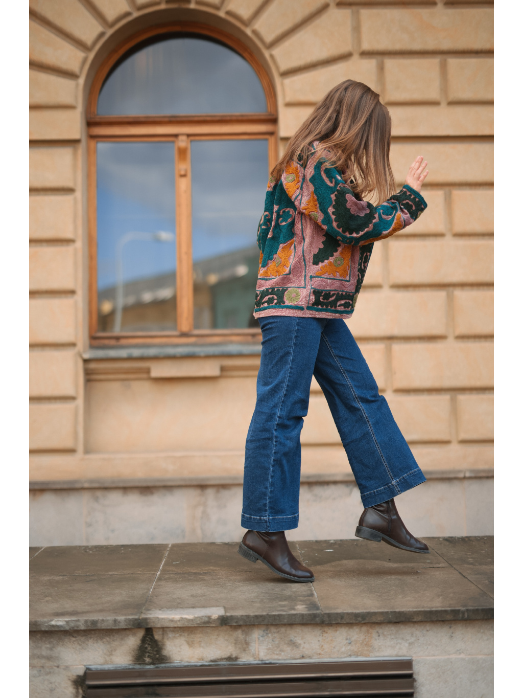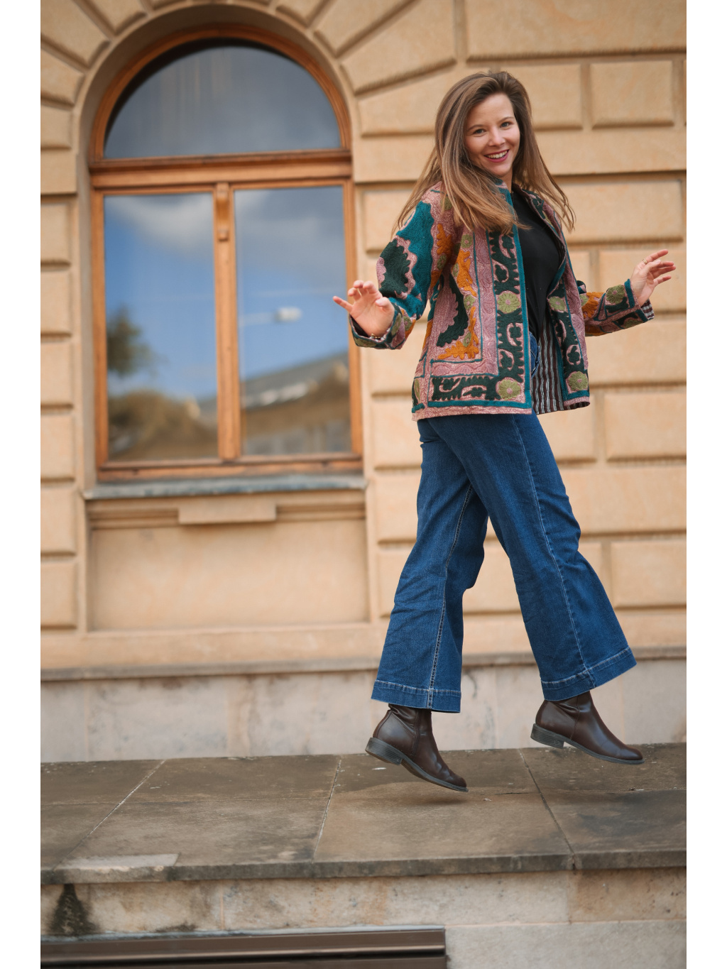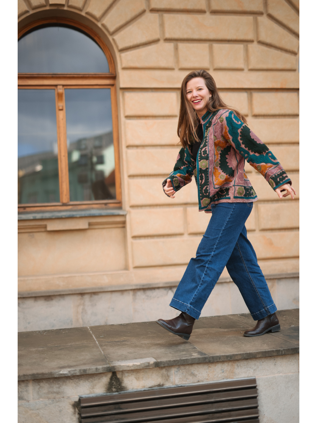 Bavlněný materiál je příjemný na dotek, hřejivý a vhodný pro podzimní období. Kombinace výrazných barev dává bundičce energii, která přesto zůstává v rovnováze – stejně jako žena, která ji nosí.
