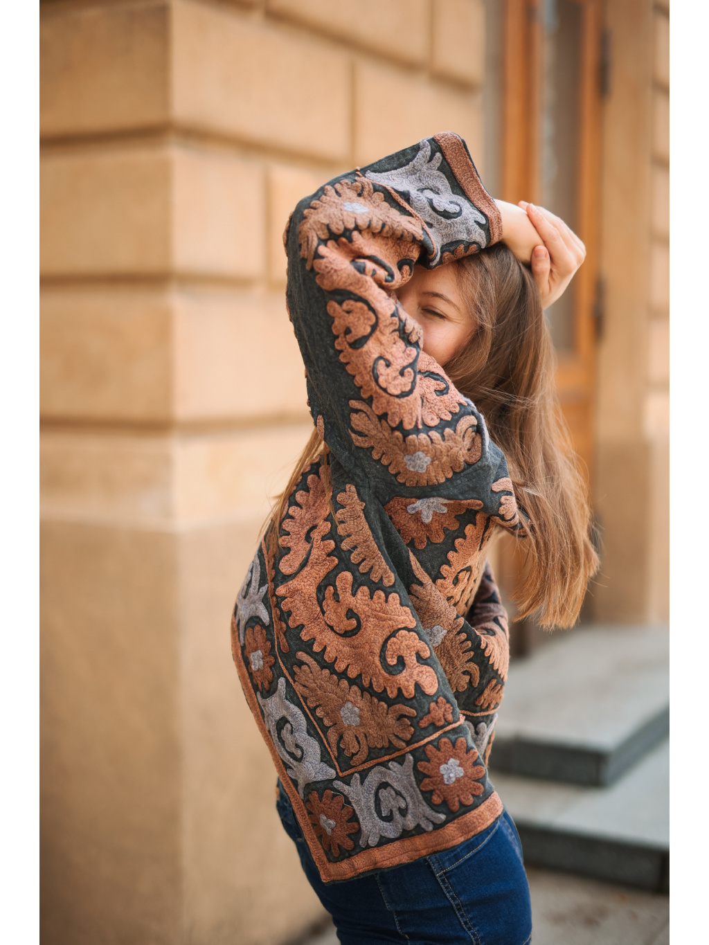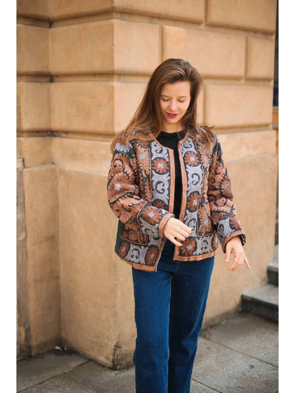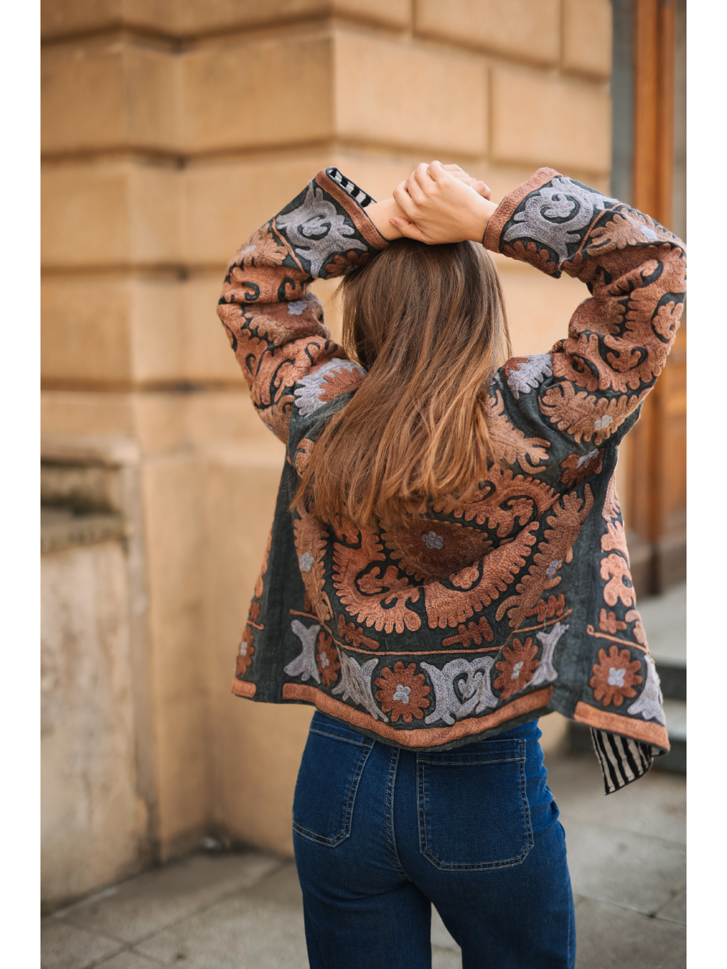 Ručně vyšívaná bundička v zemitých odstínech hnědé, šedé a měděné. Nadčasový kousek, který v sobě spojuje sílu země a jemnost řemesla. ✨