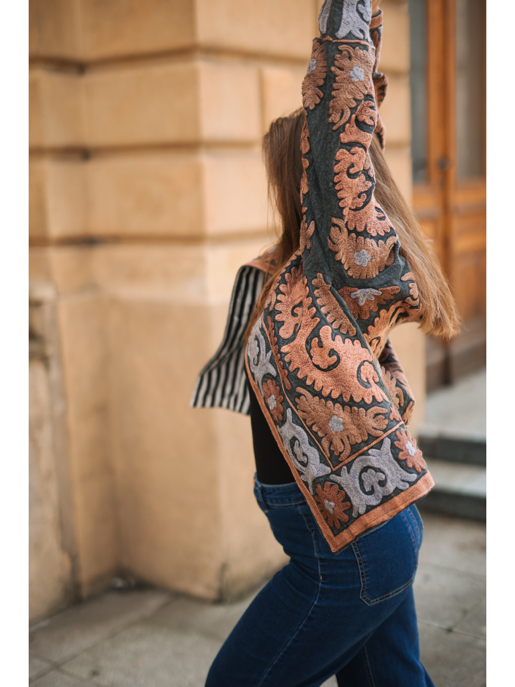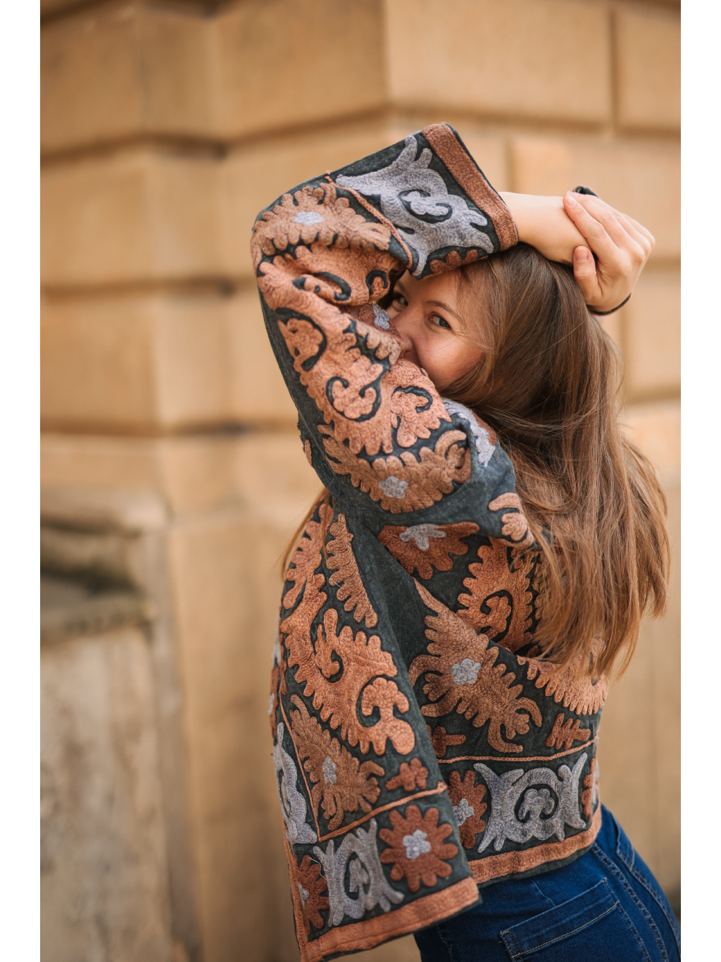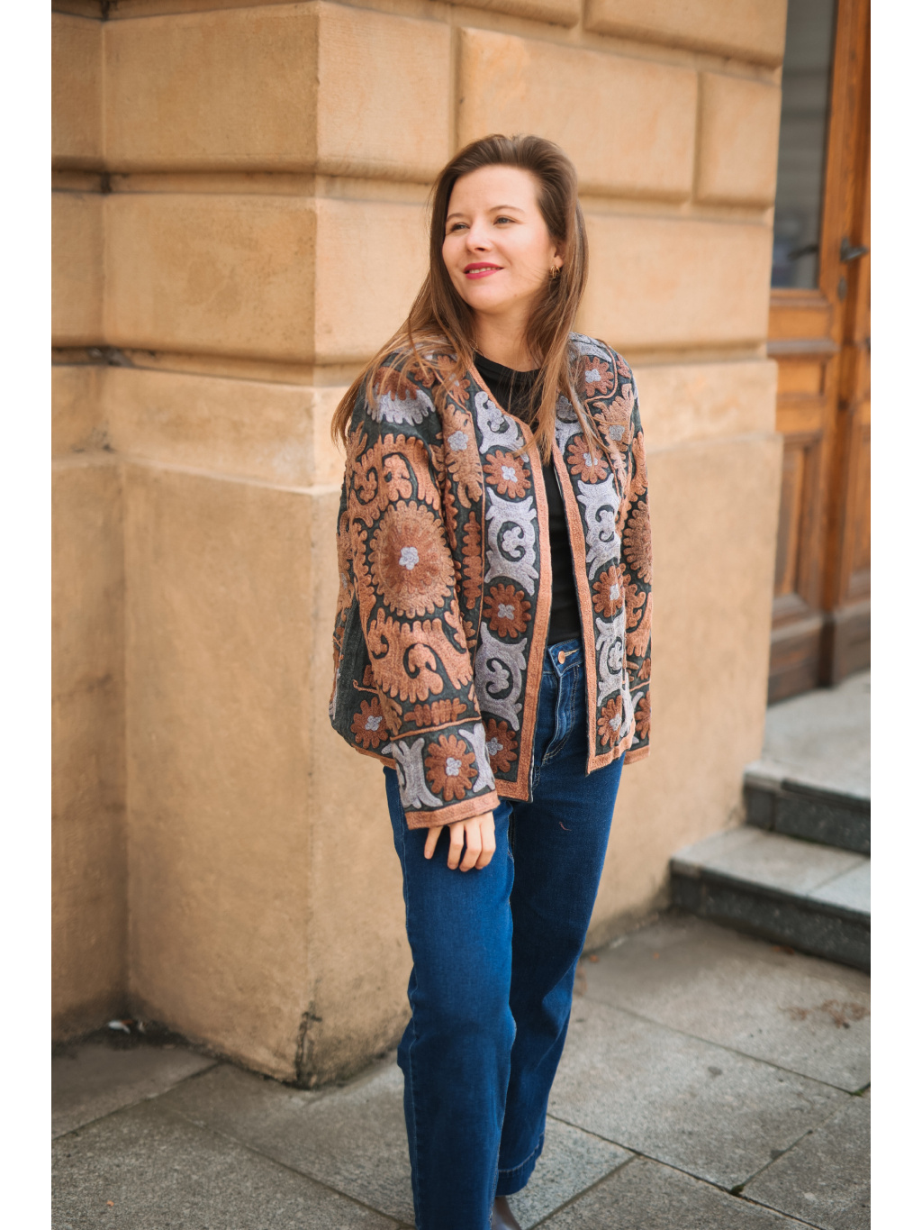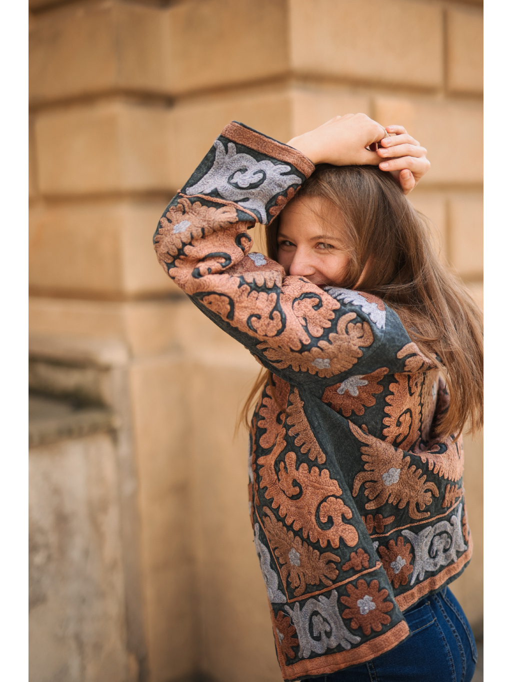 Ručně vyšívaná bundička v zemitých odstínech hnědé, šedé a měděné. Nadčasový kousek, který v sobě spojuje sílu země a jemnost řemesla. ✨