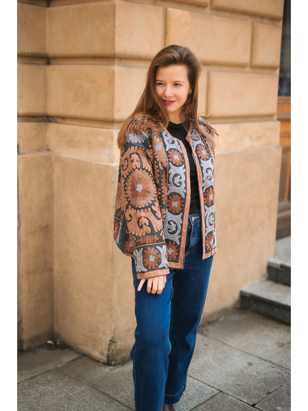 Díky svému univerzálnímu střihu se snadno kombinuje s šaty i kalhotami a stane se krásným vrchním kouskem pro každodenní nošení i speciální chvíle. Ruční výšivka nese autentické kouzlo – drobné nepravidelnosti nejsou chybou, ale důkazem její originality.
