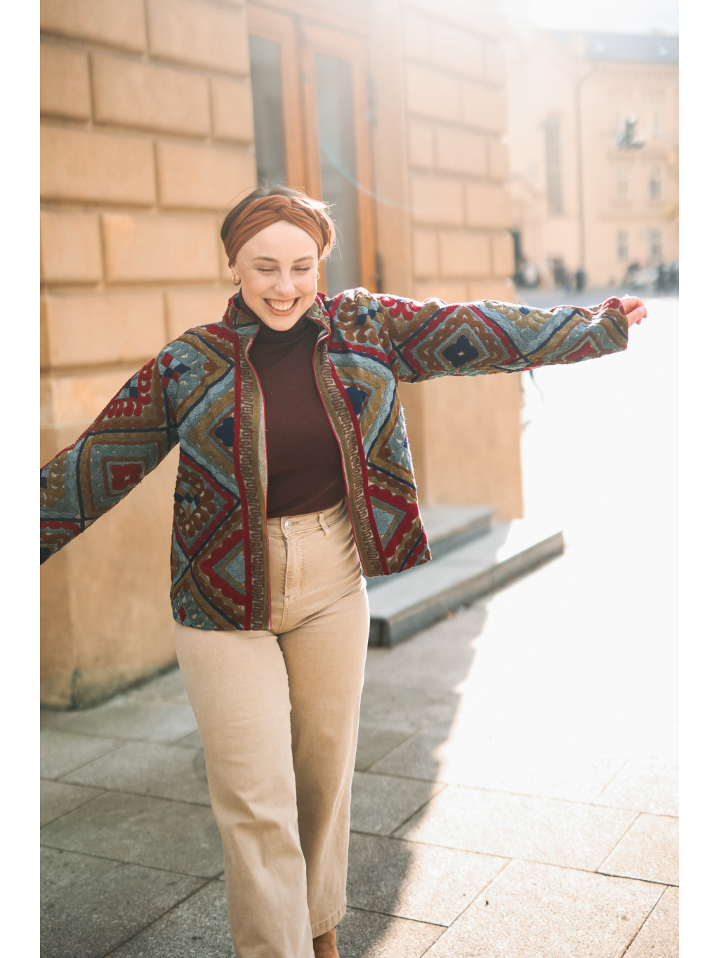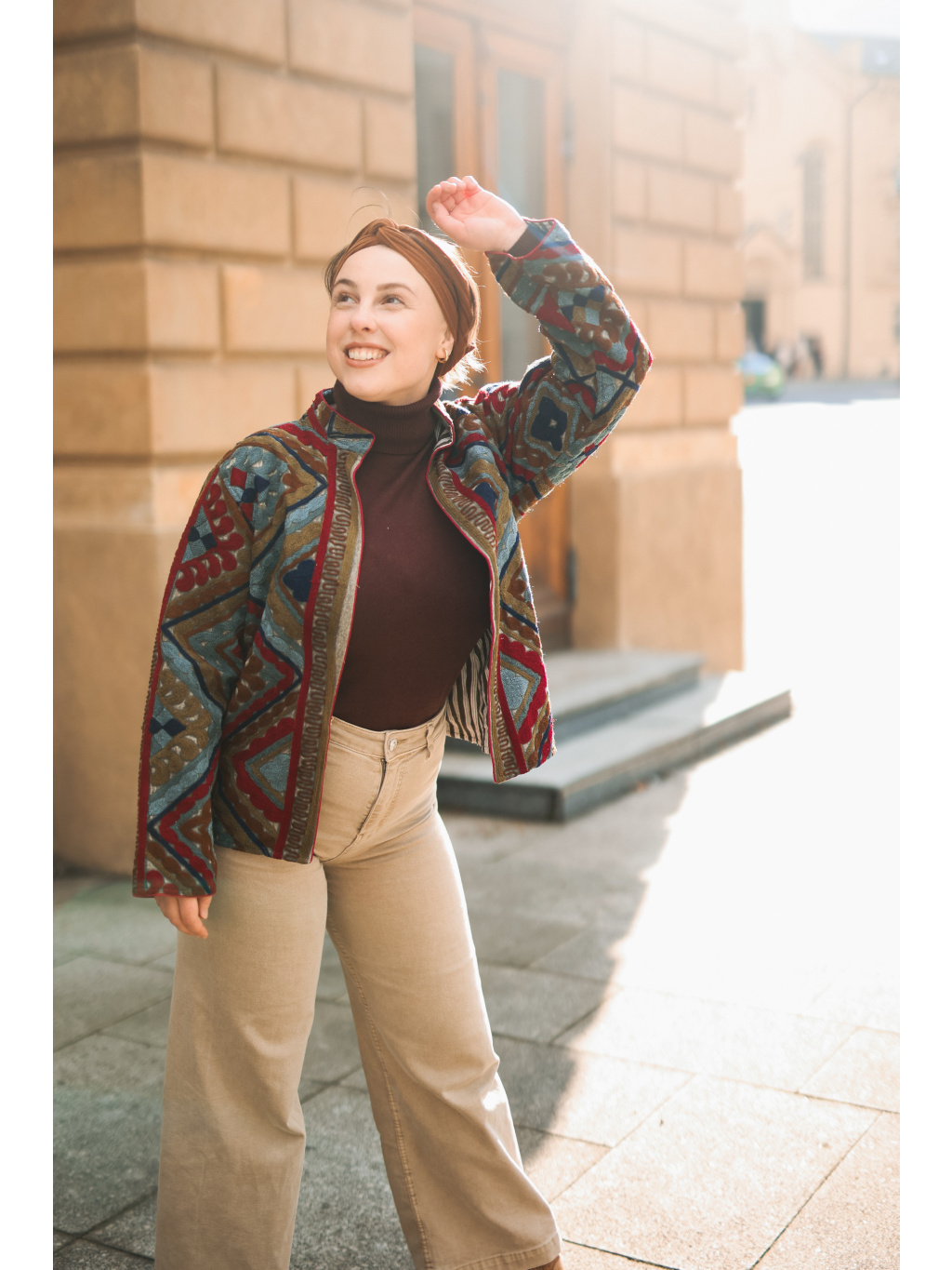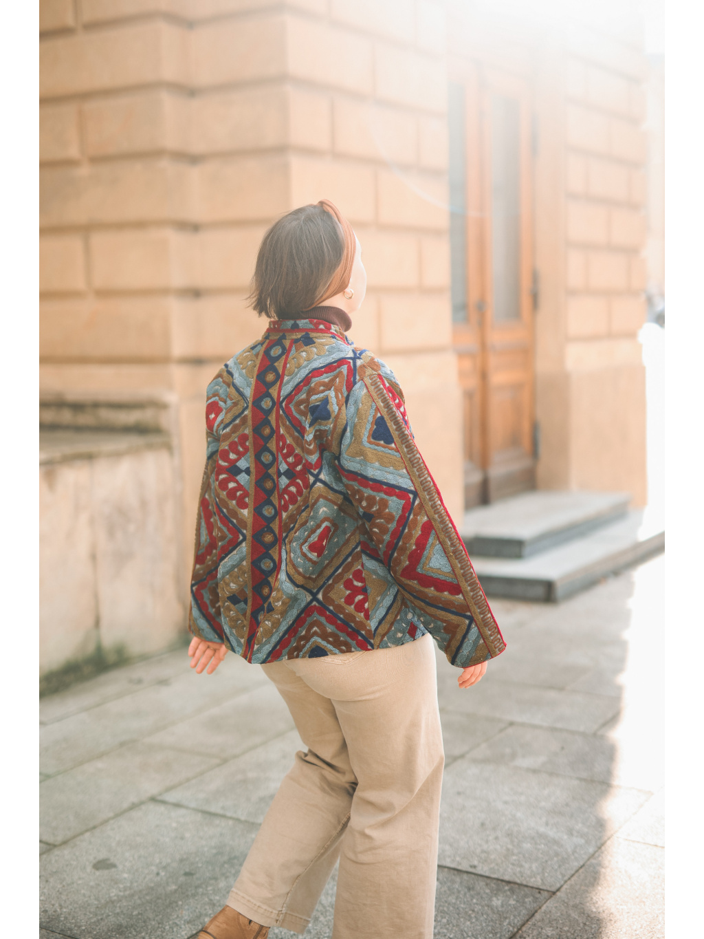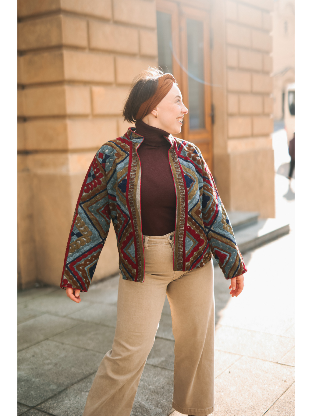 Originální ručně vyšívaná bundička z Indie v odstínech červené, modré a hnědé. Každý kus je jedinečný originál – stejně jako Vy. ✨