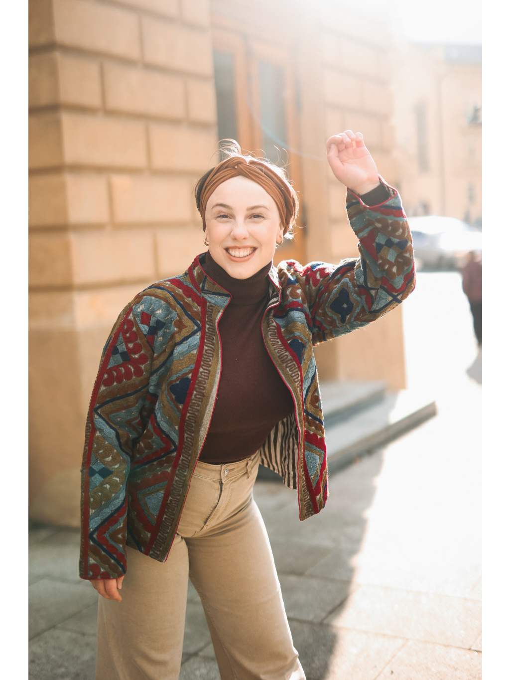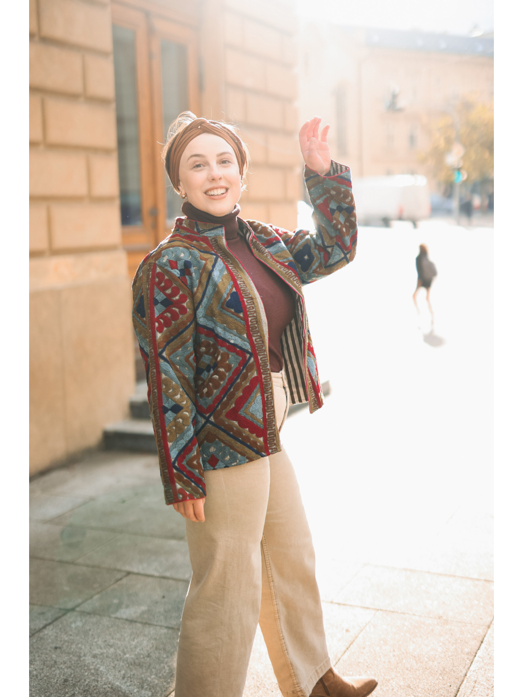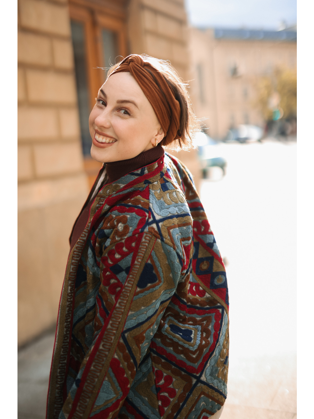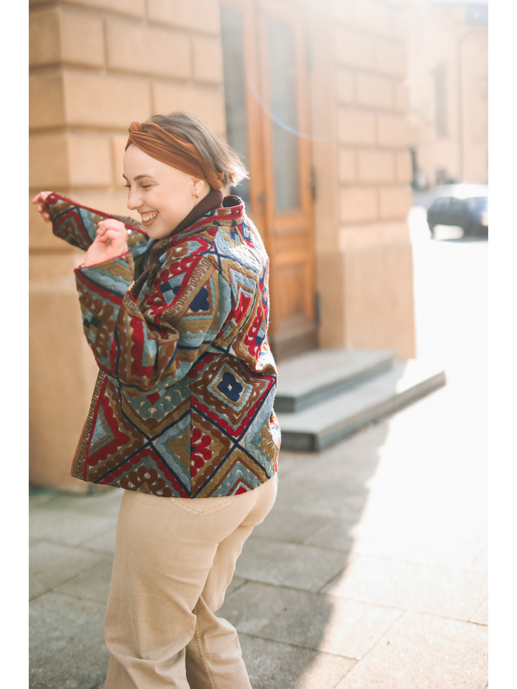 Originální ručně vyšívaná bundička z Indie v odstínech červené, modré a hnědé. Každý kus je jedinečný originál – stejně jako Vy. ✨