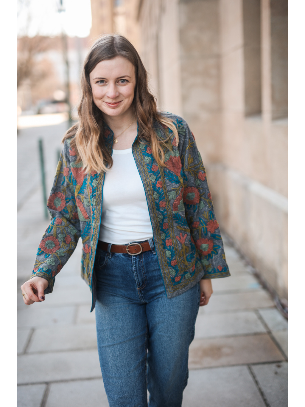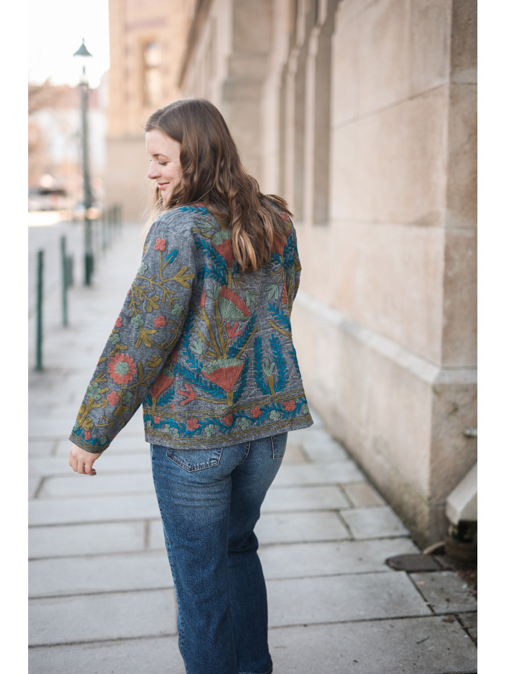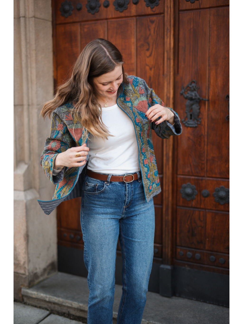 Bavlněná bundička v hřejivých tónech měděné a tyrkysové. Dokonale sedící střih a unikátní vzor z ní dělají nepřehlédnutelný originál, který rozzáří každý Váš outfit. ✨