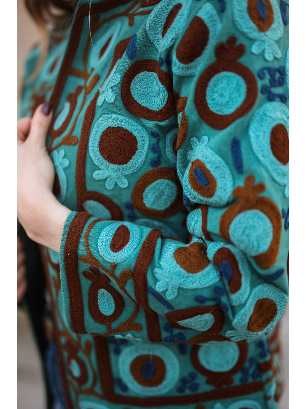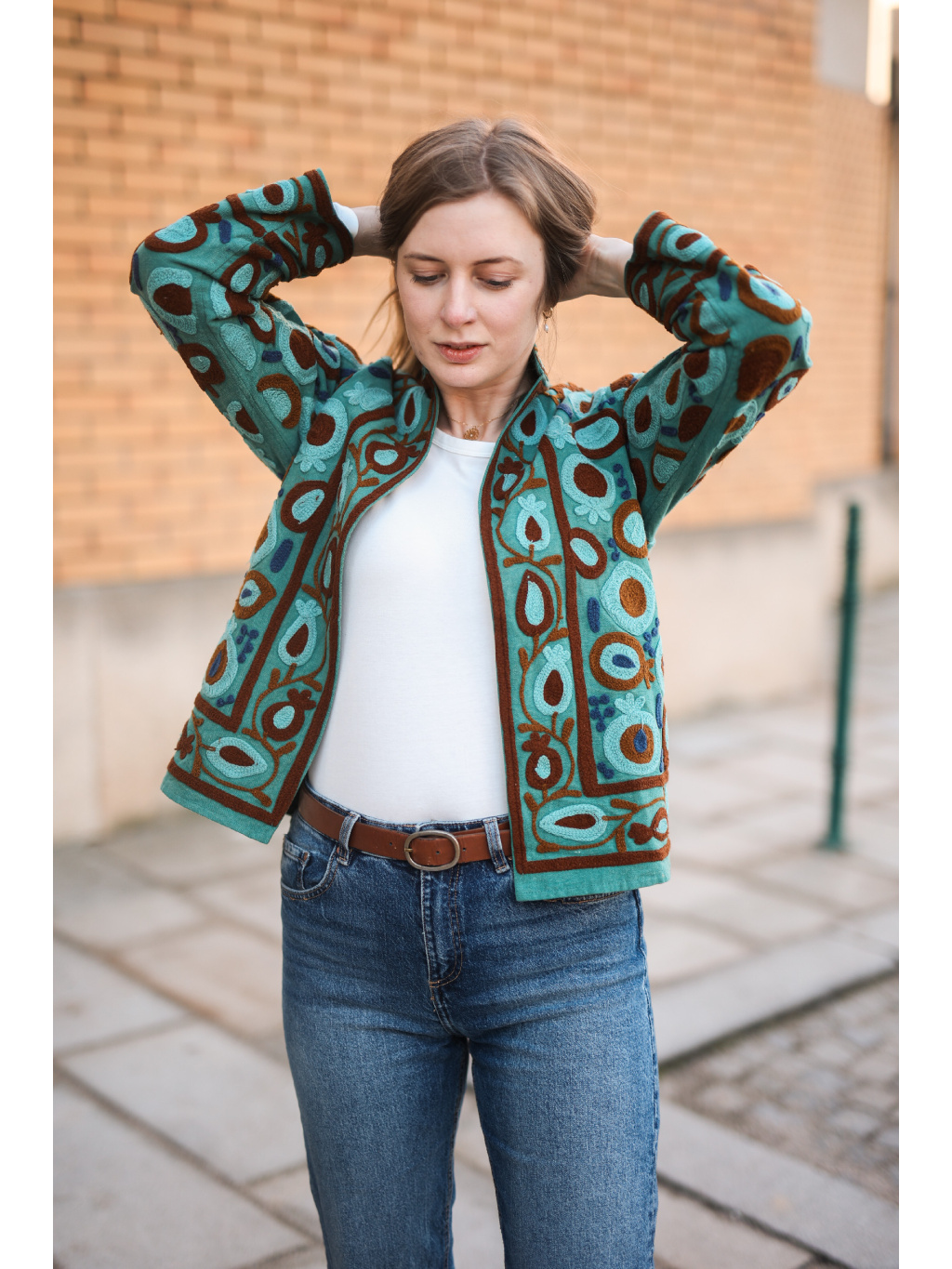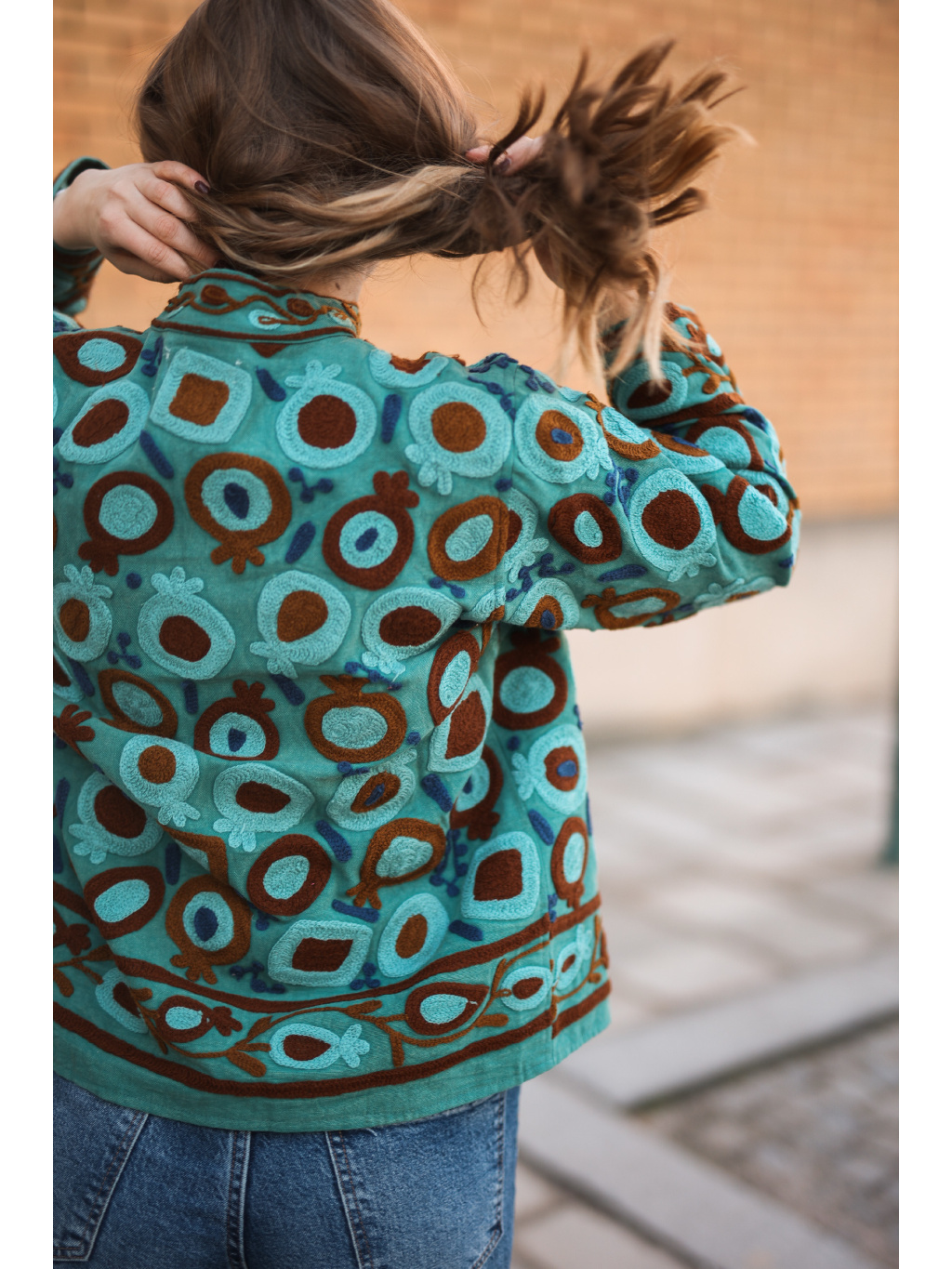 Jedinečnost: Výšivka vytváří nádhernou texturu a dělá z bundy dominantní prvek outfitu.