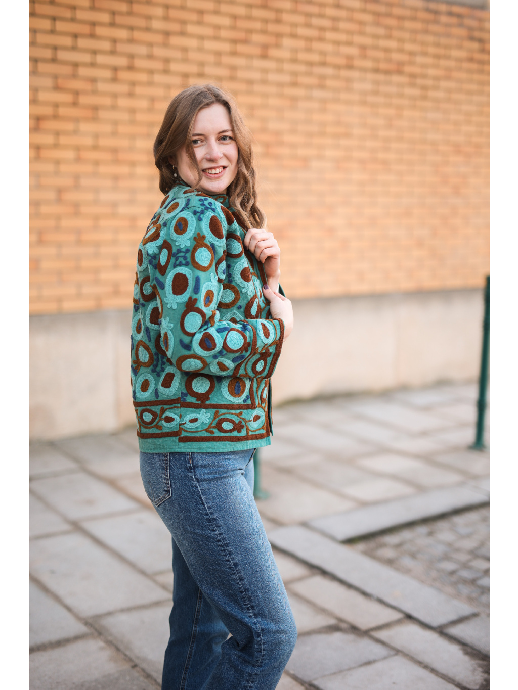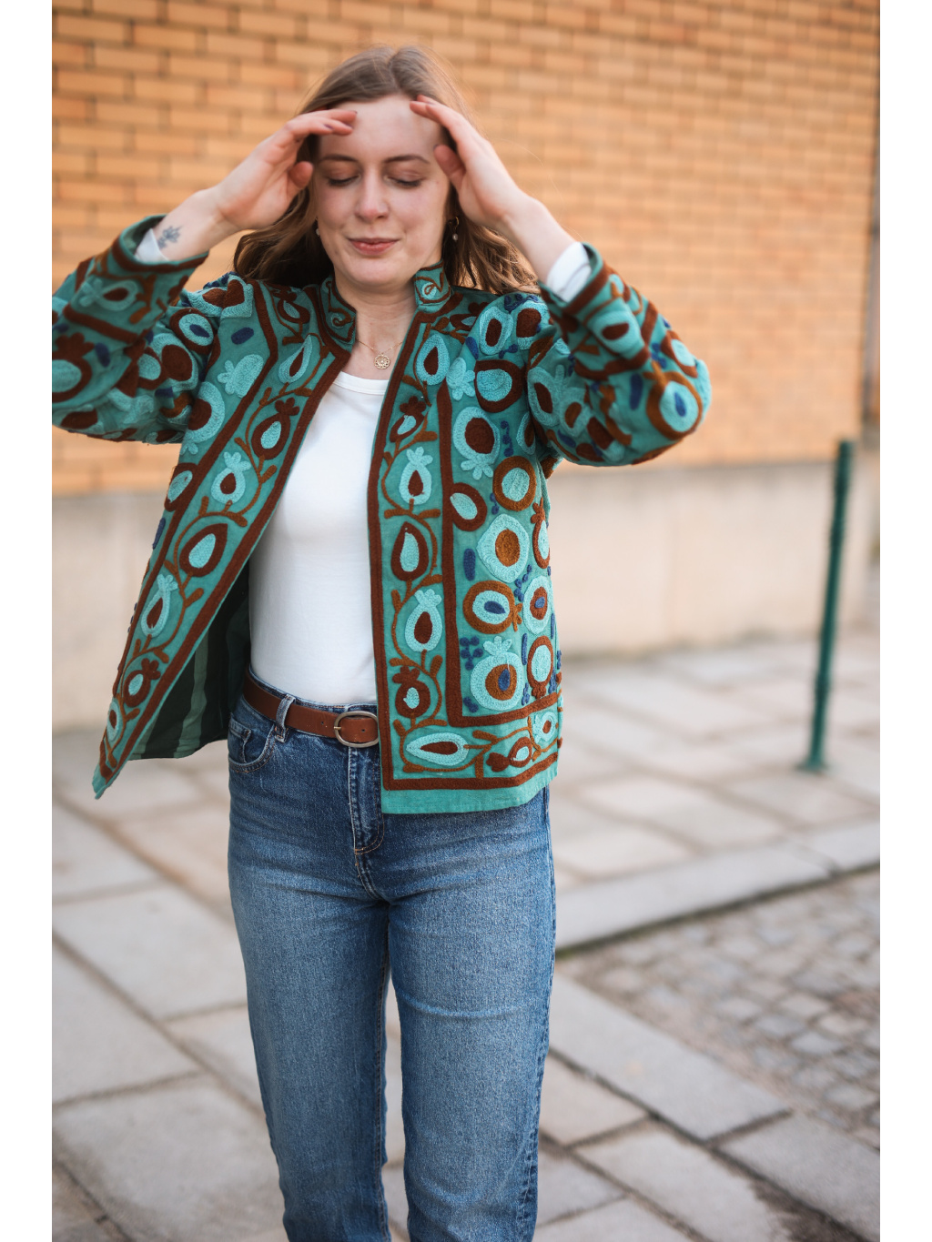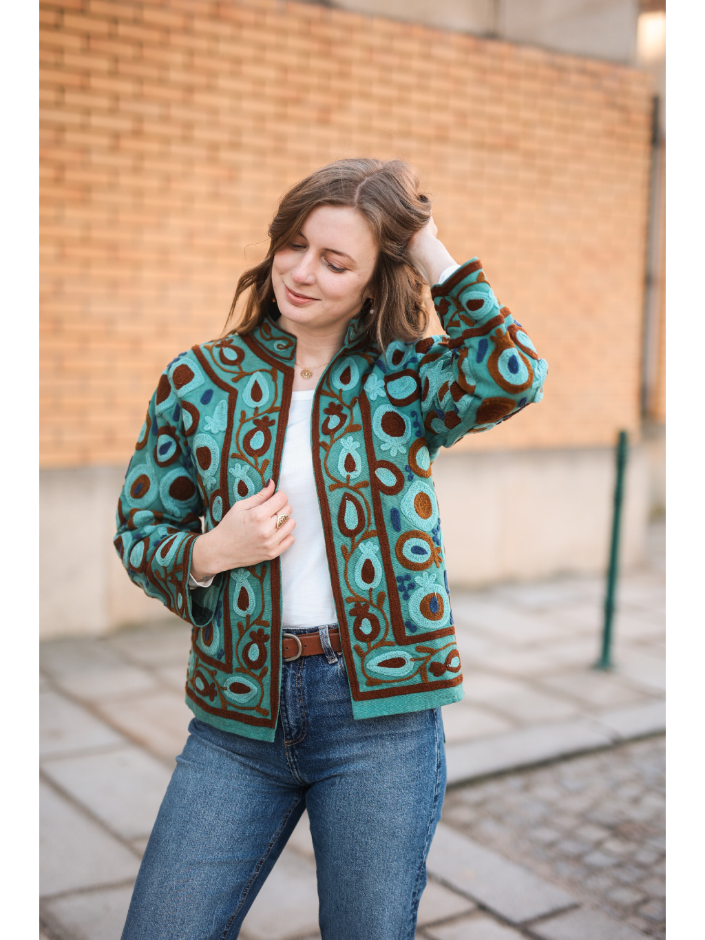 Jedinečnost: Výšivka vytváří nádhernou texturu a dělá z bundy dominantní prvek outfitu.