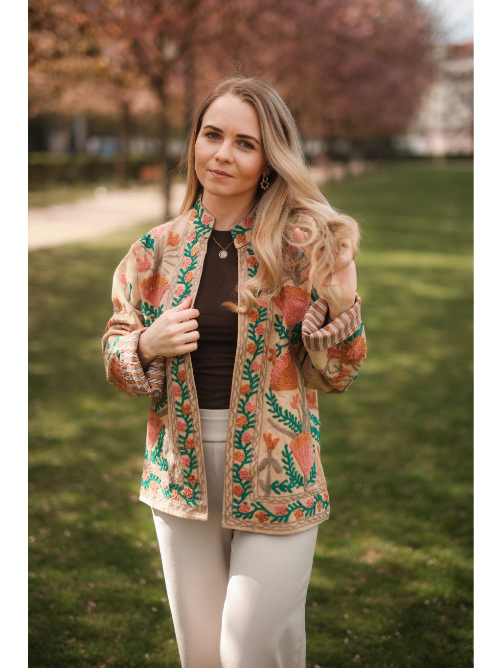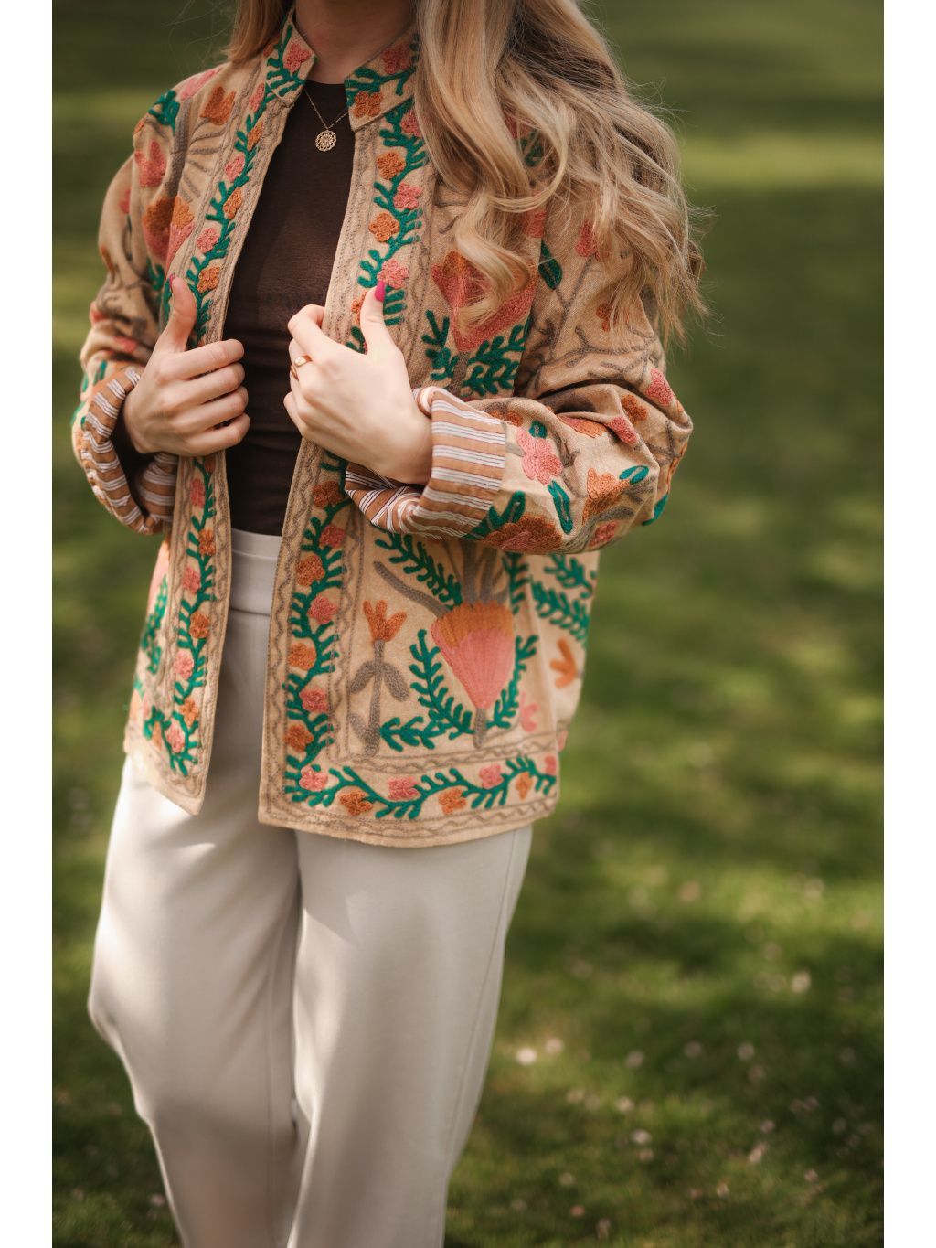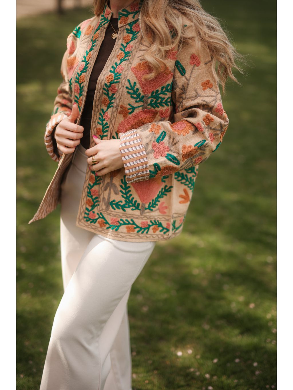 Ručně vyšívaná bundička z Indie ze 100% bavlny v béžové barvě protkaná originální květovou výšivkou v hnědo-růžových tónech se zelenými detaily. Originál pod značkou Bohyním. 🌿✨