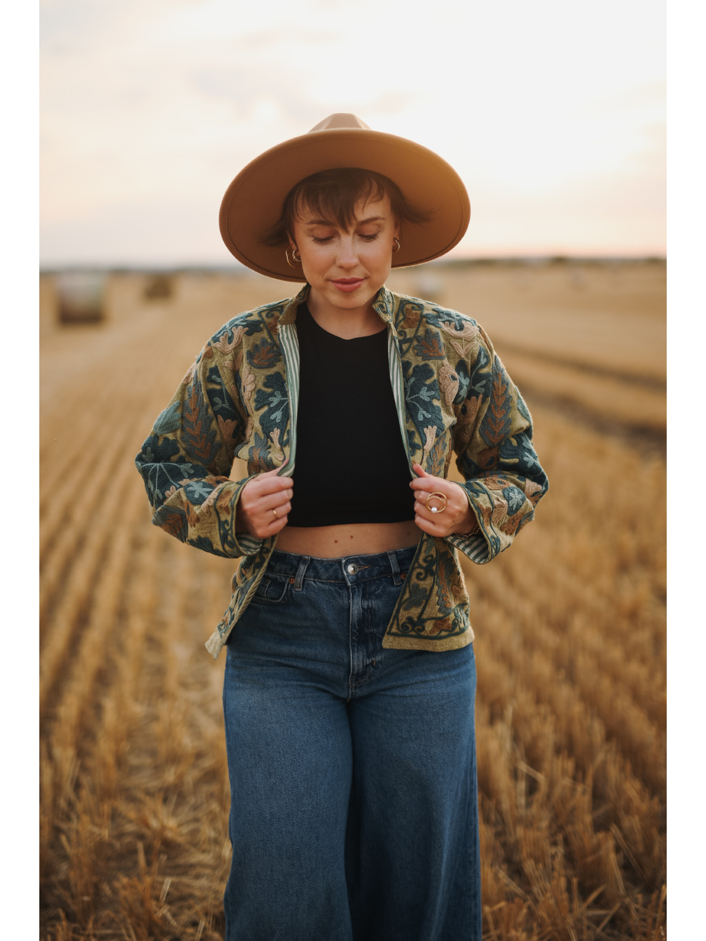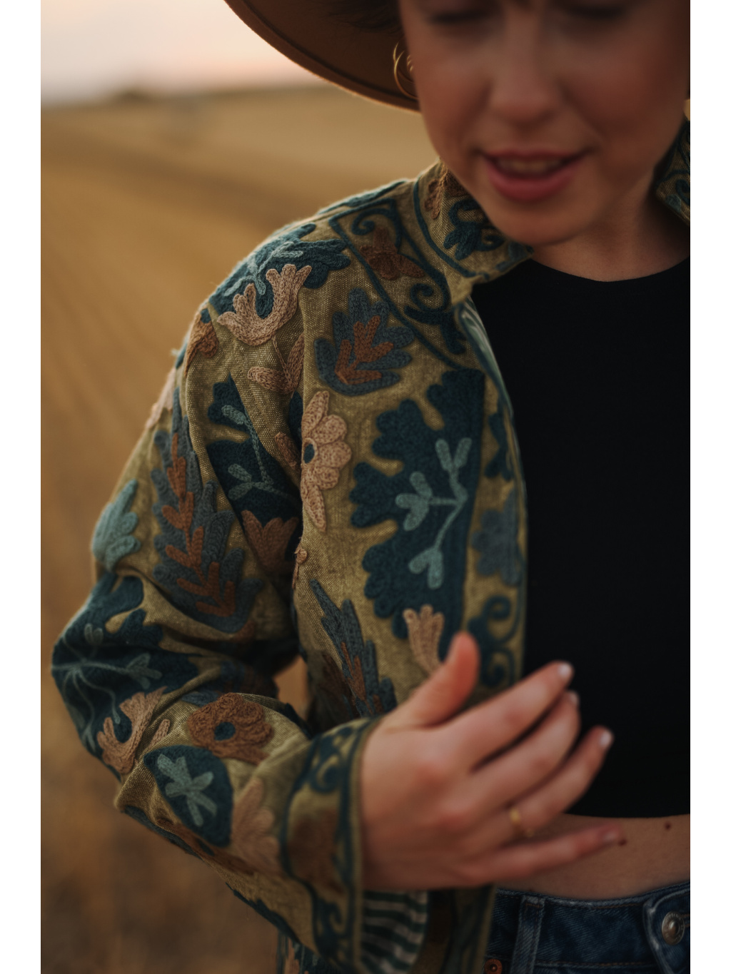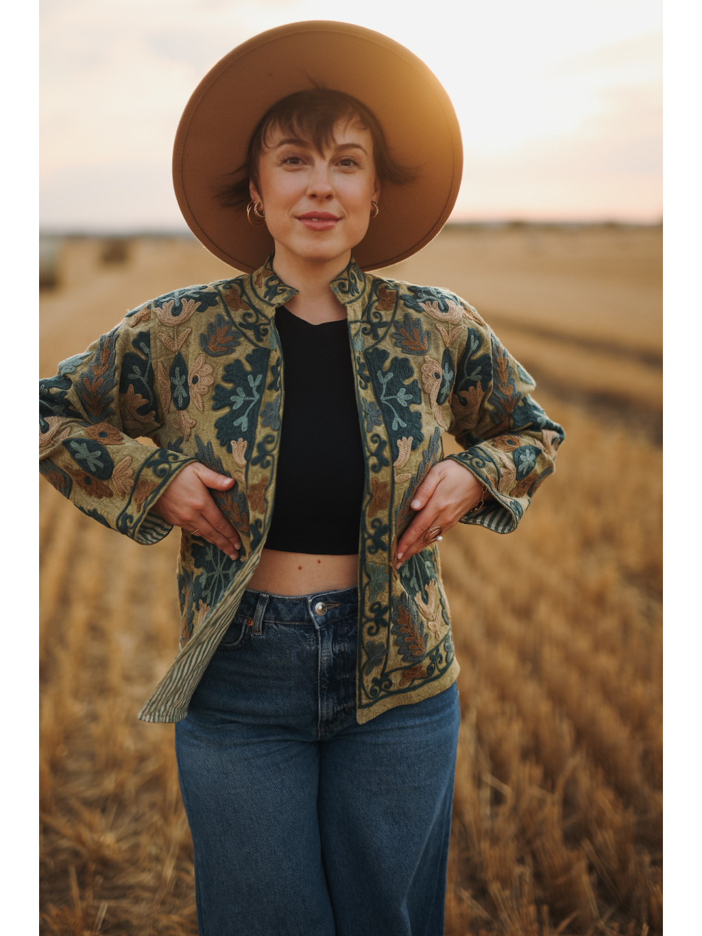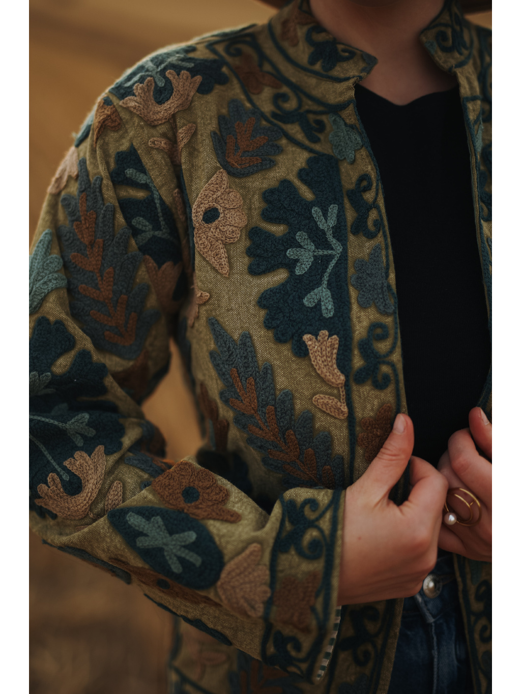 Ručně vyšívaná bunda z Indie ze 100% bavlny v pistáciově zeleném tónu s petrolejovými a hnědými květy. Originál pod značkou Bohyním. 🌿✨