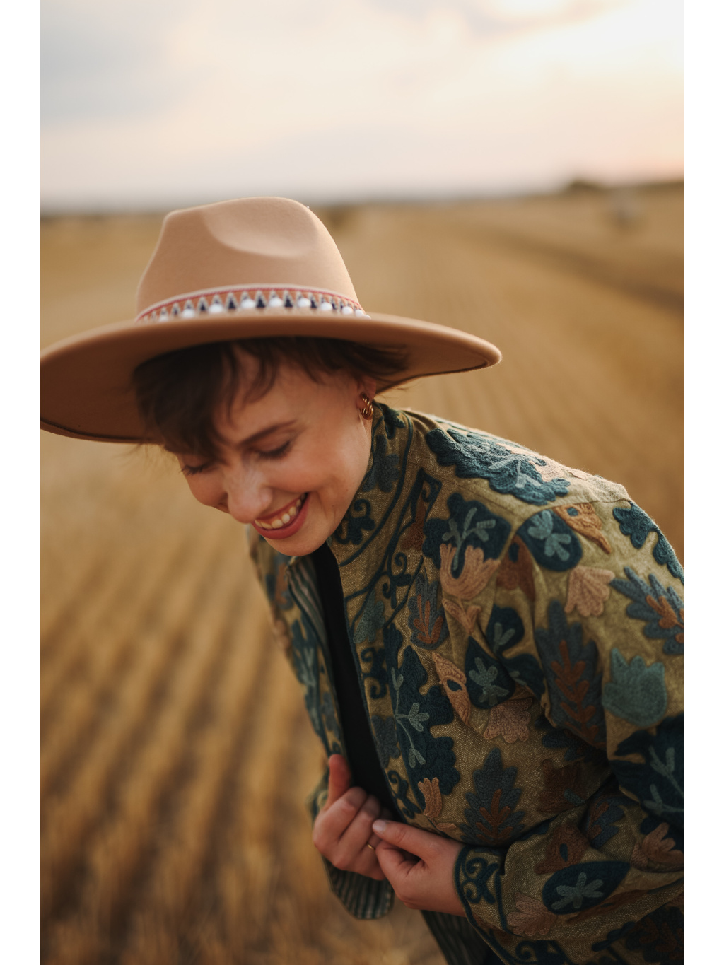 Tato bunda je dalším klenotem z naší kolekce ručně vyšívaných kousků, které vznikají v Indii pod značkou Bohyní. Je ušitá ze 100% bavlny a její základní pistáciově zelený tón působí svěže a hravě. Výšivku zdobí květy v petrolejové a hnědé barvě, které do bundy vnášejí přírodní hloubku a krásně ladí s jemným podkladem.