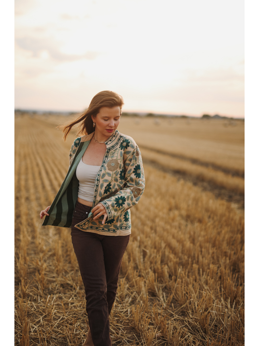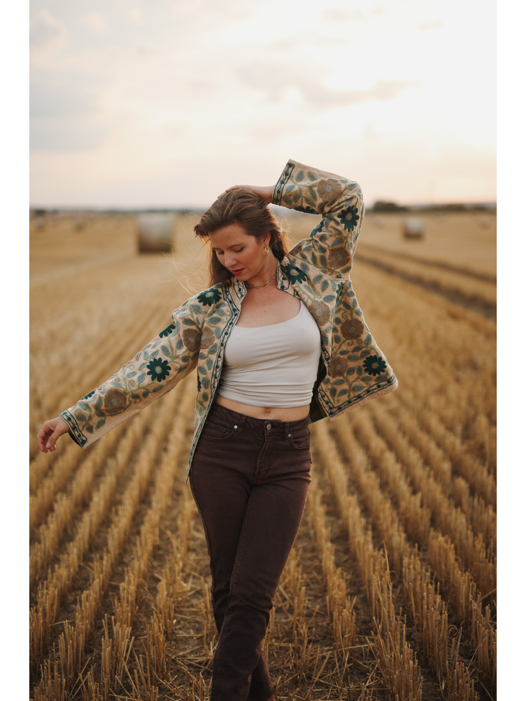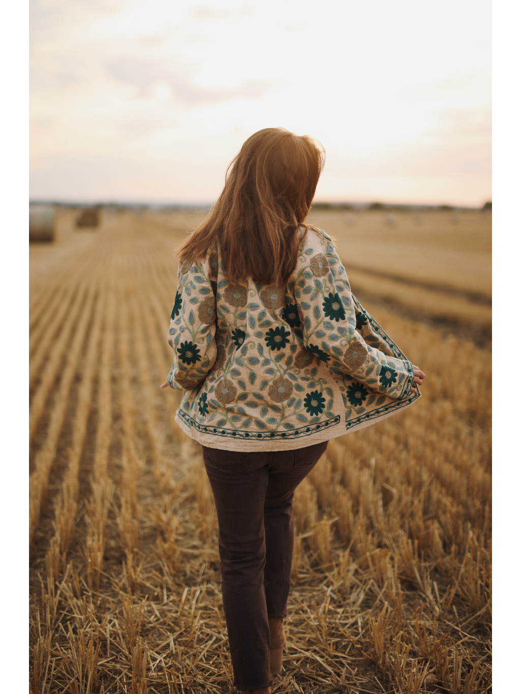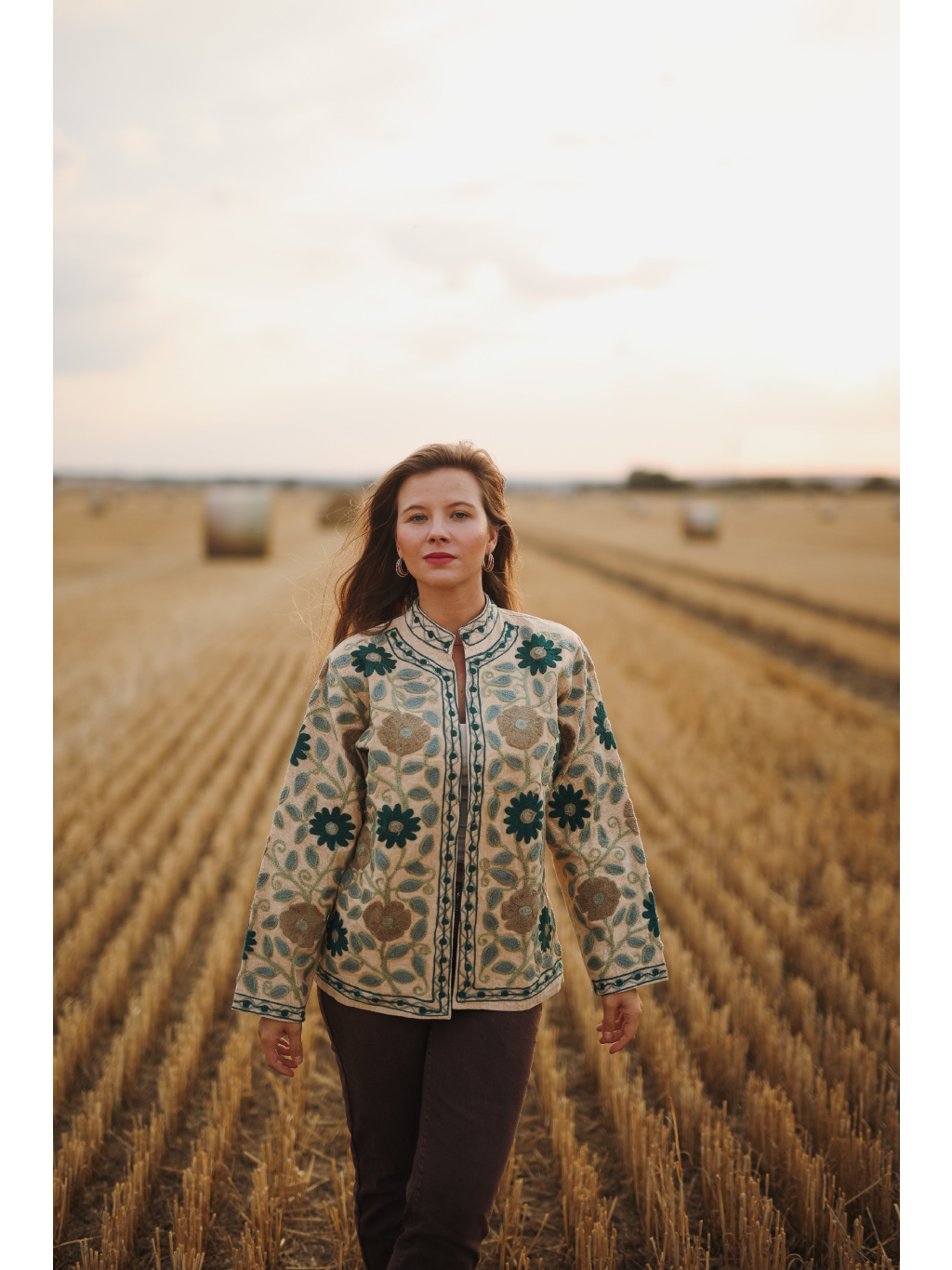 Díky svému univerzálnímu střihu se snadno kombinuje s šaty i kalhotami a stane se krásným vrchním kouskem pro každodenní nošení i speciální chvíle. Ruční výšivka nese autentické kouzlo – drobné nepravidelnosti nejsou chybou, ale důkazem její originality.
