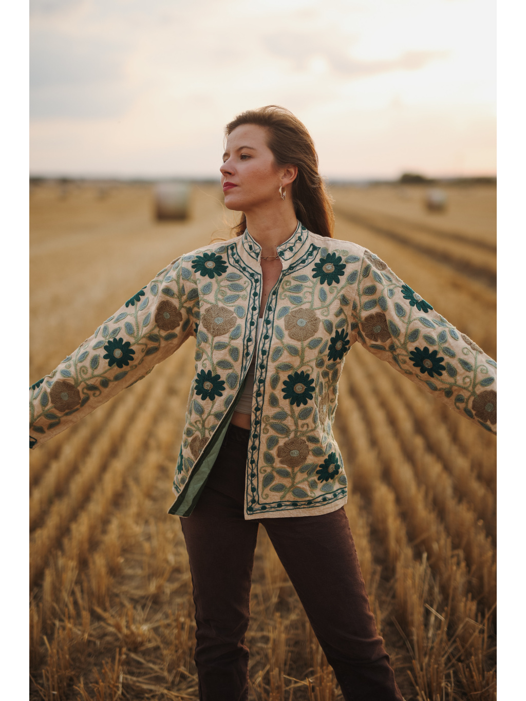 Tato ručně vyšívaná bunda pochází z Indie a je ušitá ze 100% bavlny pod značkou Bohyním. Její jemný béžový základ působí přirozeně a nadčasově, zatímco výšivka v modrých tónech květů a drobných lístků jí dodává svěží a romantický charakter.