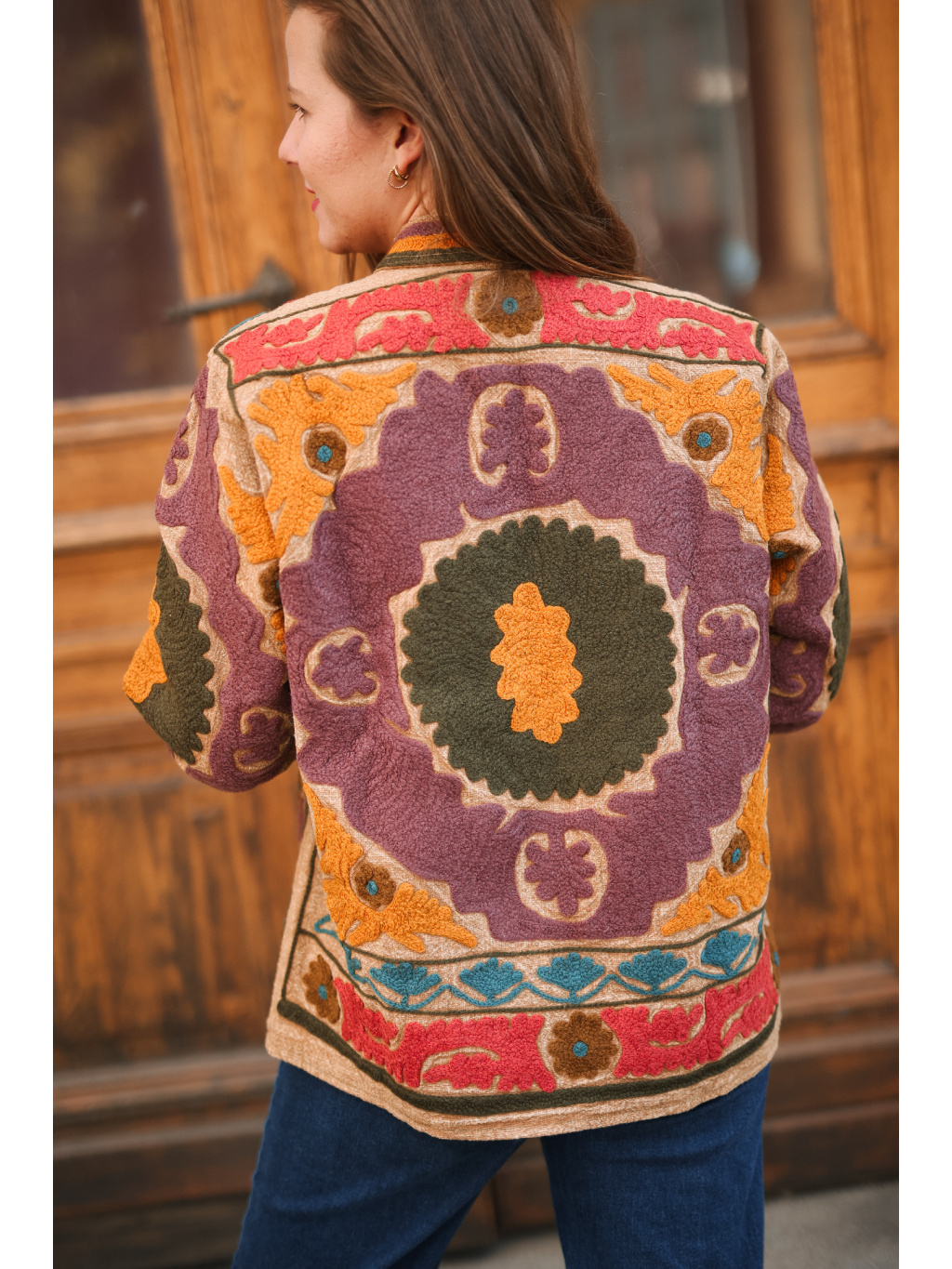Ručně vyšívaná bavlněná bunda v sytých podzimních tónech zlaté, vínové a olivové. Výrazná, hřejivá a naprosto jedinečná — stejně jako vy. ✨