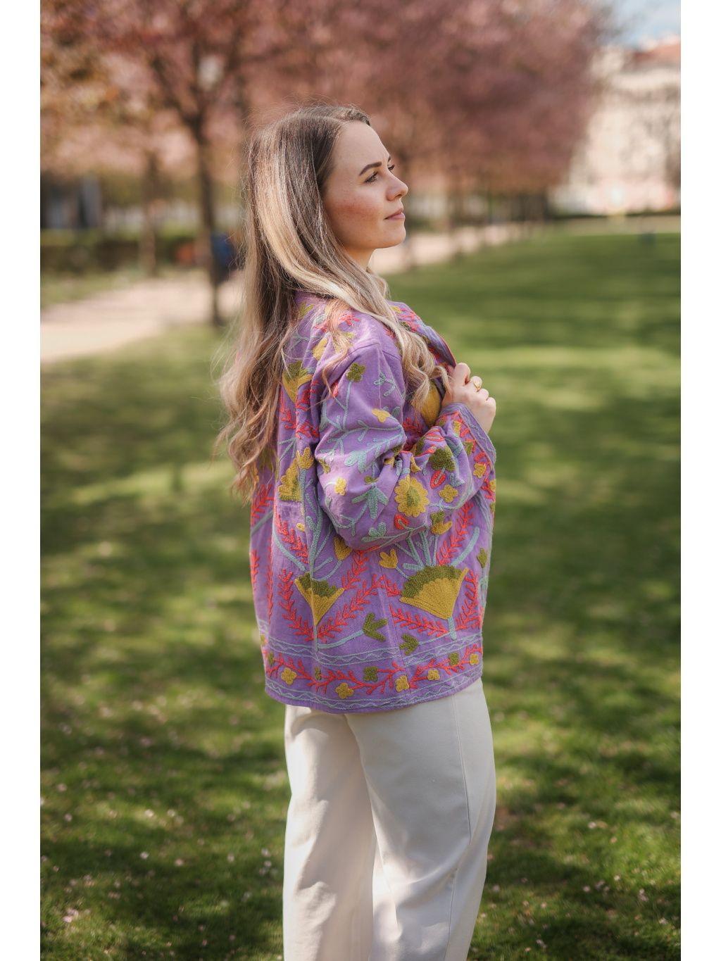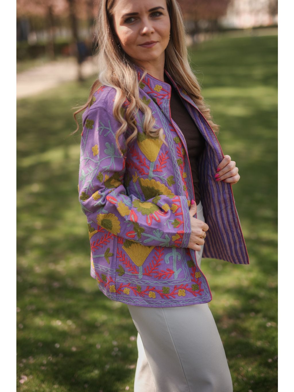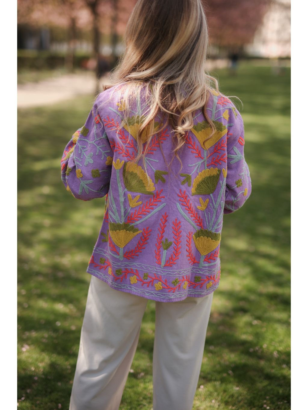 Ručně vyšívaná bundička z Indie ze 100% bavlny v zářivém levandulovém odstínu s hravou limetkovou výšivkou, která dodá vašemu dni barvy a energii. Originál pod značkou Bohyním. 🌿✨