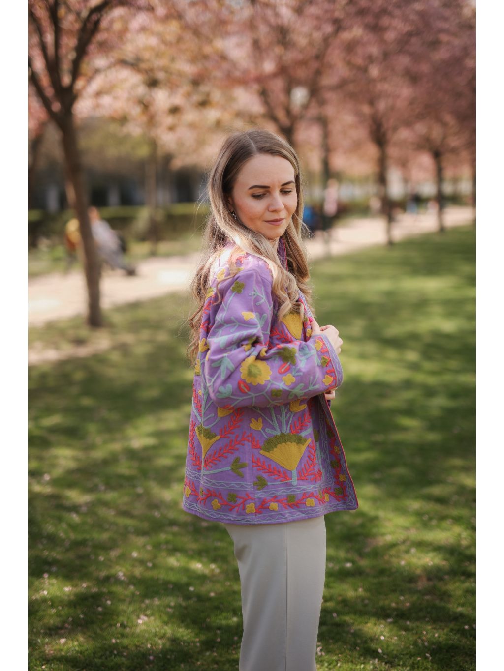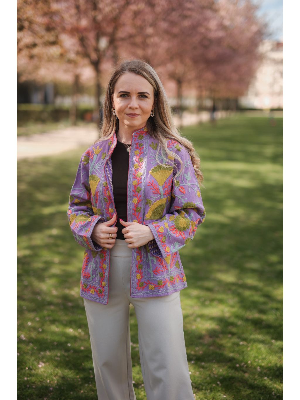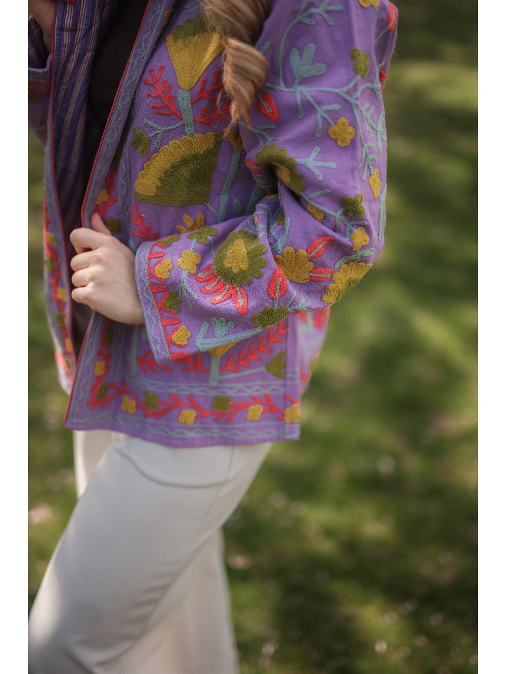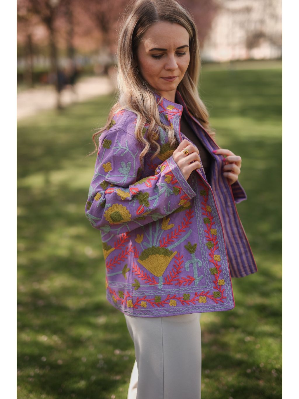 Ručně vyšívaná bundička z Indie ze 100% bavlny v zářivém levandulovém odstínu s hravou limetkovou výšivkou, která dodá vašemu dni barvy a energii. Originál pod značkou Bohyním. 🌿✨