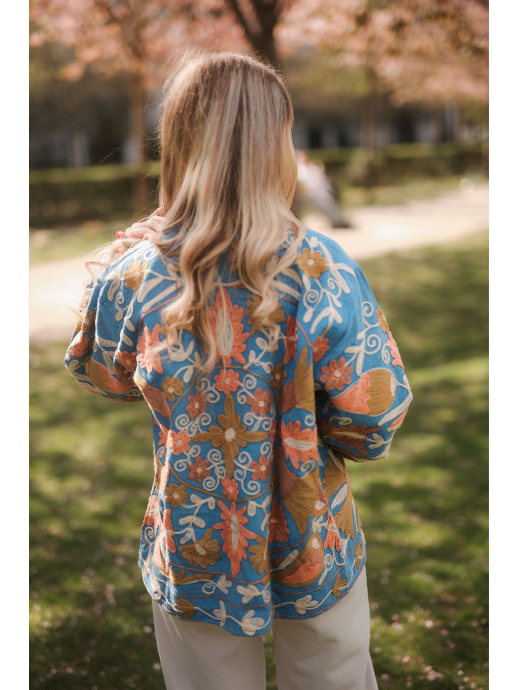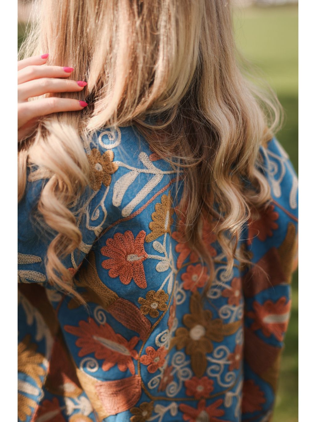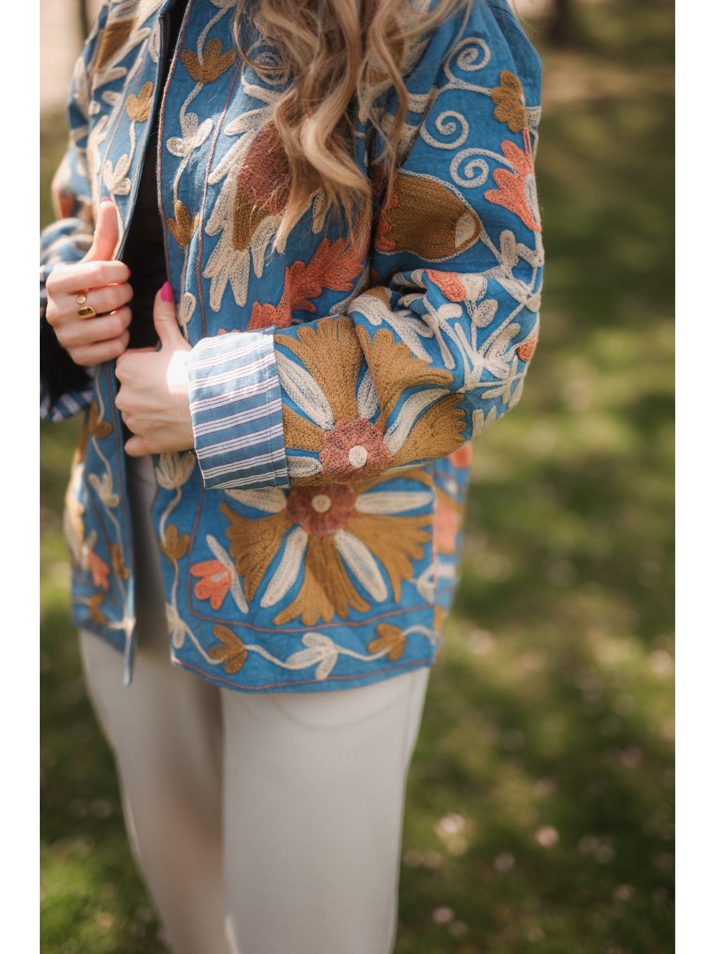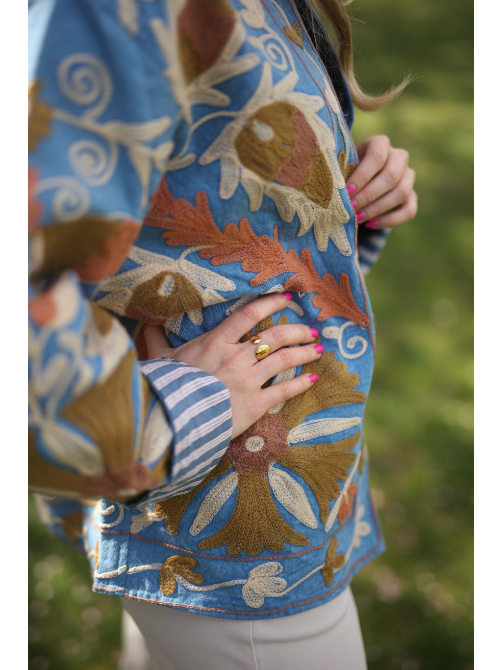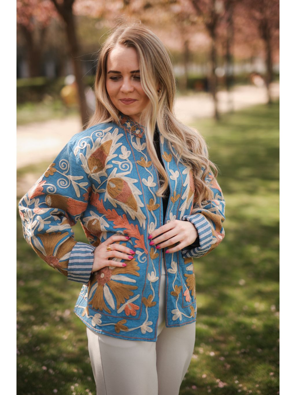 Ručně vyšívaná bundička z Indie ze 100% bavlny v jemně modré barvě protkaná originální výšivkou béžovými a hnědými květy. Originál pod značkou Bohyním. 🌿✨