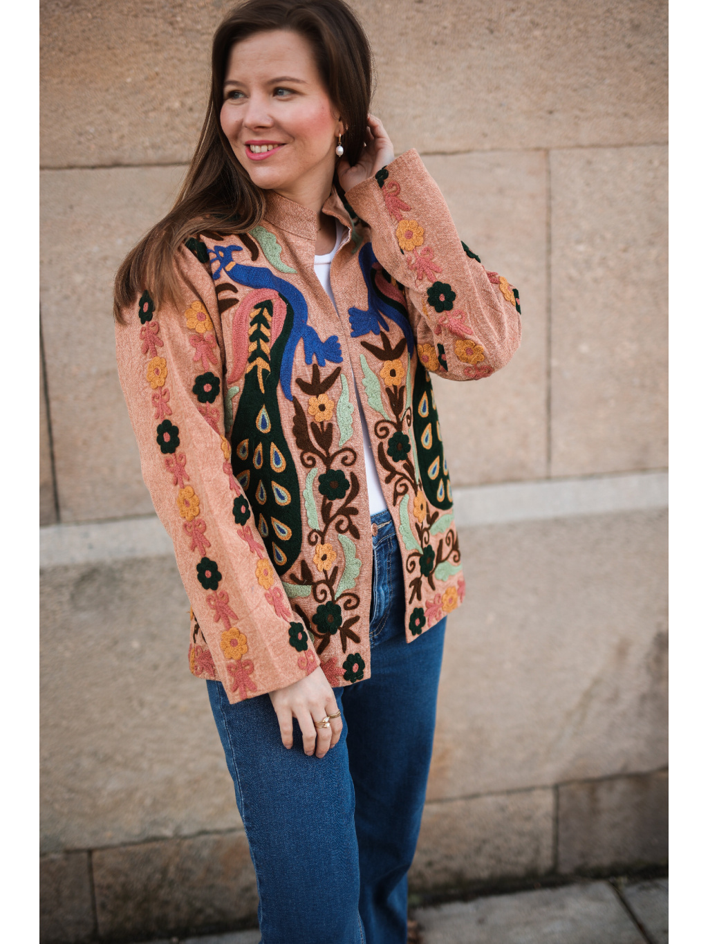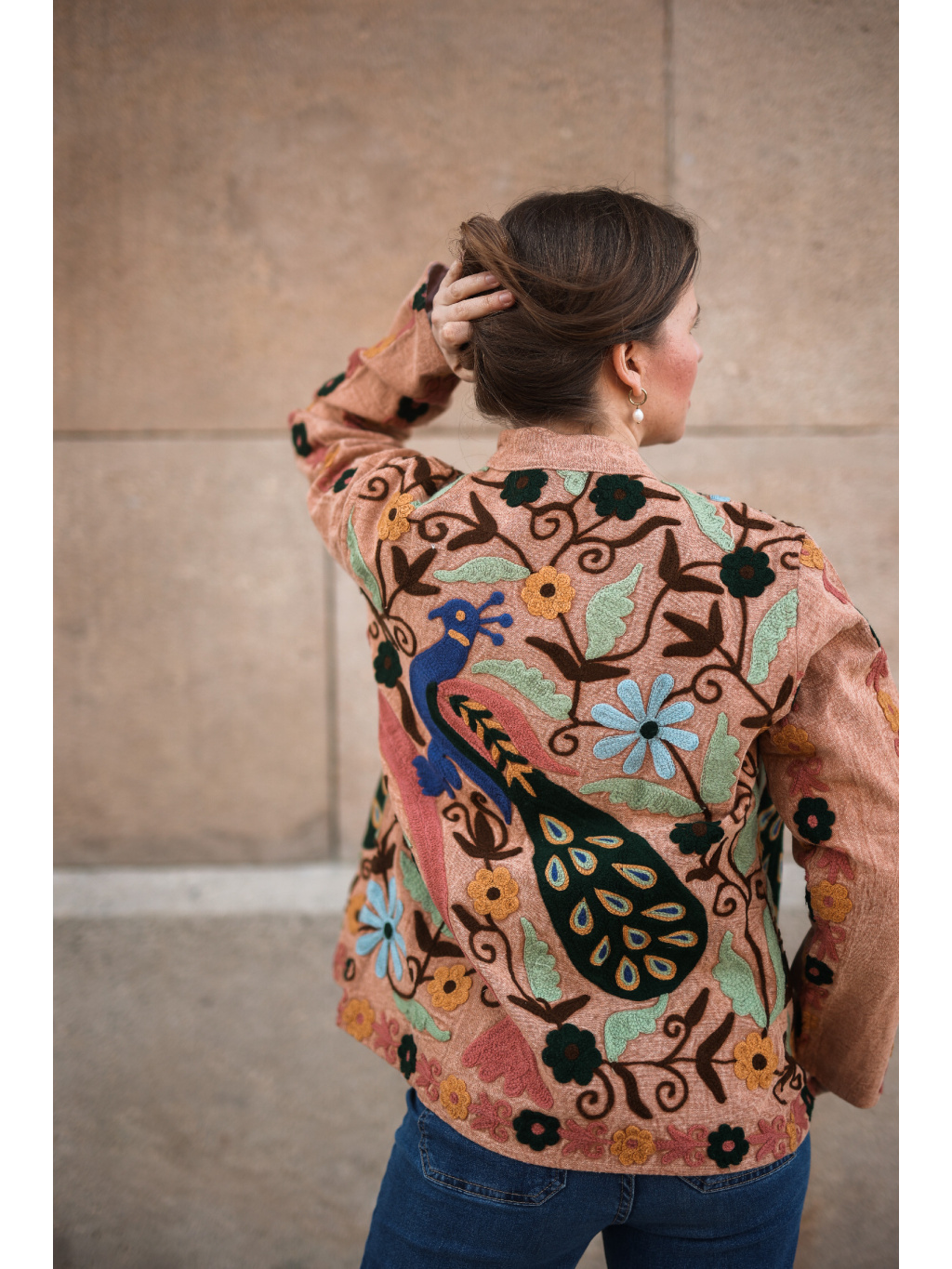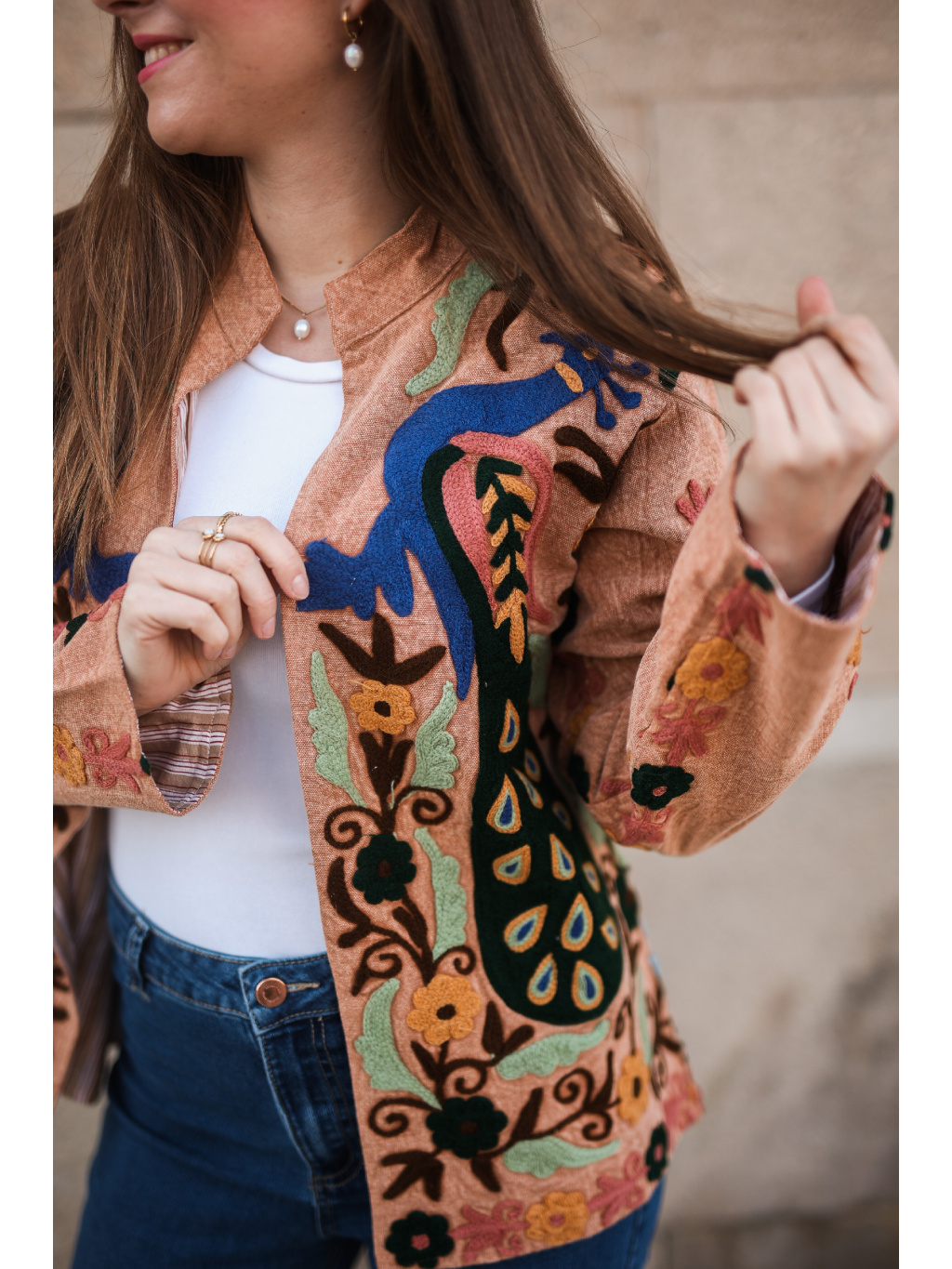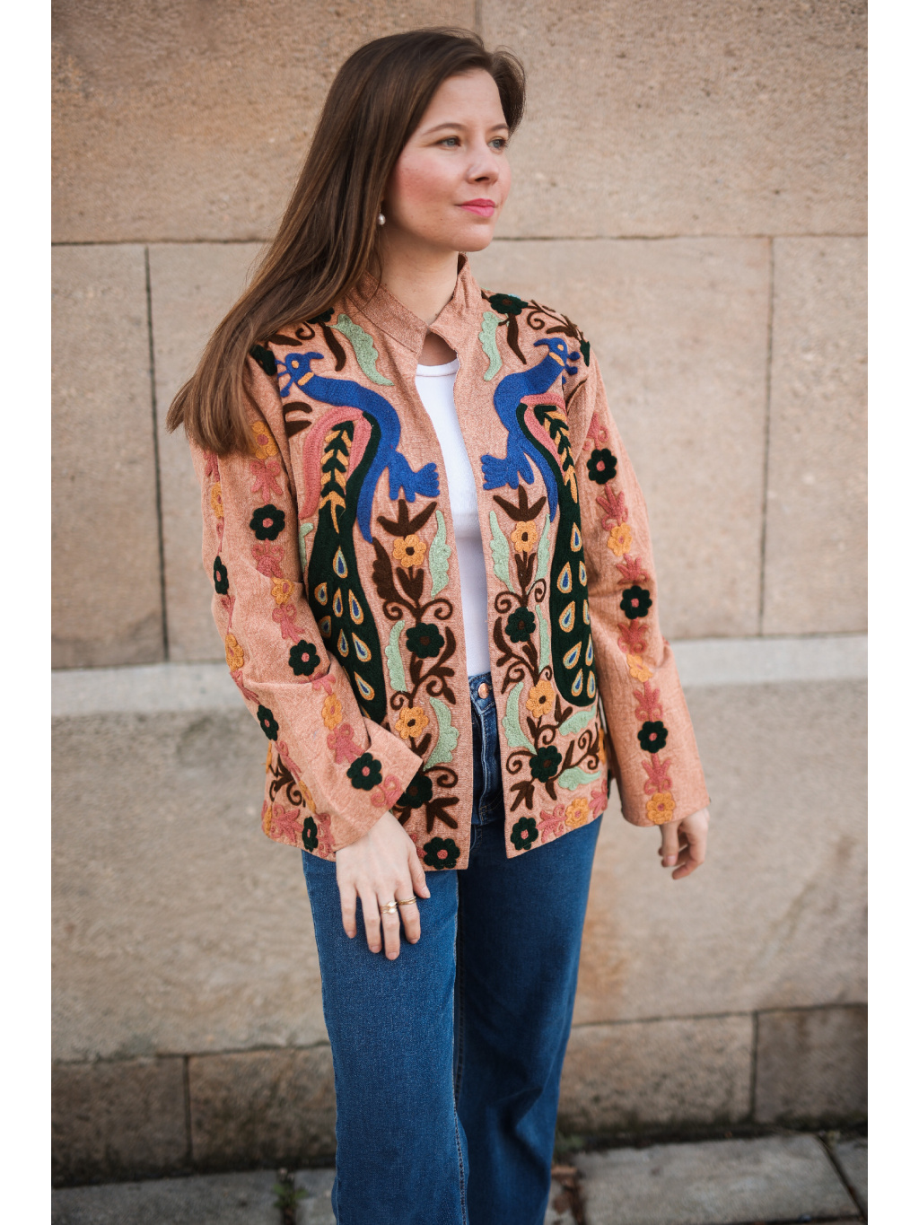 Bavlněná bundička v jemných pudrových tónech s tyrkysovými detaily a motivem pávů. Dokonale sedící střih a něžný vzor z ní dělají snový originál, který zjemní každý Váš outfit. 🌸🦚