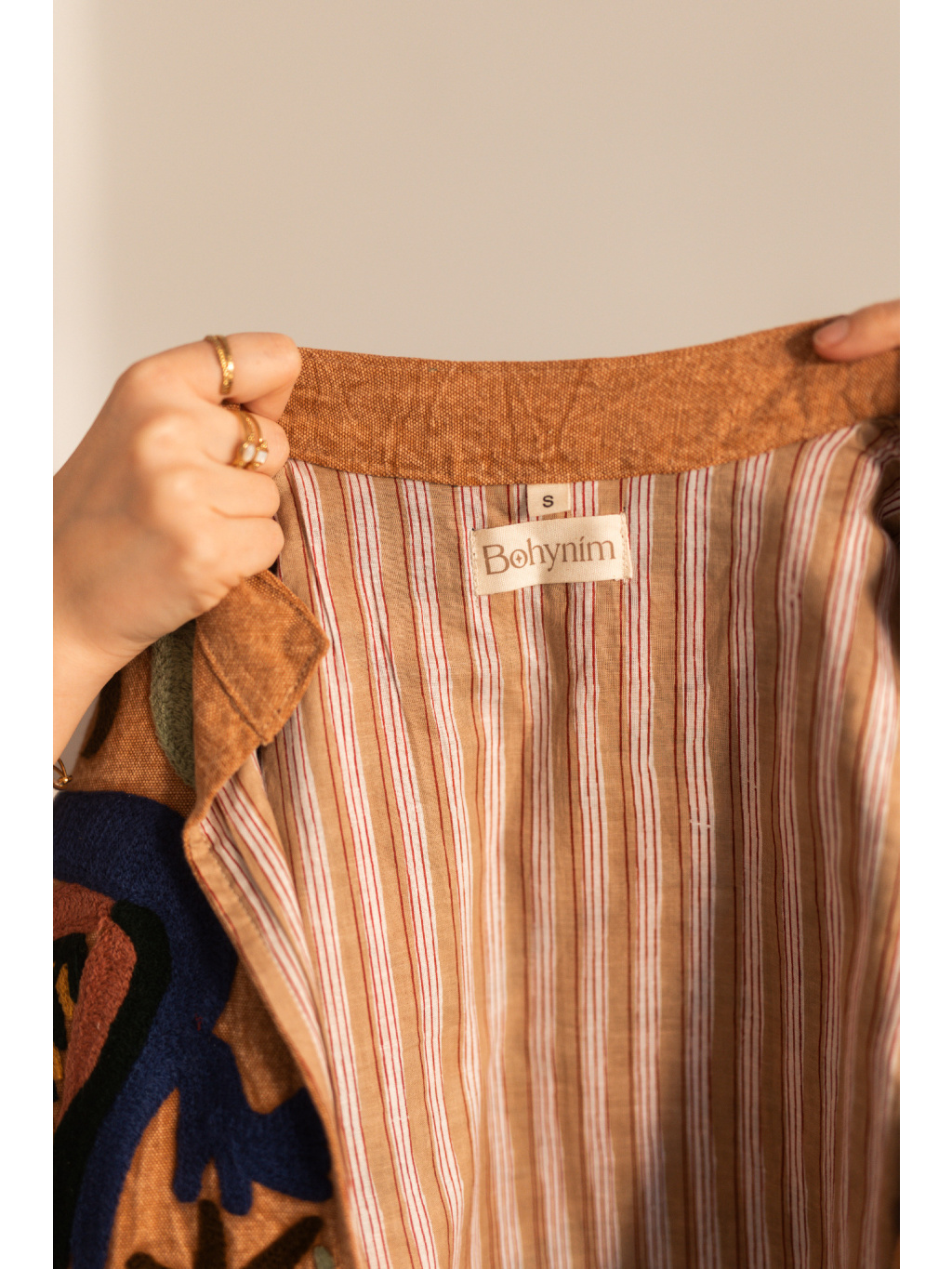 Hlavní předností našich bundiček je jejich perfektní střih (fit). Ve velikosti S krásně podtrhne postavu, drží tvar a okamžitě dodá Vašemu vzhledu šarm. Díky unikátnímu zpracování je každá jedna bunda naprostý originál – nenajdete dva stejné kusy, což z ní dělá skutečný poklad ve Vašem šatníku. Je neuvěřitelně jednoduše kombinovatelná; skvěle se hodí k světlým šatům, ale i k jednoduchým kalhotám, kterým dodá nádech orientálního luxusu.