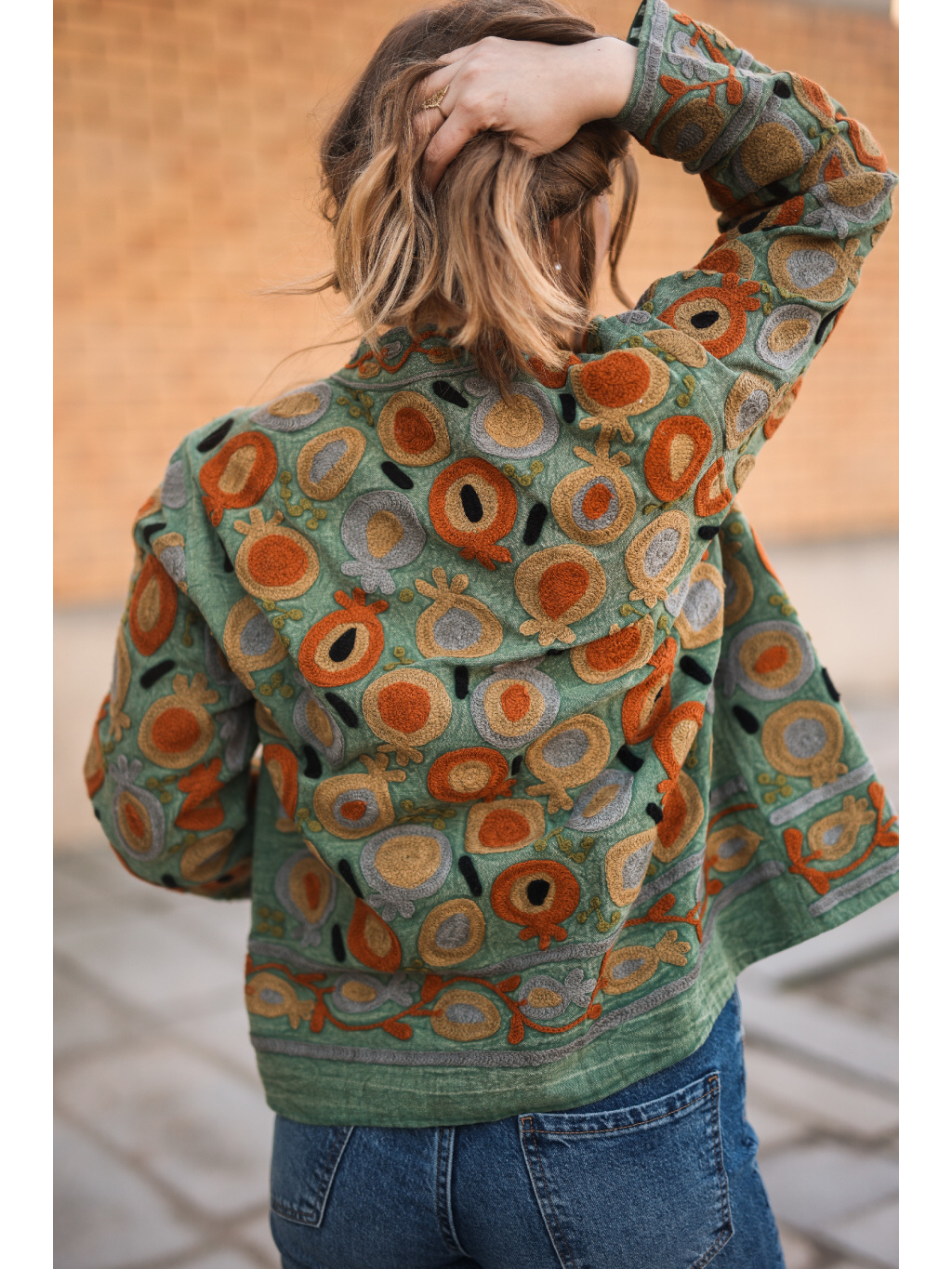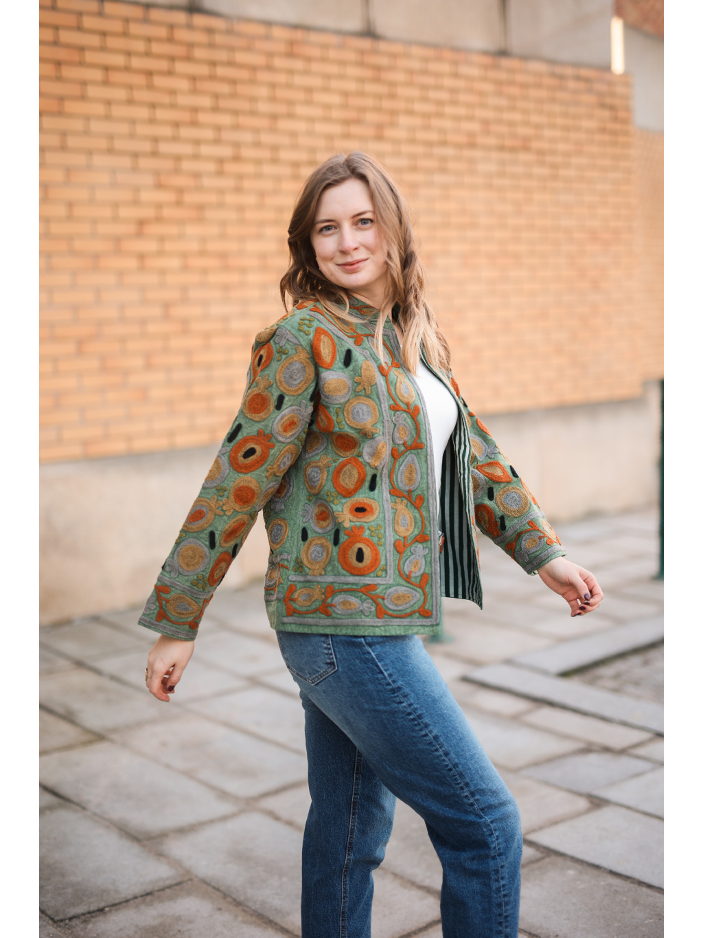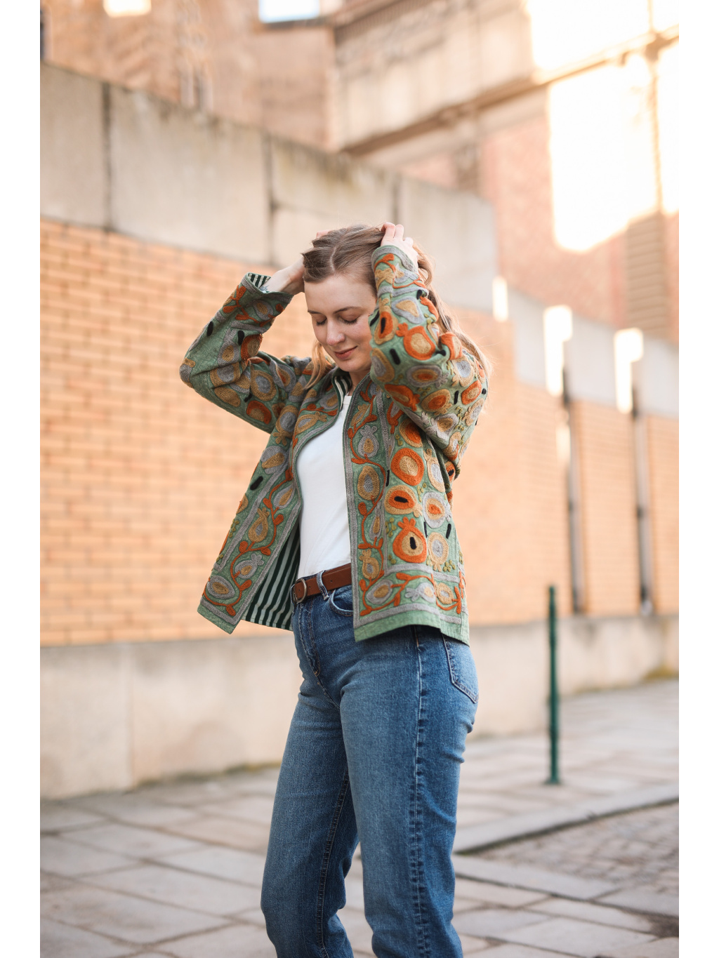 Kromě krásného vizuálu je její největší předností vyladěný střih (fit). I ve velikosti L bunda krásně drží tvar, lichotí postavě a působí velmi upraveně. Díky unikátnímu ručnímu zpracování je každý kus originálem. Je neuvěřitelně univerzální – skvěle doplní jednobarevné šaty, ale stejně tak pozvedne i ležérní outfit s kalhotami.