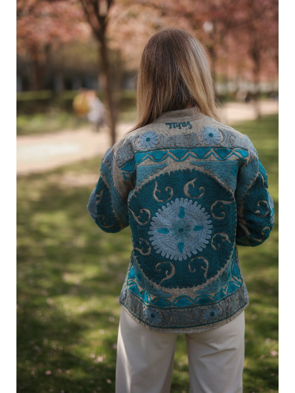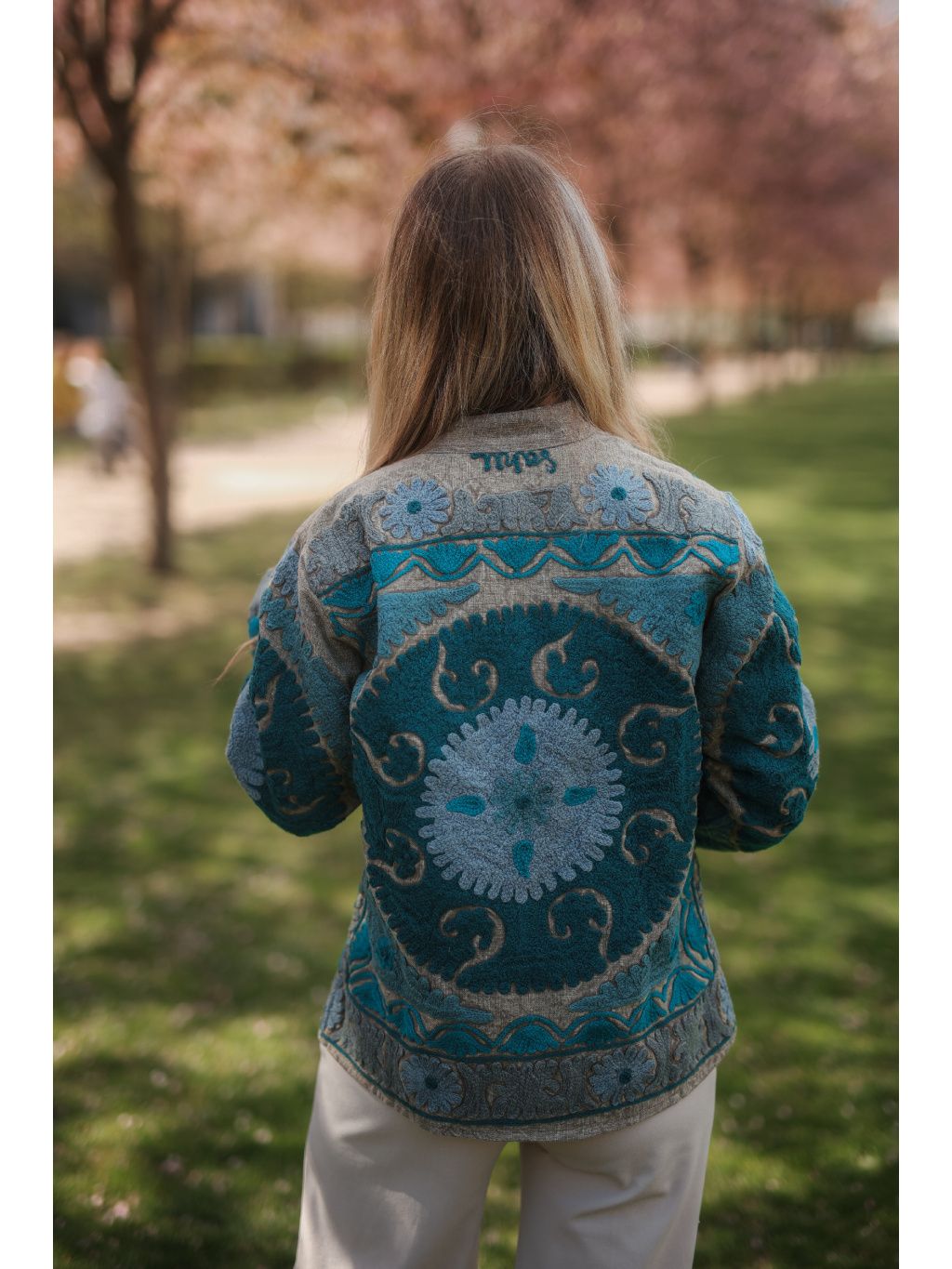 Ručně vyšívaná bundička z Indie ze 100% bavlny v přírodním režném odstínu se zářivou tyrkysovou mandalou, která přináší svěžest a sílu orientu. Originál pod značkou Bohyním. 🌿✨