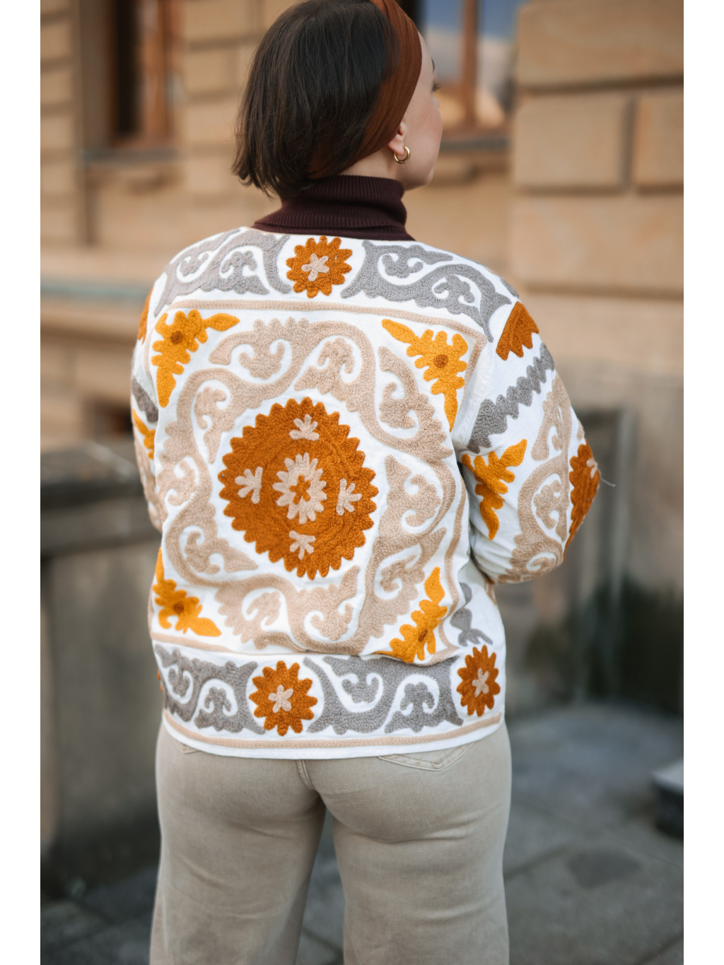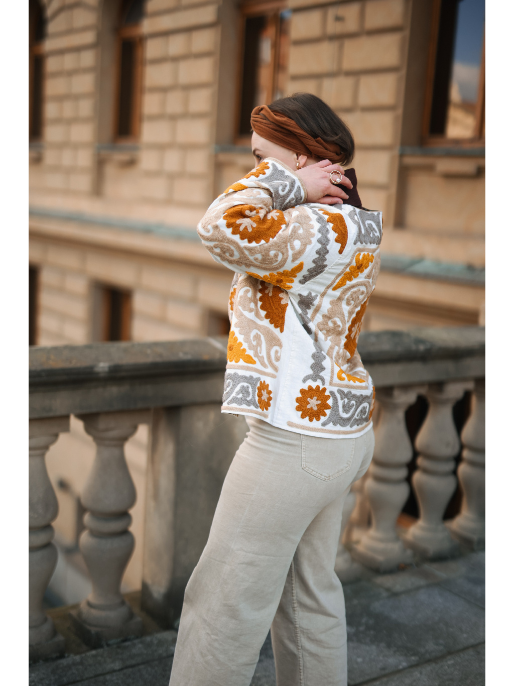 Hřejivá ručně vyšívaná bunda v odstínech medové, karamelové a šedé. Připomíná poslední zlaté dny podzimu – jemná, ženská, ale s duší bohyně. 🍯🌾