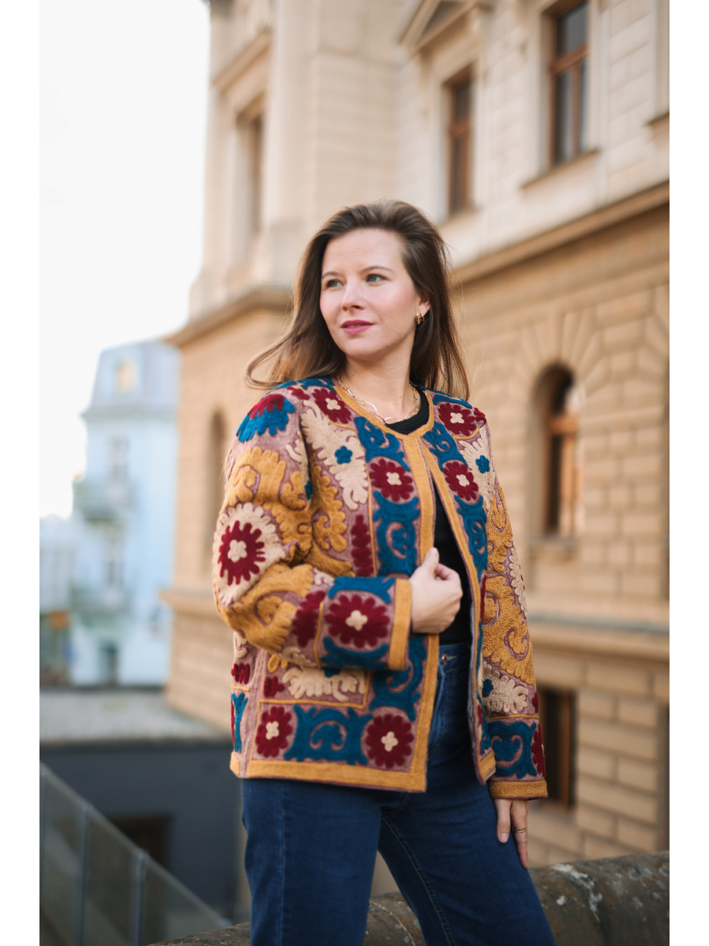 Díky svému univerzálnímu střihu se snadno kombinuje s šaty i kalhotami a stane se krásným vrchním kouskem pro každodenní nošení i speciální chvíle. Ruční výšivka nese autentické kouzlo – drobné nepravidelnosti nejsou chybou, ale důkazem její originality.