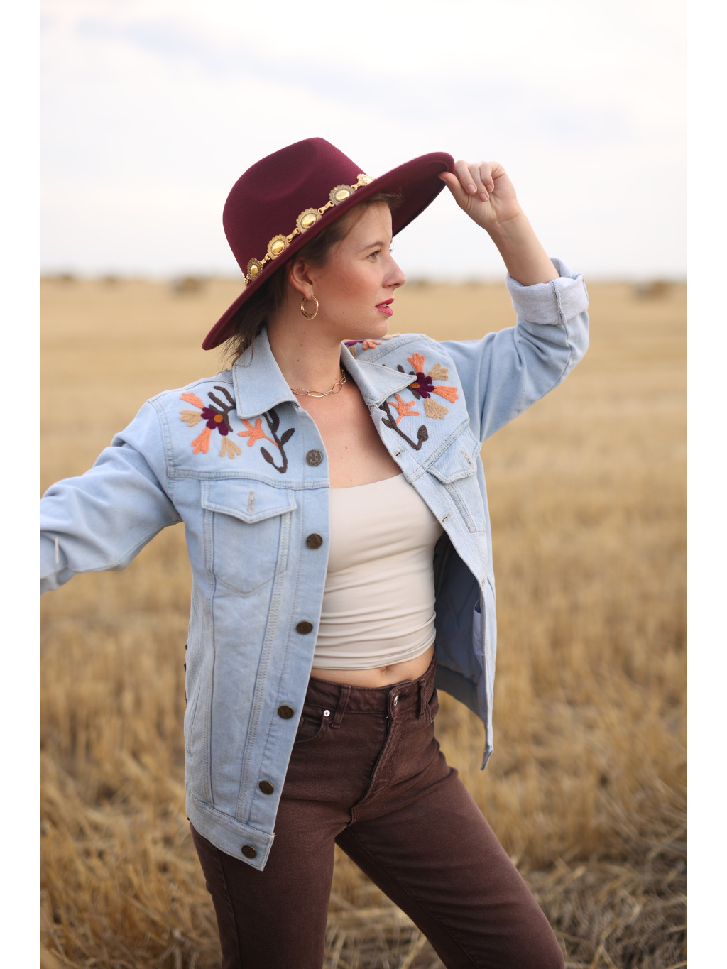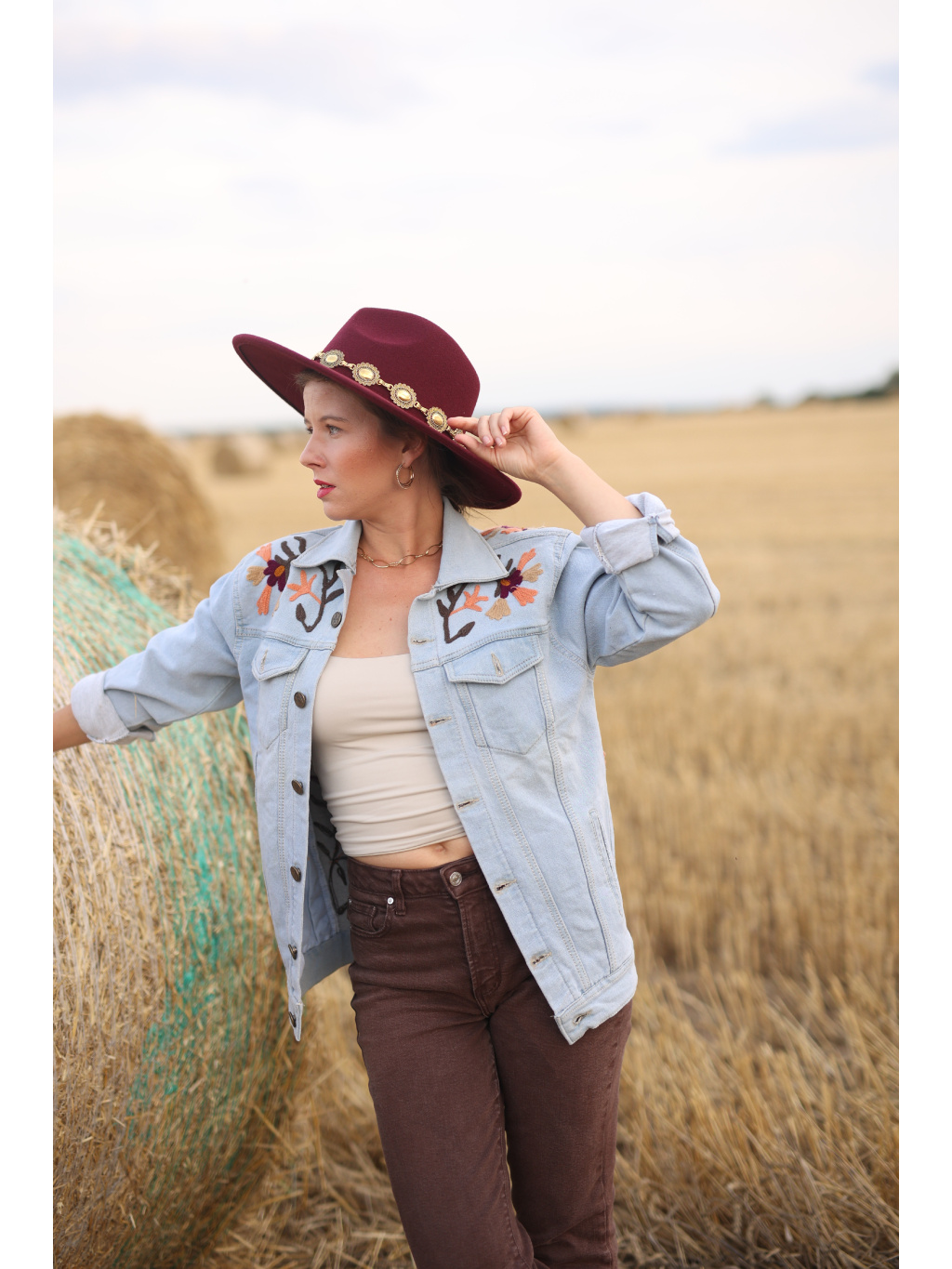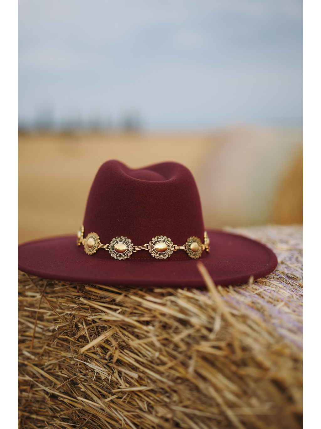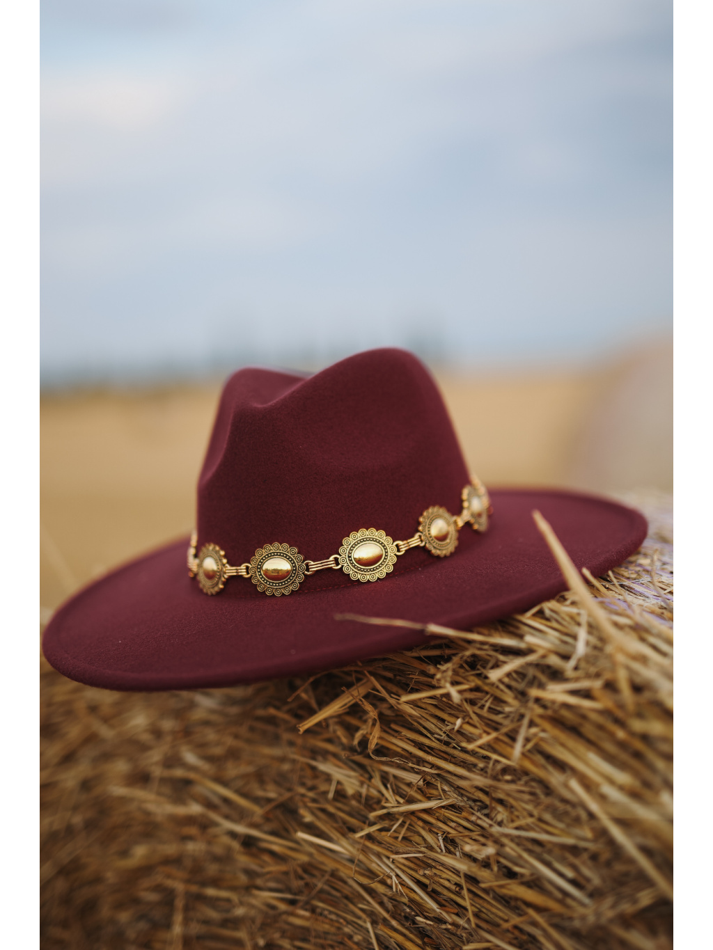 Vínový klobouk ByOcean se zlatým detailem. Lehký nádech kovbojského stylu a univerzální velikost díky praktické tkaničce uvnitř. 🤎✨