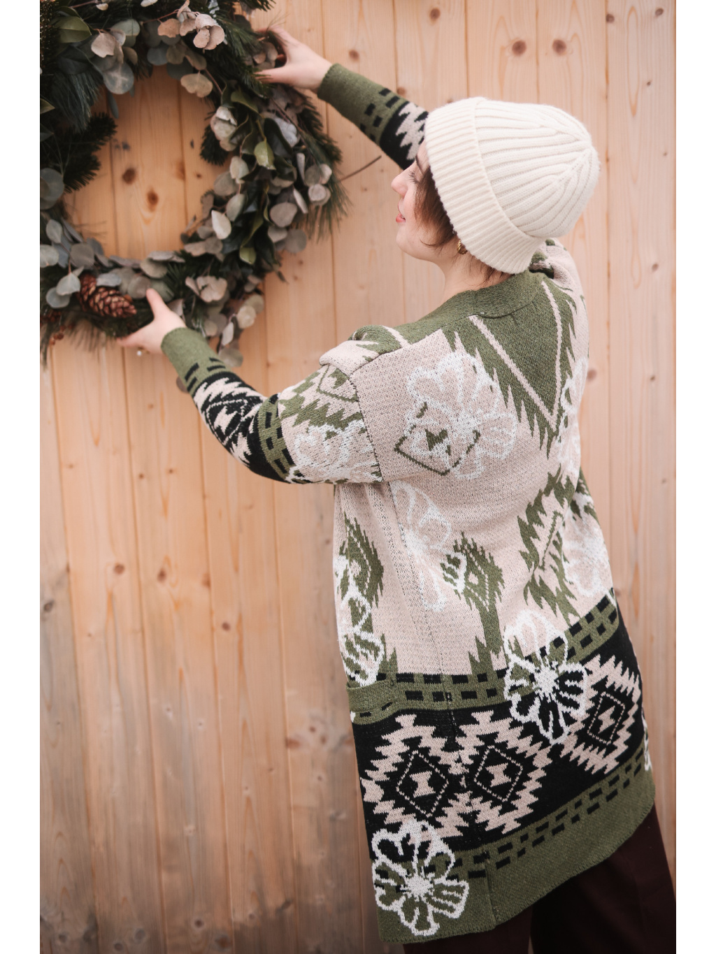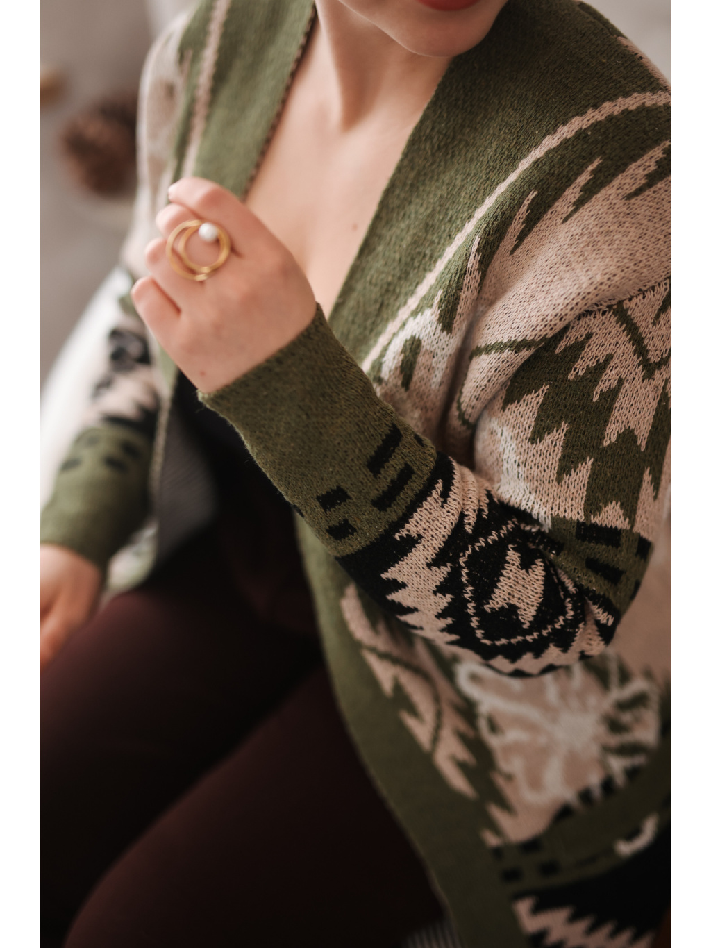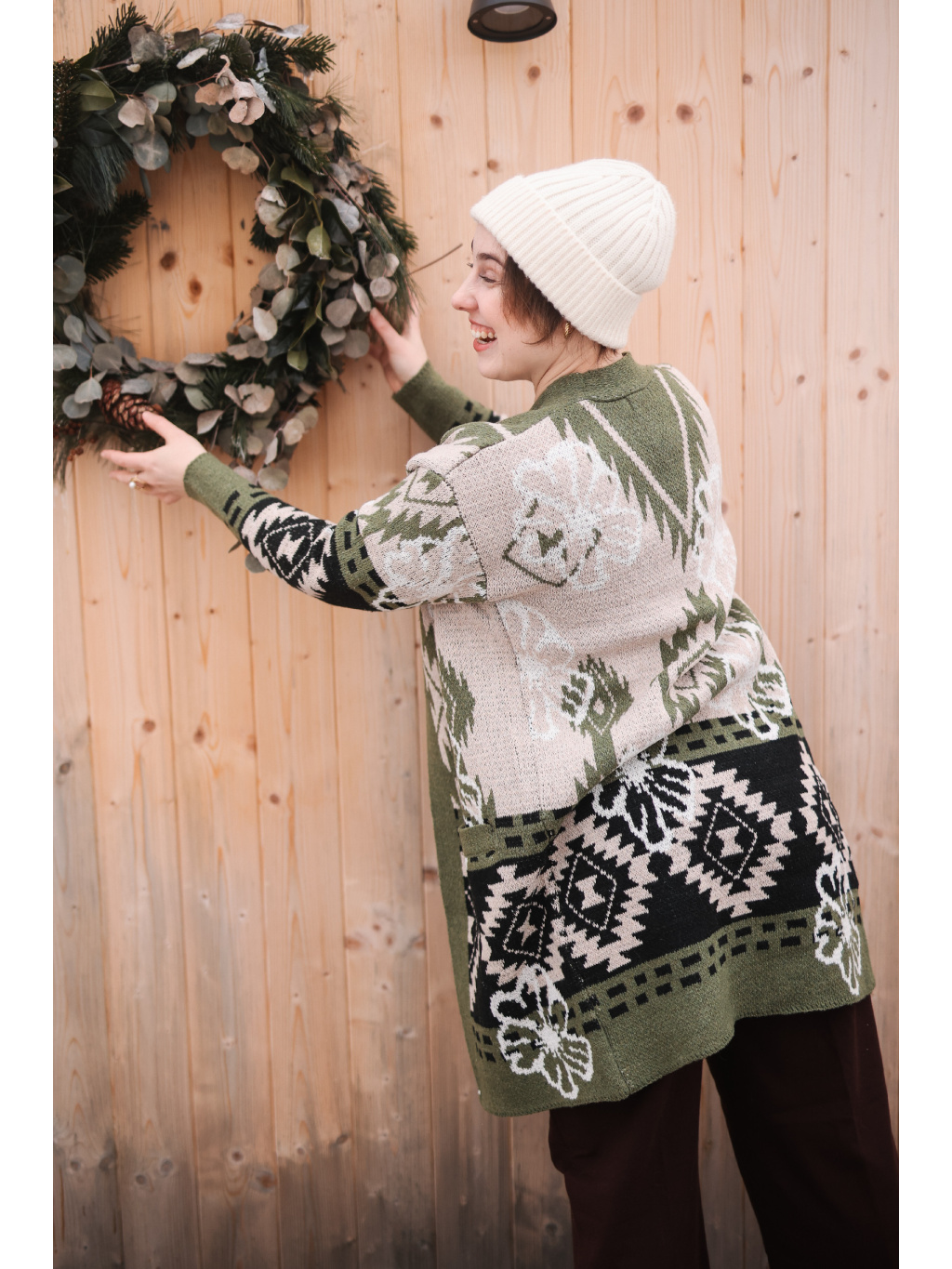Originální vzorovaný kardigan, který nenechá nikoho na pochybách, že právě přišla žena plná inspirující energie a radosti.