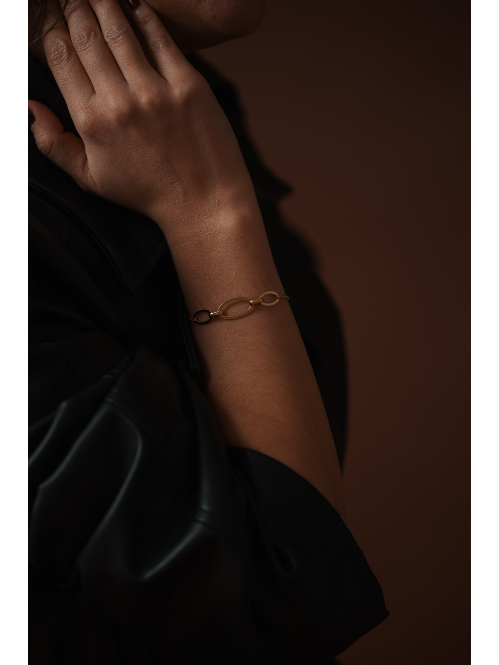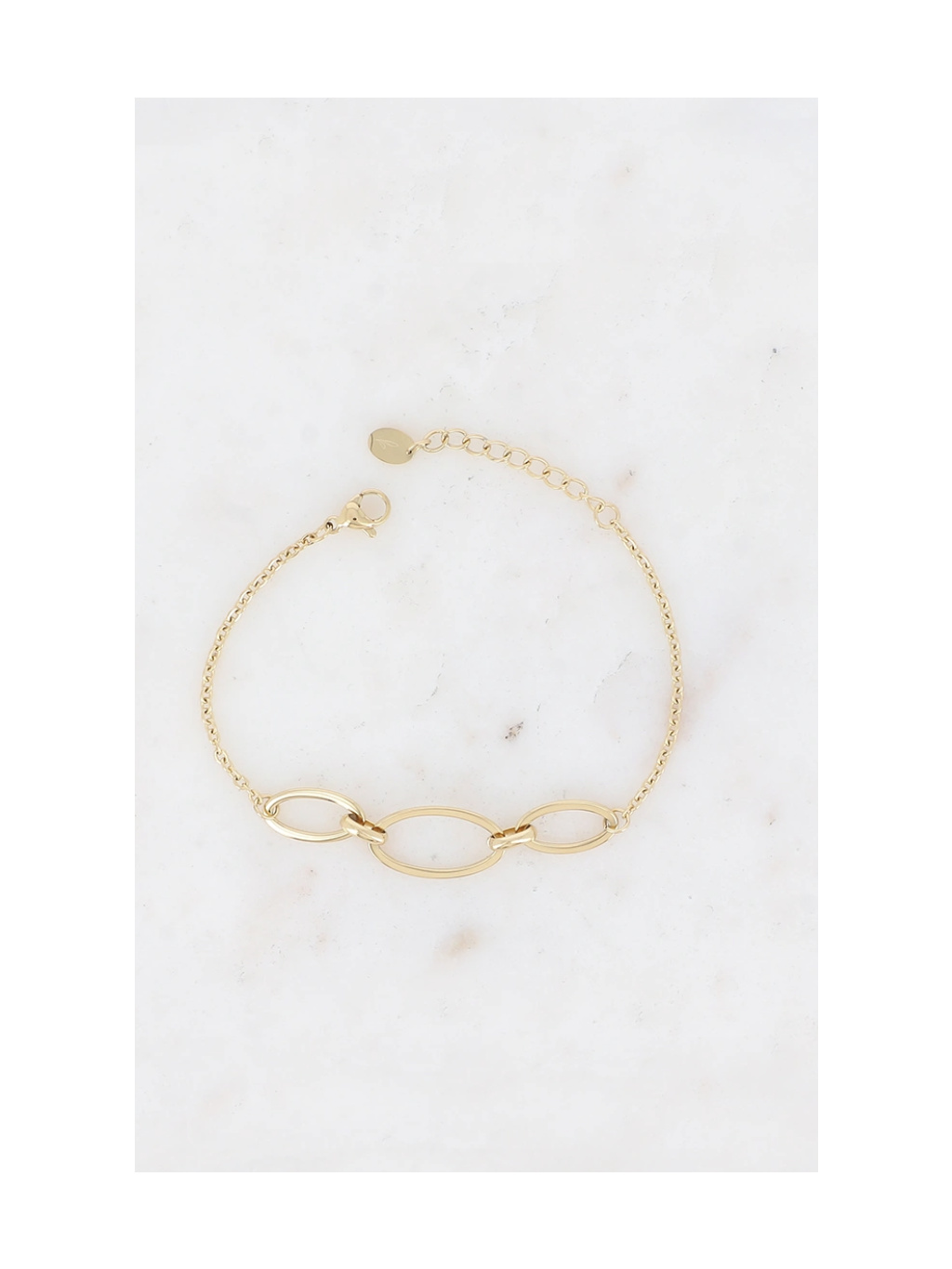 Elegantní náramek z nerezové oceli spojuje jemný řetízek s trojicí větších oválných oček, která tvoří rafinovaný středový detail. Díky jednoduchému designu a univerzálnímu zlatému tónu se hodí jak k dennímu nošení, tak k vrstvení s dalšími šperky.