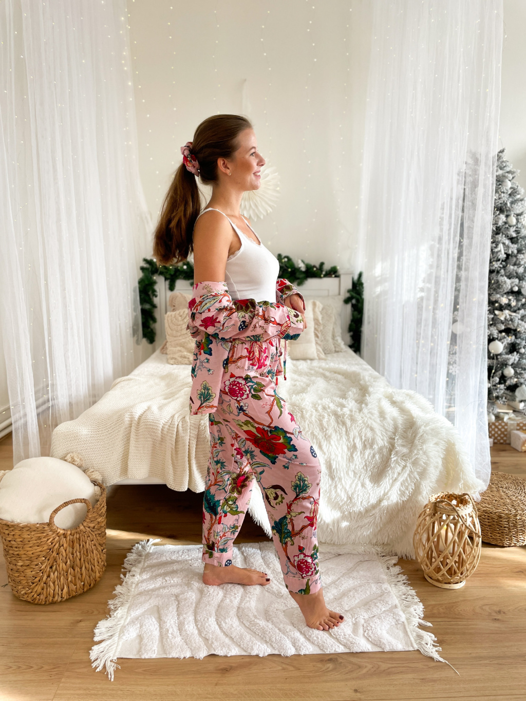 Jemné pohlazení je pyžamo stvořené pro ženy, které chtějí zářit i během noci. Jeho růžový odstín a vzor vás zahalí do jemné energie, která uklidňuje a povzbuzuje váš ženský půvab. 🌸