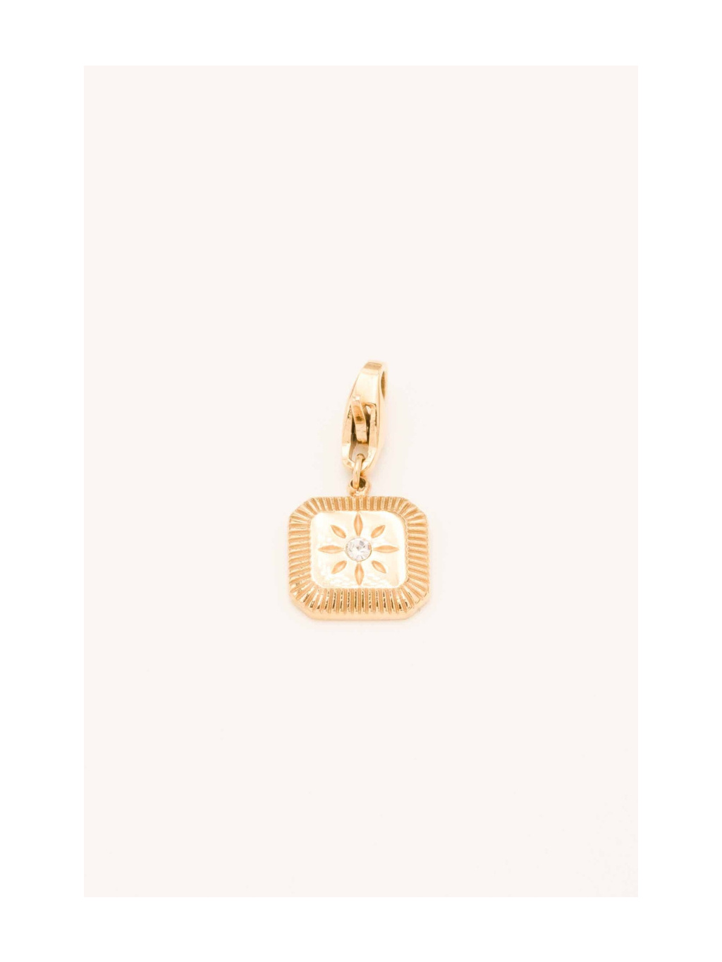 Přívěsek Záře – květ s jemně vyrytými okvětními lístky a zářícím krystalem. Symbol světla, růstu a krásy. Díky praktickému klipu se hodí ke všem náhrdelníkům i náramkům z kolekce momenTY. ✨🌸