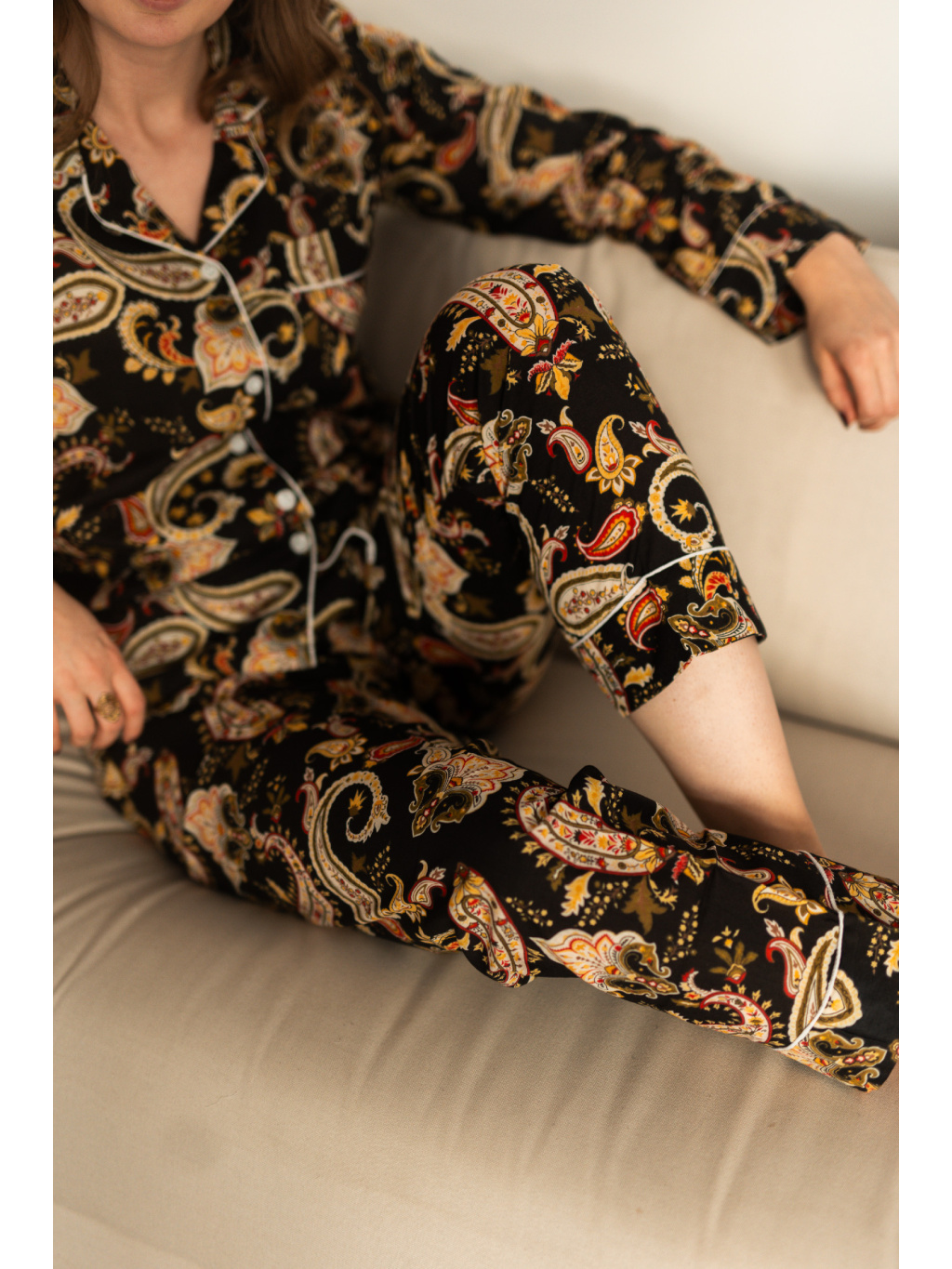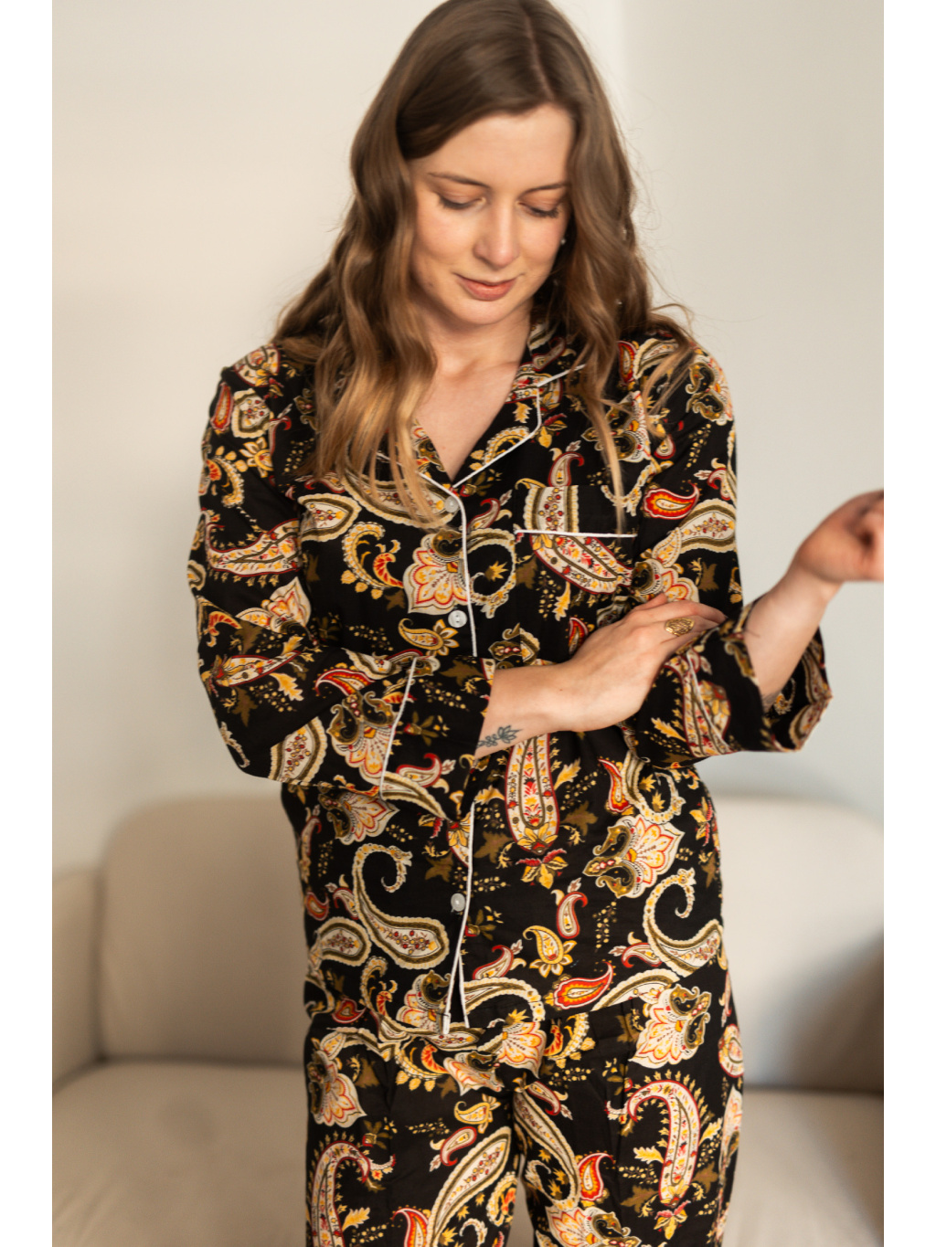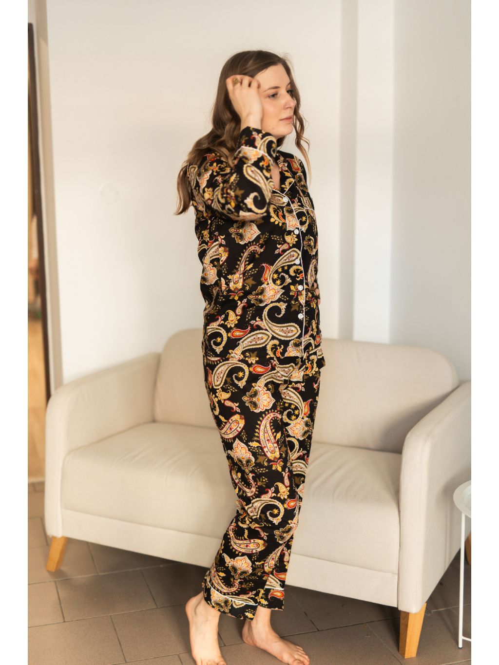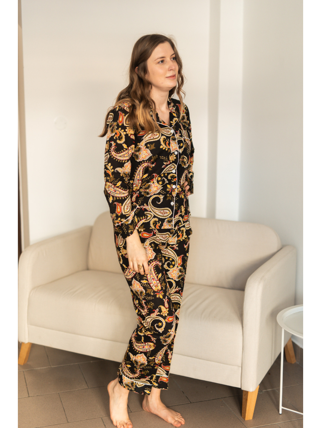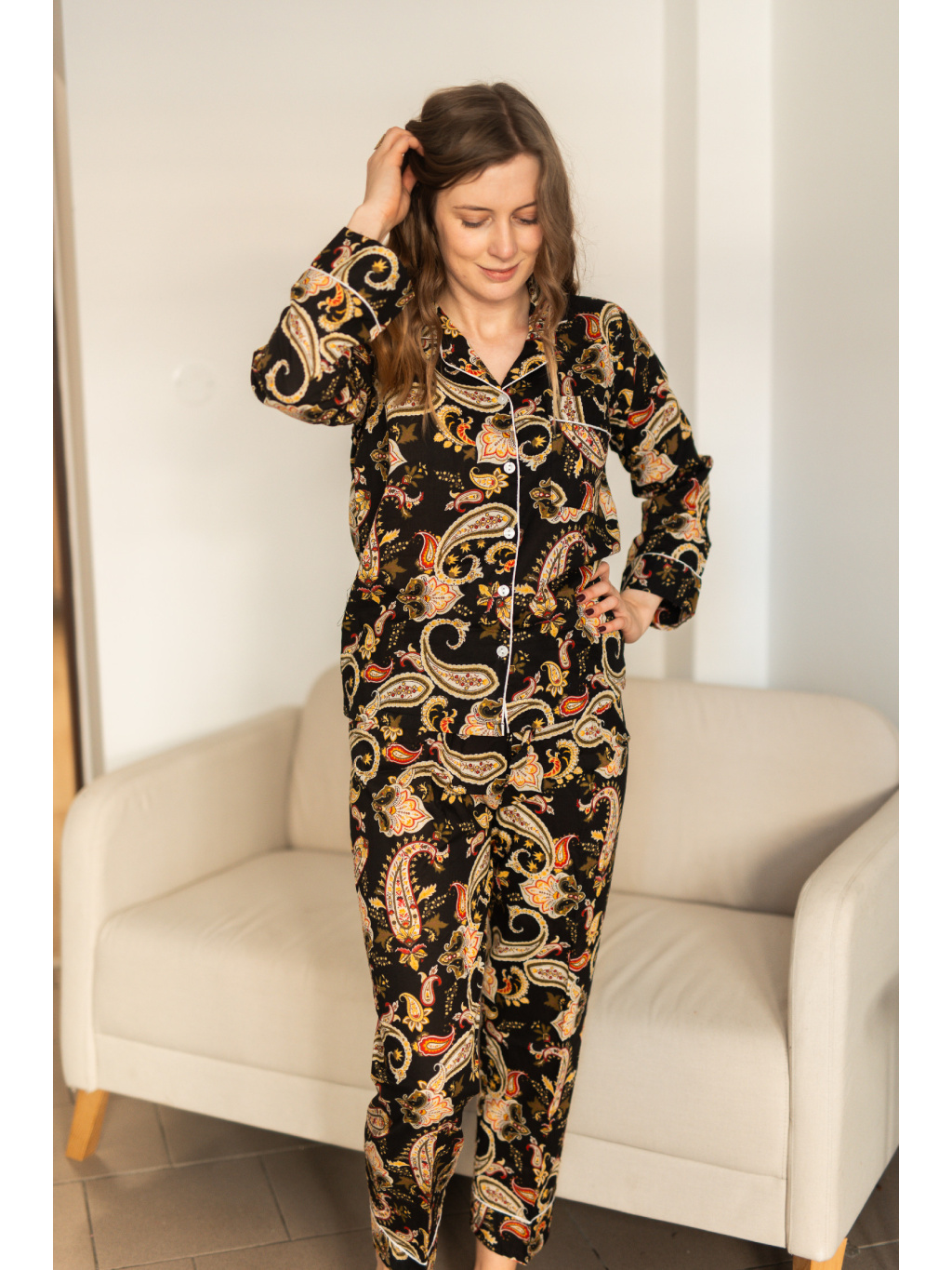 Ušito je ze 100% bavlny, která je prodyšná, měkká a příjemná na dotek. Díky volnému střihu s dlouhými rukávy a nohavicemi poskytuje maximální komfort při spánku i během odpočinku doma.