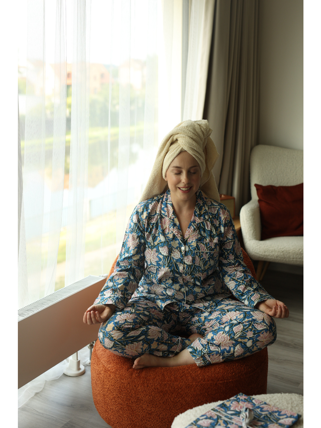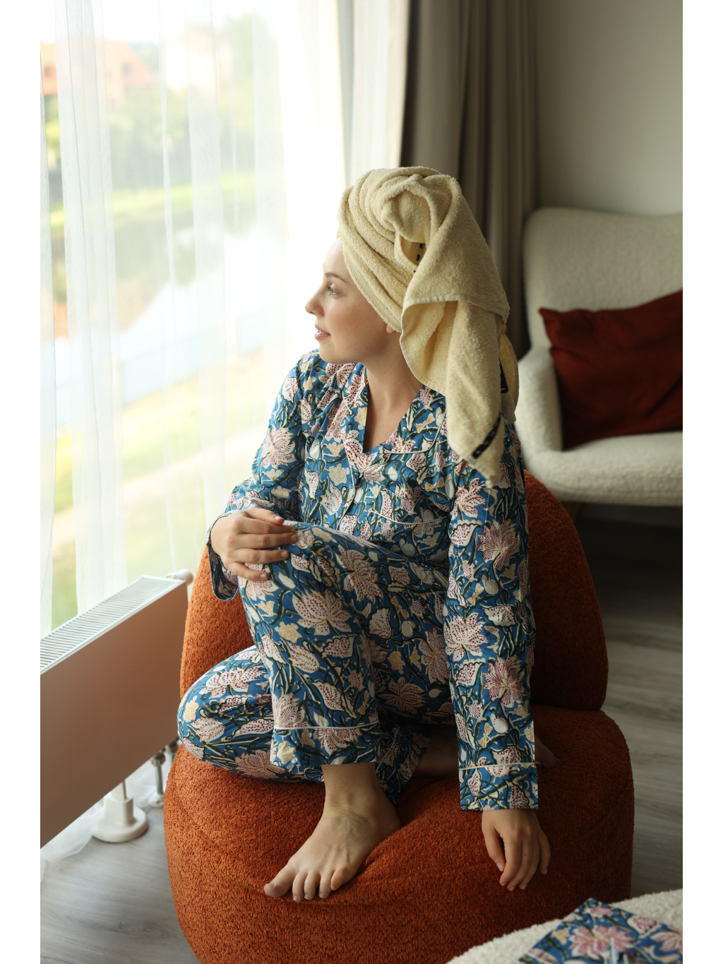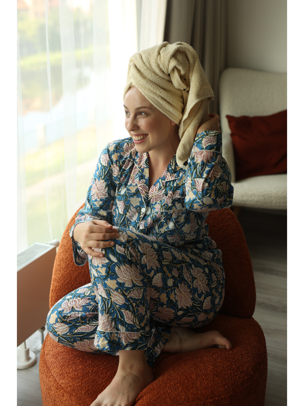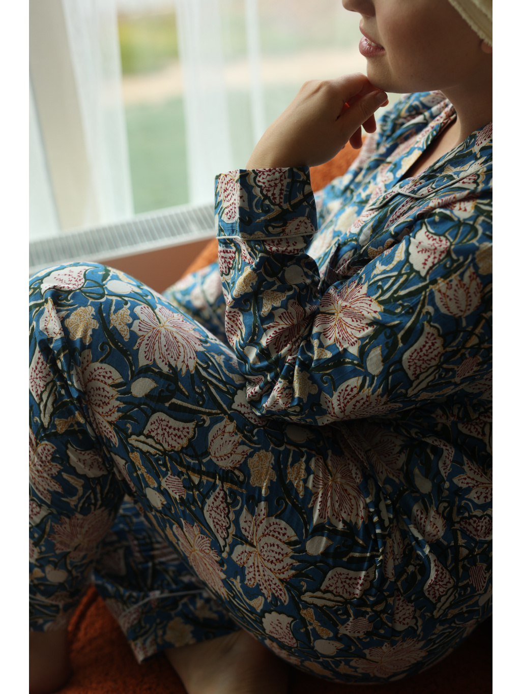 Pyžamo Dreamy z 100% bavlny – modré s výraznými květy, pohodlné a prodyšné. Ideální pro snový spánek i pohodové chvíle doma. 💙🌸