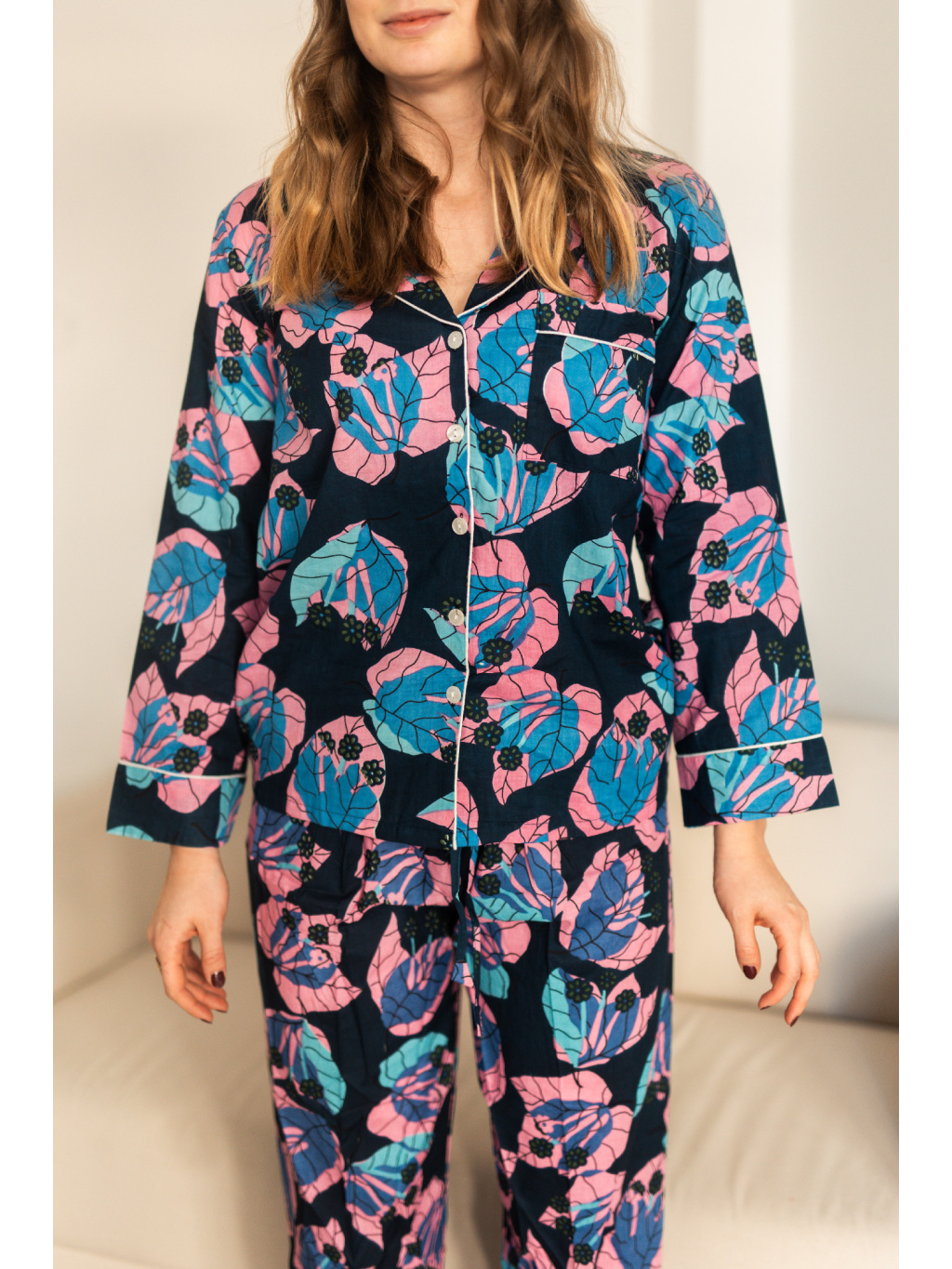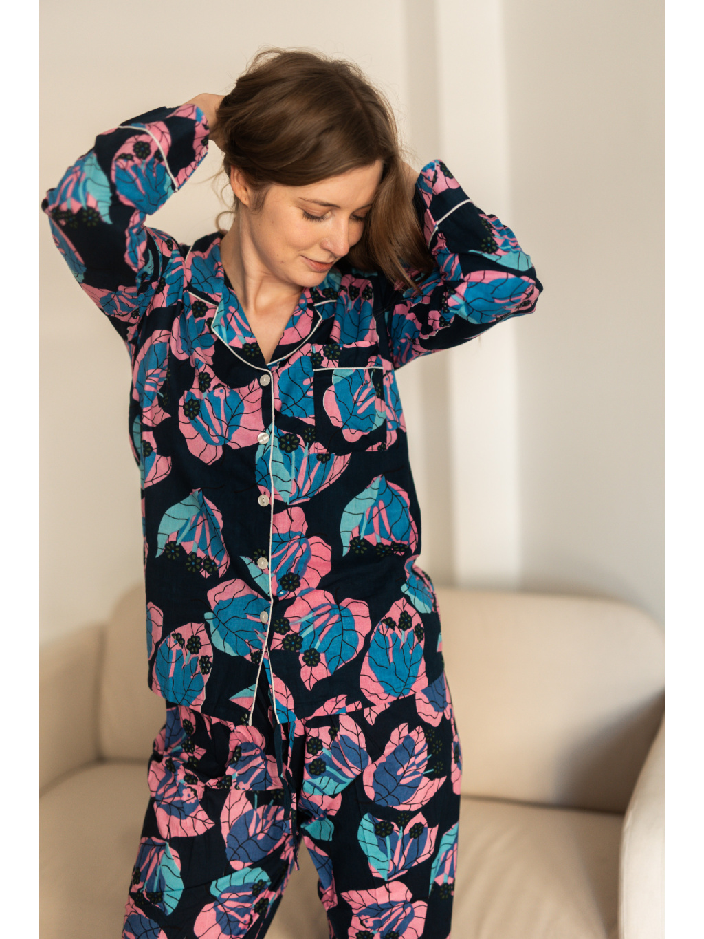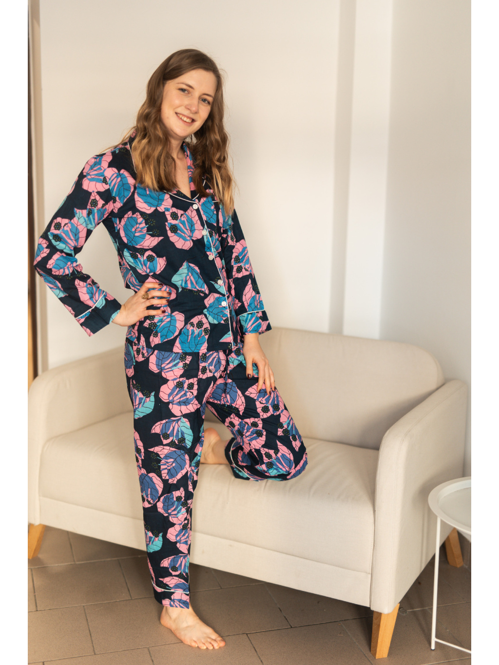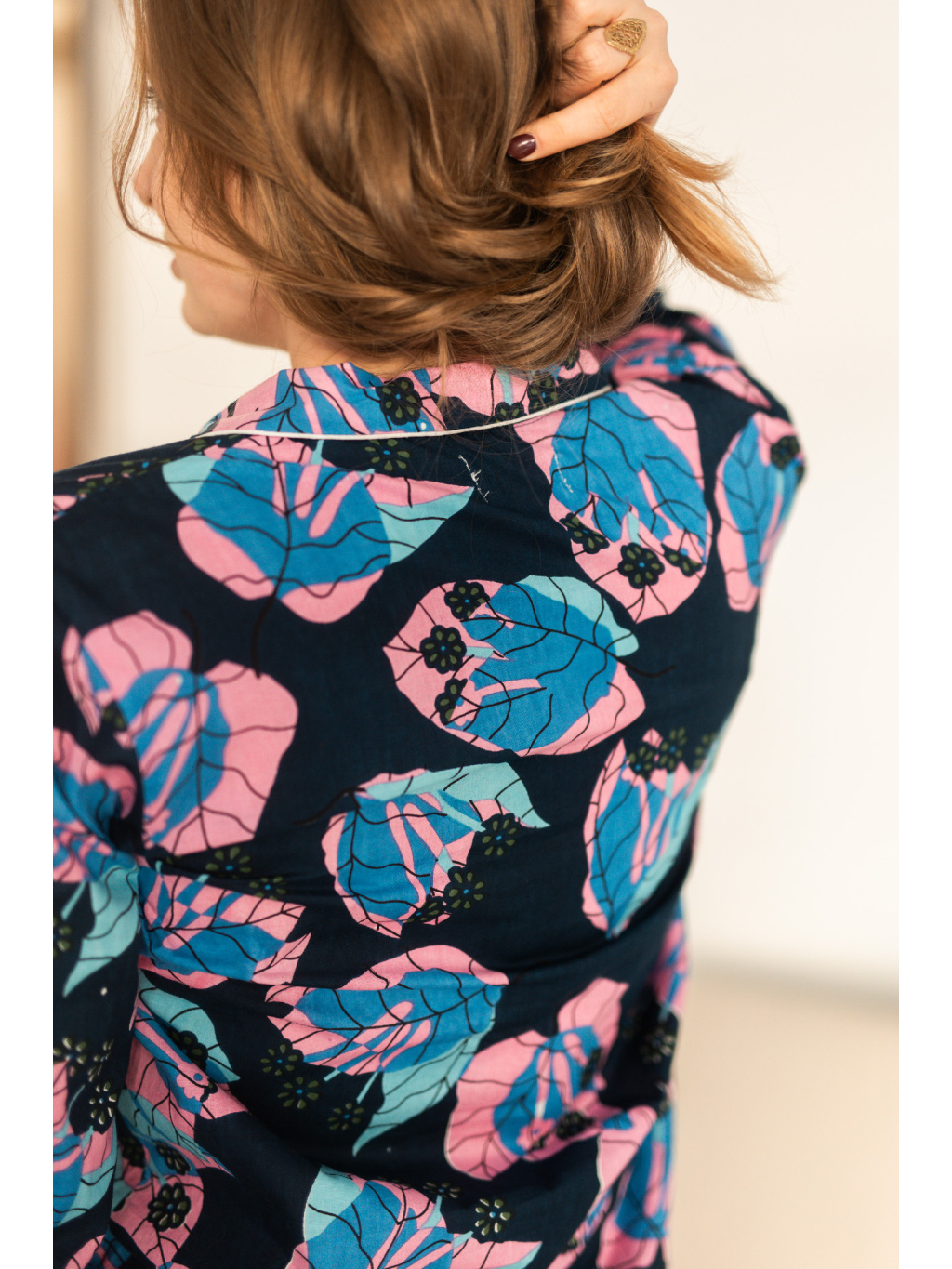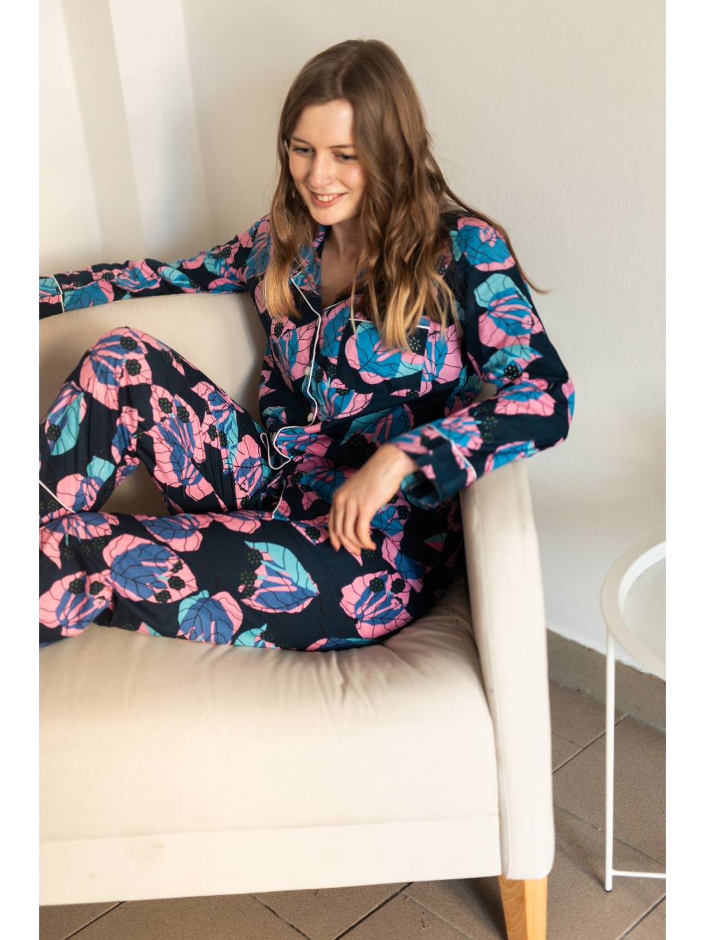 Pyžamo z kolekce Bohyním je vytvořeno pro chvíle, kdy chcete uniknout do světa snů. Výrazné květy na jemně modrém podkladu připomínají romantické zahrady a dodávají pyžamu hravost i ženský šarm.