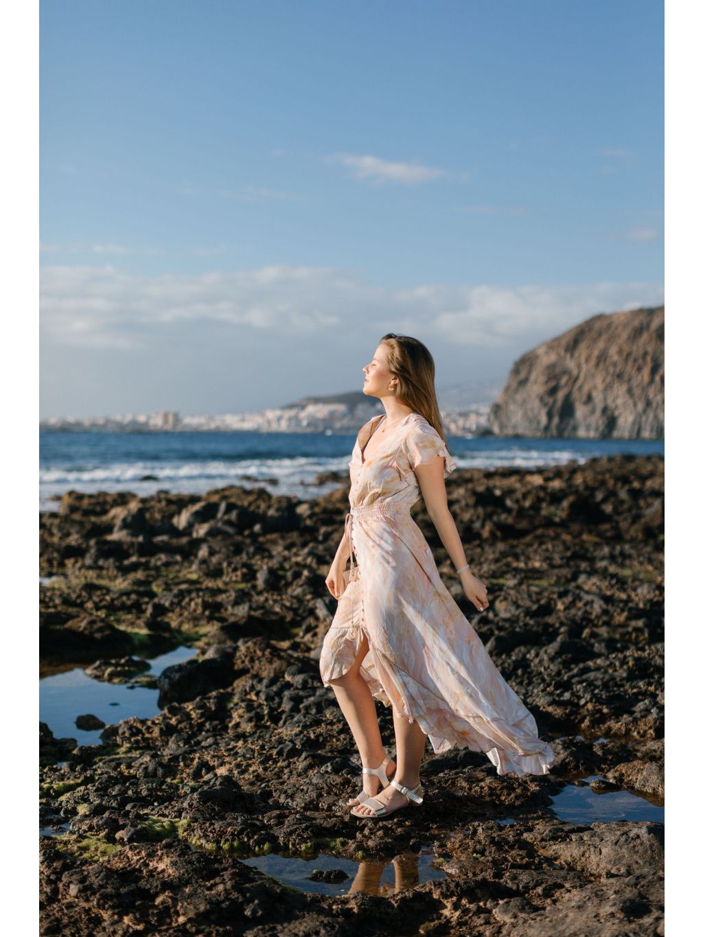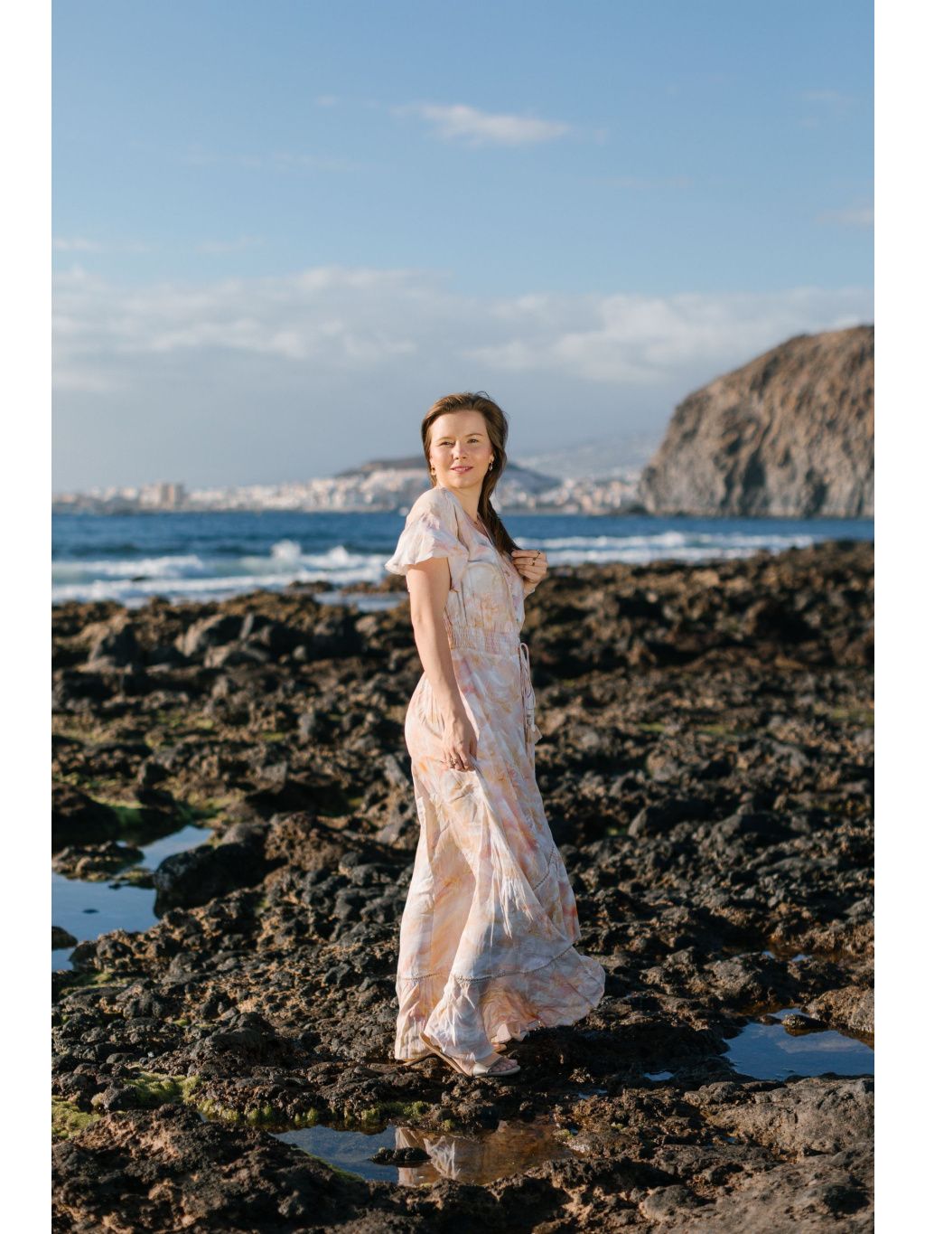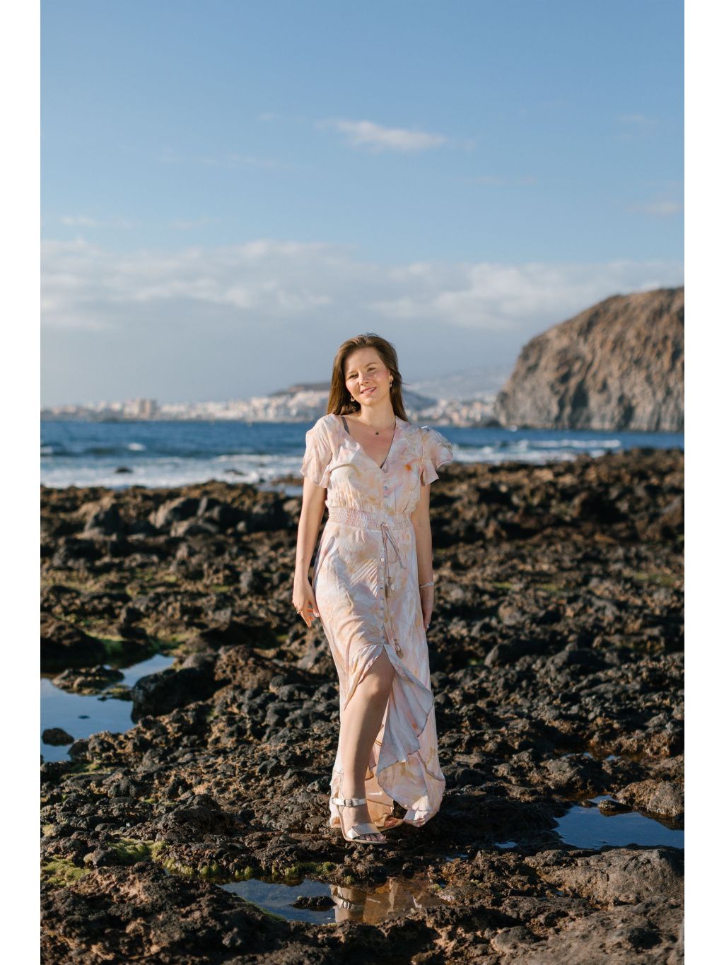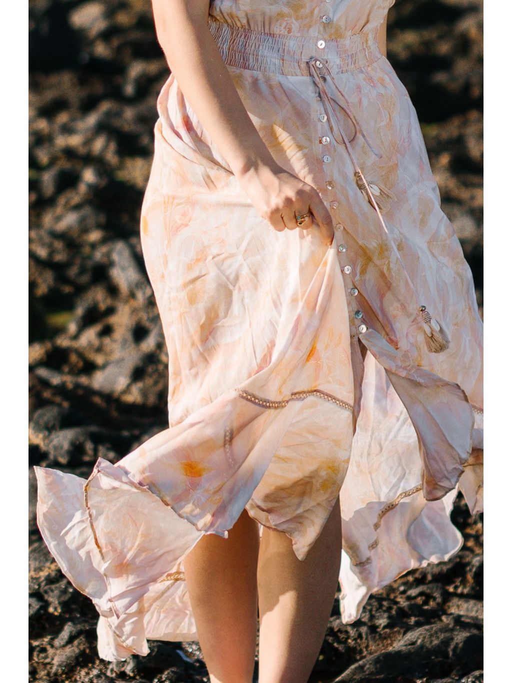 Šaty zaujmou ženským výstřihem do V, hravými motýlími rukávy a propínáním na knoflíčky. Pružný pas se přizpůsobí postavě a jemné šňůrky s bambulkami dodávají modelu stylový boho nádech.