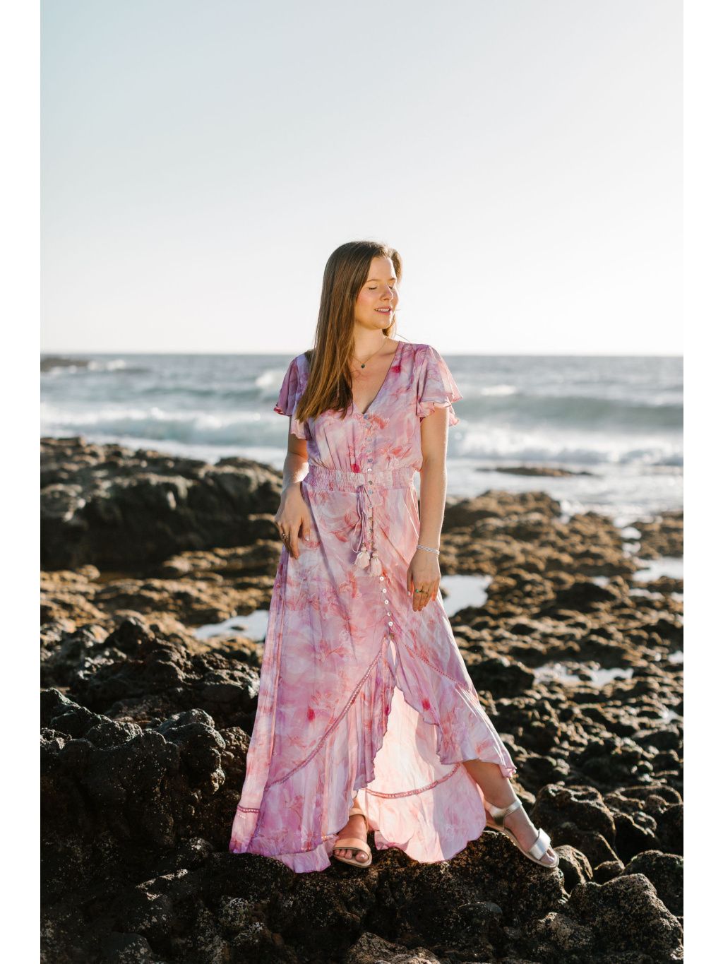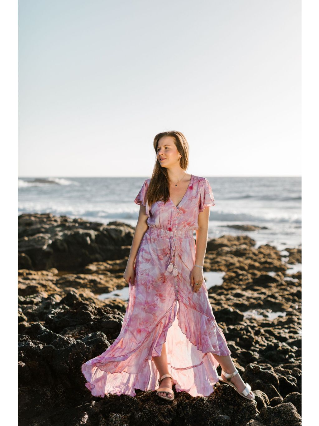 Šaty zaujmou ženským výstřihem do V, hravými motýlími rukávy a propínáním na knoflíčky. Pružný pas se přizpůsobí postavě a jemné šňůrky s bambulkami dodávají modelu stylový boho nádech.