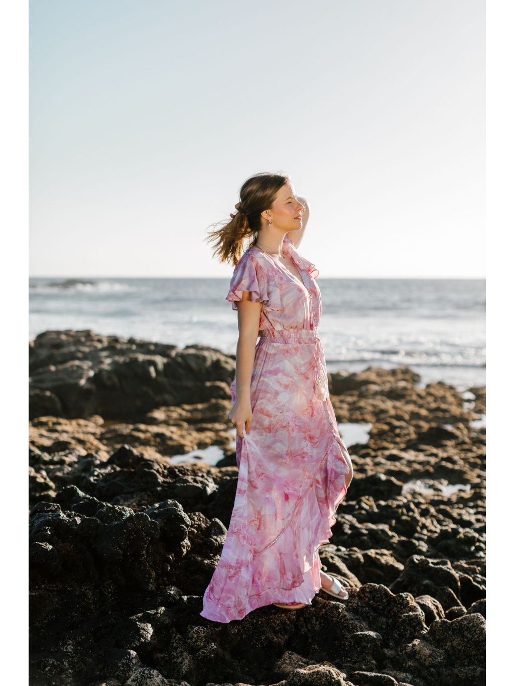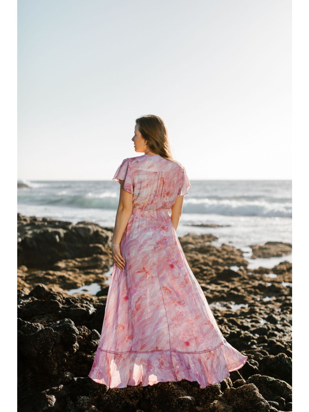 Romantické šaty z lehké viskózy s něžným květinovým vzorem v růžových tónech.
